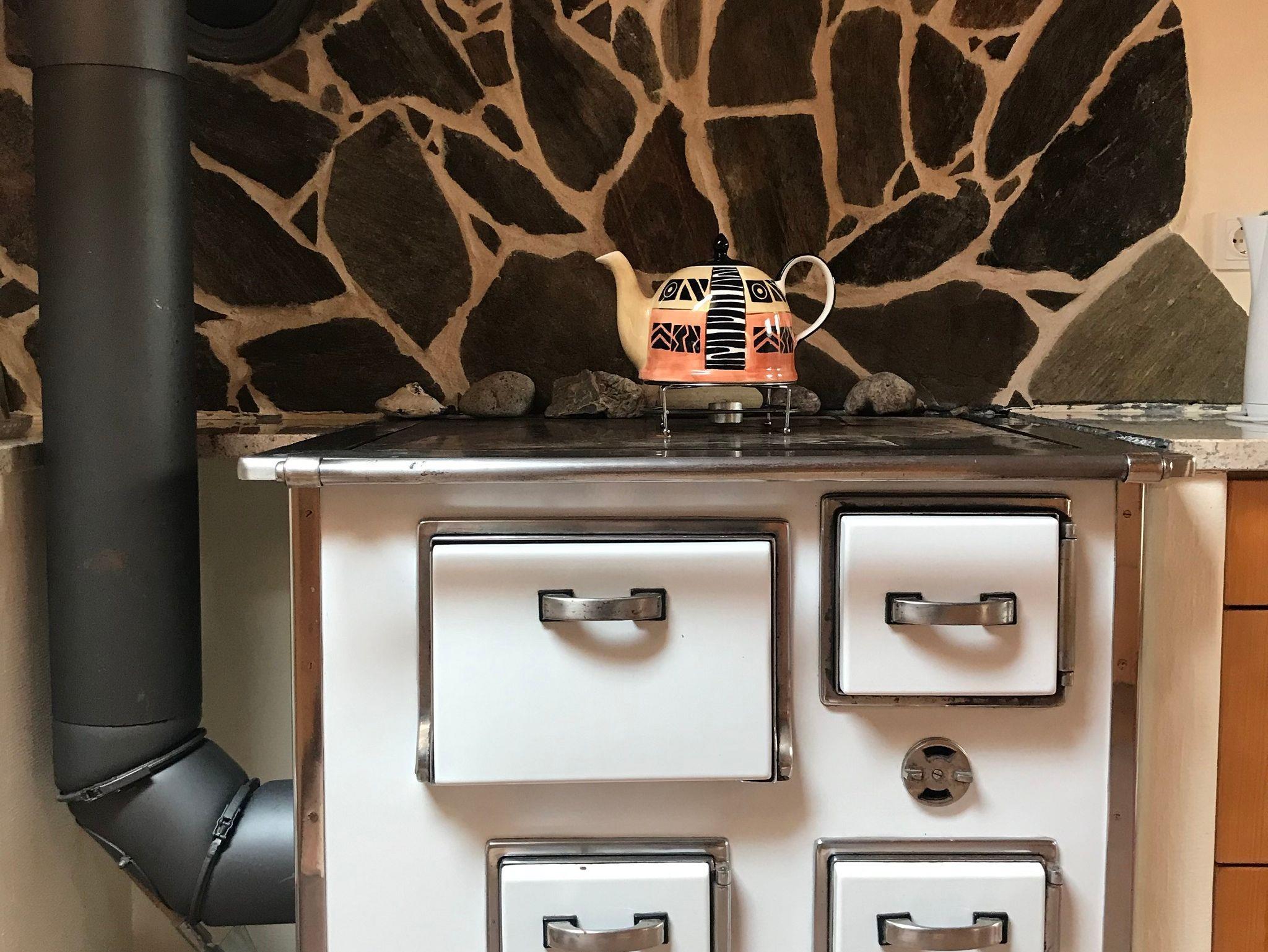Ein großer Esstisch bietet Platz für schöne gemeinsame Mahlzeiten. Die Küche bietet mit Kühlschrank, Geschirrspüler, Elektroherd und Spüle, zudem mit allem nötigen Geschirr ausgestattet, alle Möglichkeiten zur Selbstversorgung. Zusätzlich ist in der Küche ein Küchenherd, der mit Holz zu befeuern ist. Auf diesem kann, wie in alten Zeiten, gekocht werden. Die Ferienwohnung verfügt über ein modernes Zentralheizungssystem.