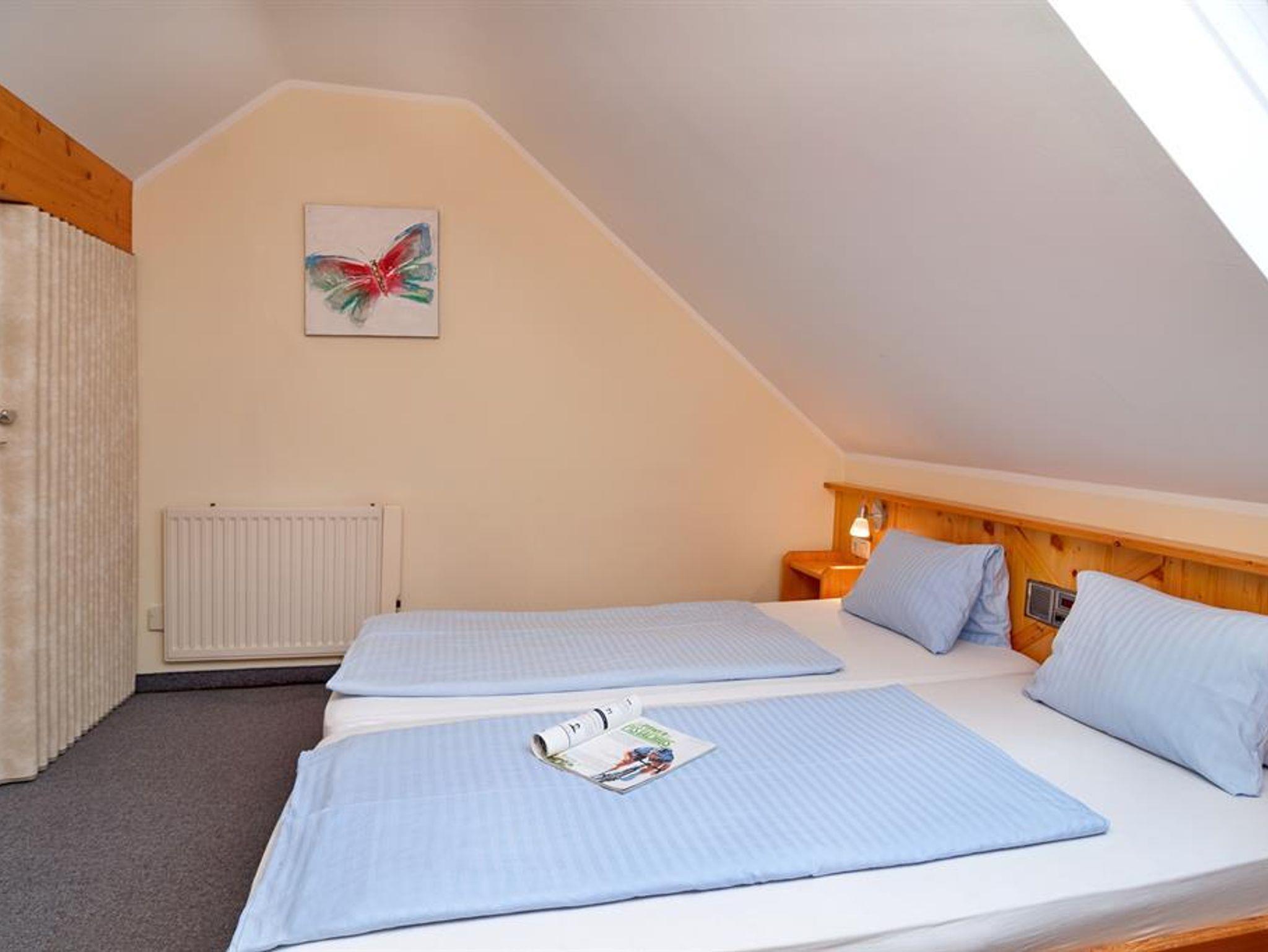 Appartement für 3-6 Personen mit 2 Schlafräumen (1 x mit Doppelbettzimmer, 1 Schlafnische im Vorraum mit Stockbetten, 2. TV-Gerät im Elternschlafzimmer, Wohn/Schlafraum mit Sitzgruppe und Couch, Essecke mit Kochnische und Kaffemaschine, Kühlschrank, Du/WC und Balkon, SAT-TV- und Telefon, ost-west-seitige Gartenlage, WLAN