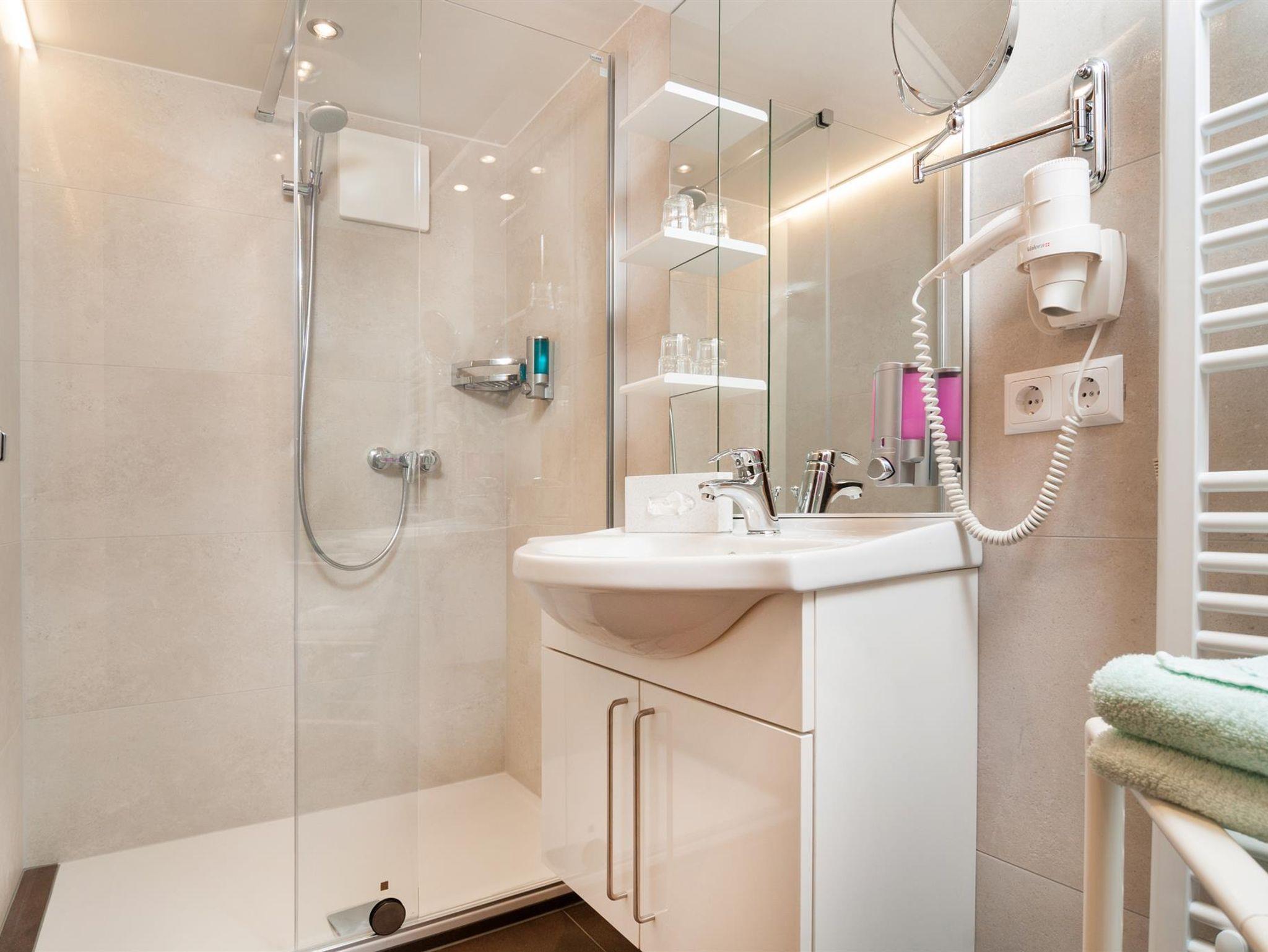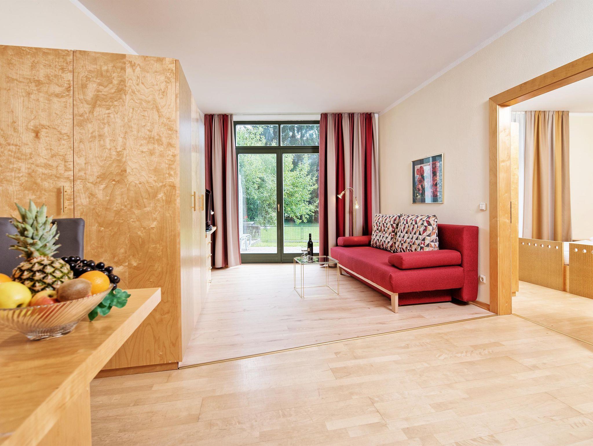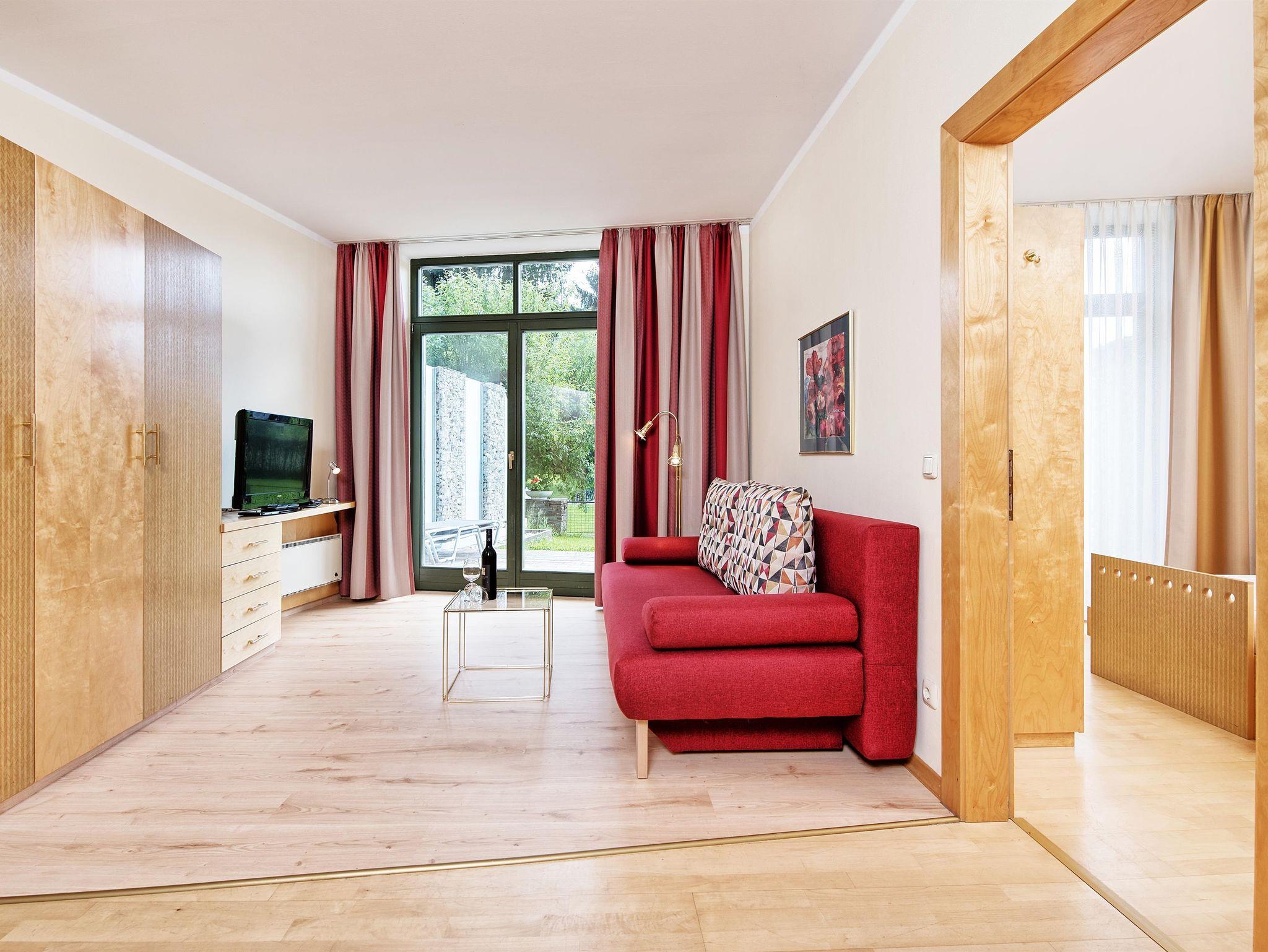 Suite für 2-4 Personen im Parterre, Doppelzimmer und Wohn/Schlafraum mit Bettcouch in ruhiger Südlage mit Terrasse, elegantes, stilvolles Ambiente, Bad/Du/WC (getrennt), Radio, FLAT-TV 81 cm, Kochecke mit Kühlschrank, Hotelsafe, Kaffeemaschine, Telefon, Haarfön,