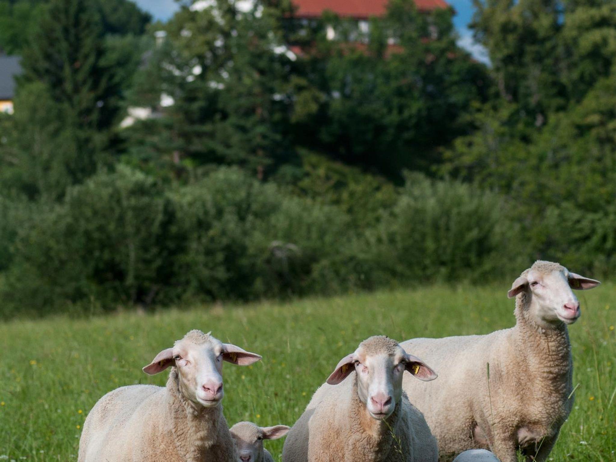 Willkommen an unserem Bio–Bauernhof mit Schafen und Kleintieren an einem Platz in der Sonne.