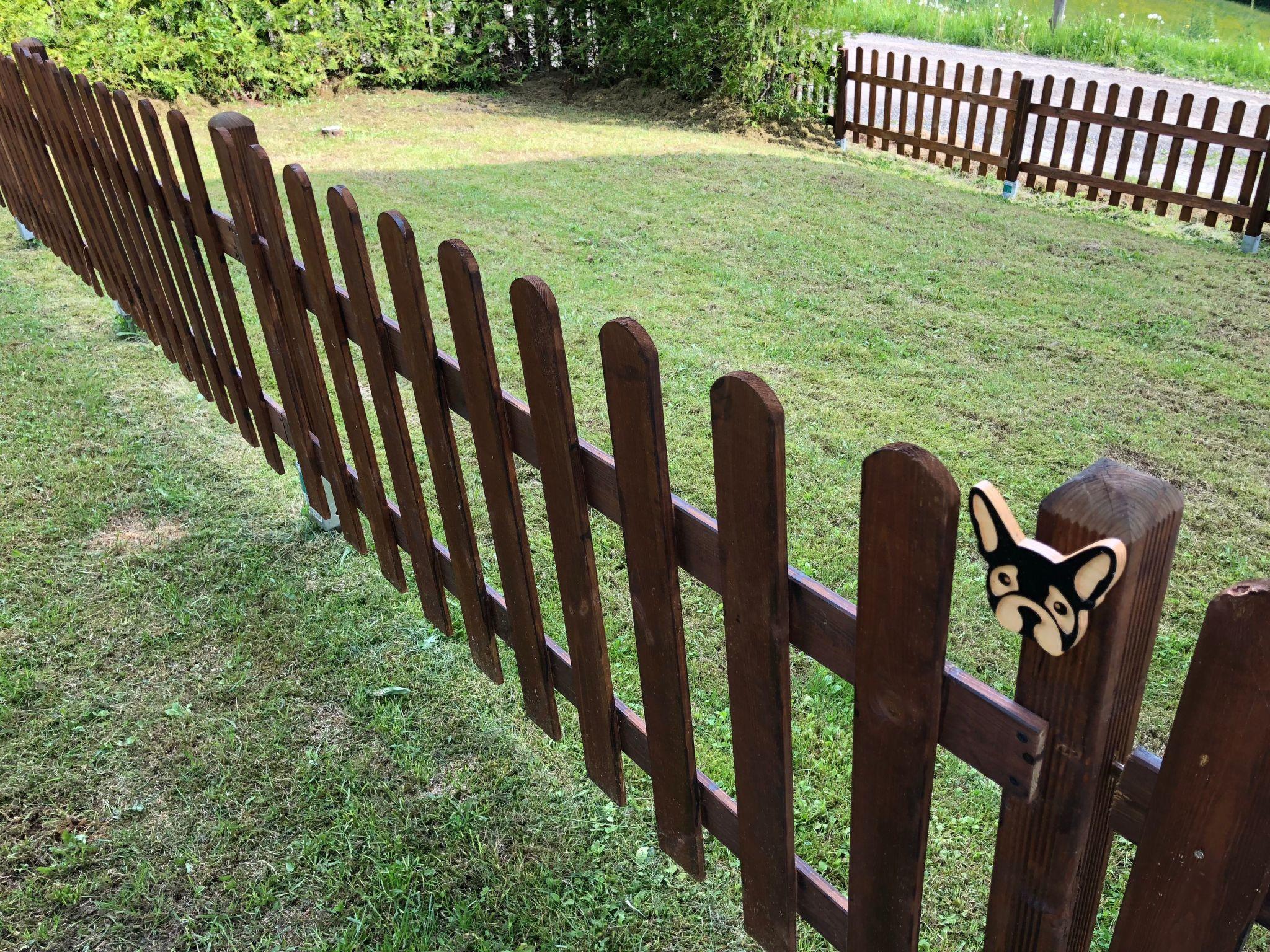 The spacious garden has a brick barbecue with a cosy seating area, a small playground with a swing and sandpit and a bench for parents, as well as a dog garden. Opposite the house entrance and below the house in front of the garage there is enough space for up to 5 (4 in winter) cars.