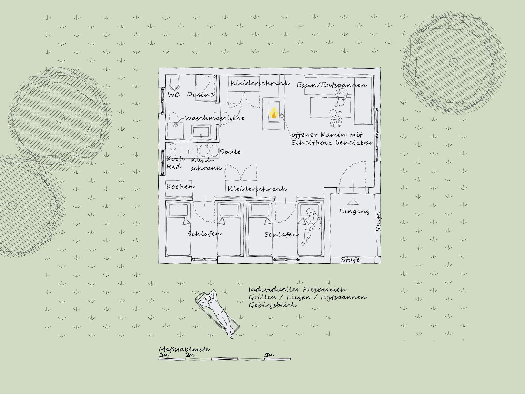 Auf der kleinen Terrasse am Eingangsbereich und auf der zum Haus gehörenden Liege- und Spielwiese können Sie sich mit ausreichend Abstand zum Nachbarn wohlfühlen und entspannen.
