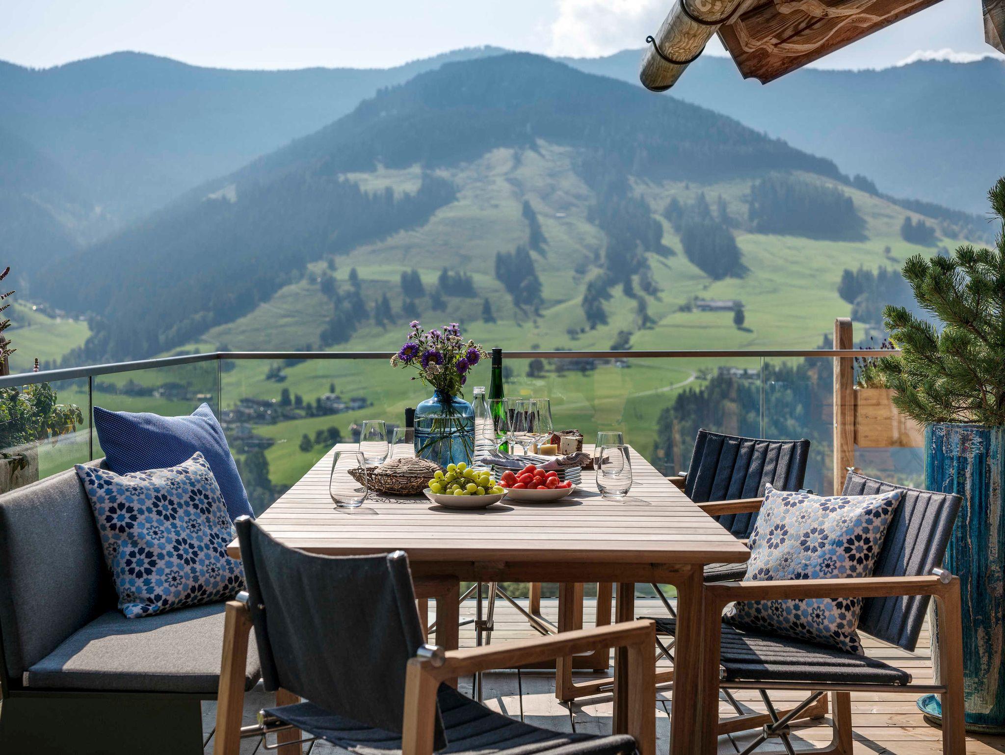 250 m2, die nur dem Sein geho¨ren. Der offene Wohnbereich mit Loft-Atmospha¨re und sichtbarem Dachgeba¨lk aus Altholz ist mit Mo¨biliar von Fritz Hansen wie dem Sofa Luna und dem Egg-Chair ausgestattet und geht leichtfu¨ßig in die Ku¨che mit Sitzgelegenheiten u¨ber. Die zwei Master Bedrooms sowie das zusa¨tzliche Schlafzimmer - alle mit SAMINA-Schlafsystem, eigenen Ba¨dern mit Wellness- Badewannen sowie Berg- und Talblick bis zu den Saalfeldener Steinbergen, verteilen sich fu¨r ungesto¨rte Privatspha¨re auf verschiedene Ebenen und bieten Zugang zu den großzu¨gigen Balkonen und Terrassen. Den Ho¨hepunkt offenbart ein eigener Wellnessbereich mit ganzja¨hrig beheiztem Infinity Outdoor-Pool fu¨r endlos entspannte Stunden mit Weitblick. Natu¨rliche Materialien, Eichenholzbo¨den und Zirbenholzdecken kombiniert mit großen Fensterfronten spenden viel Licht und lassen zur Ruhe kommen ? am besten vor dem knisternden Kamin.