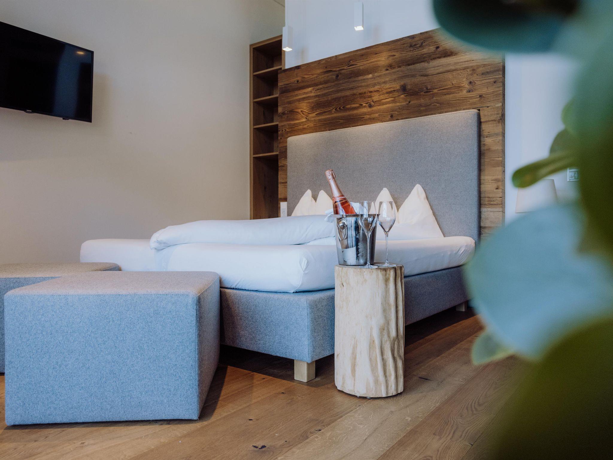 Nur in der PURADIES Premium Suite werden Gemütlichkeit, Gemeinsamkeit und Harmonie des Familienlebens sowie die wohlverdiente Zweisamkeit des Elternseins so vereint. Jeder Ihrer Liebsten findet in dem entspannenden und beruhigenden Ambiente seinen Rückzugsort. Auf der großen Terasse genießen Sie den atemberaubenden Blick auf die umliegende Bergwelt des PURADIES. Atmen Sie tief durch, entschleunigen Sie sich und saugen Sie die Energie in sich auf. Mit einem gemeinsamen Bad oder einer erfrischenden Erlebnisdusche lassen sich auch die letzten Spuren des Alltages wegspülen. Erleben Sie diese traumhafte Suite in Eiche und Altholz mit Wohn- und Schlafzimmer, Box-Spring-Bett, großem Badezimmer mit Badewanne, Dusche und großem Waschtisch.