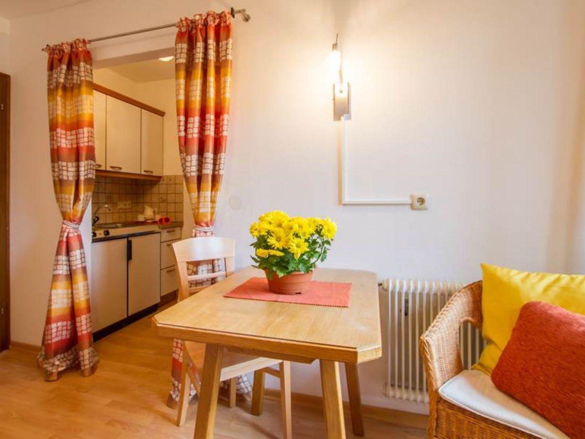 kleine Kochnische mit Kühlschrank, Balkon mit Blick auf die Steinberge.