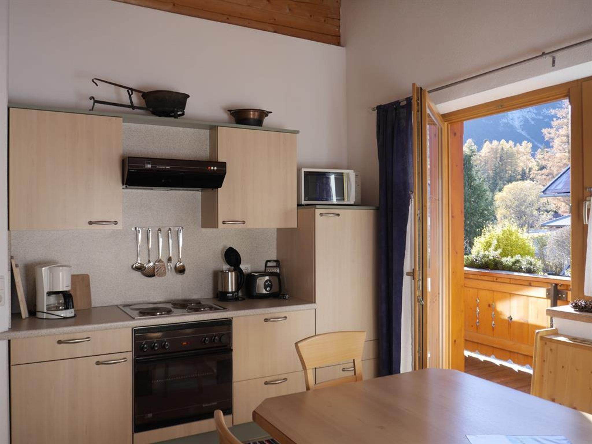 Küche: Tabs und Filterkaffeemaschine, Wasserkocher, Toaster, Geschirrspülmaschine, E-Herd mit Backofen, Zugang zum Balkon/Blick Hohe Munde, Gehrenspitze