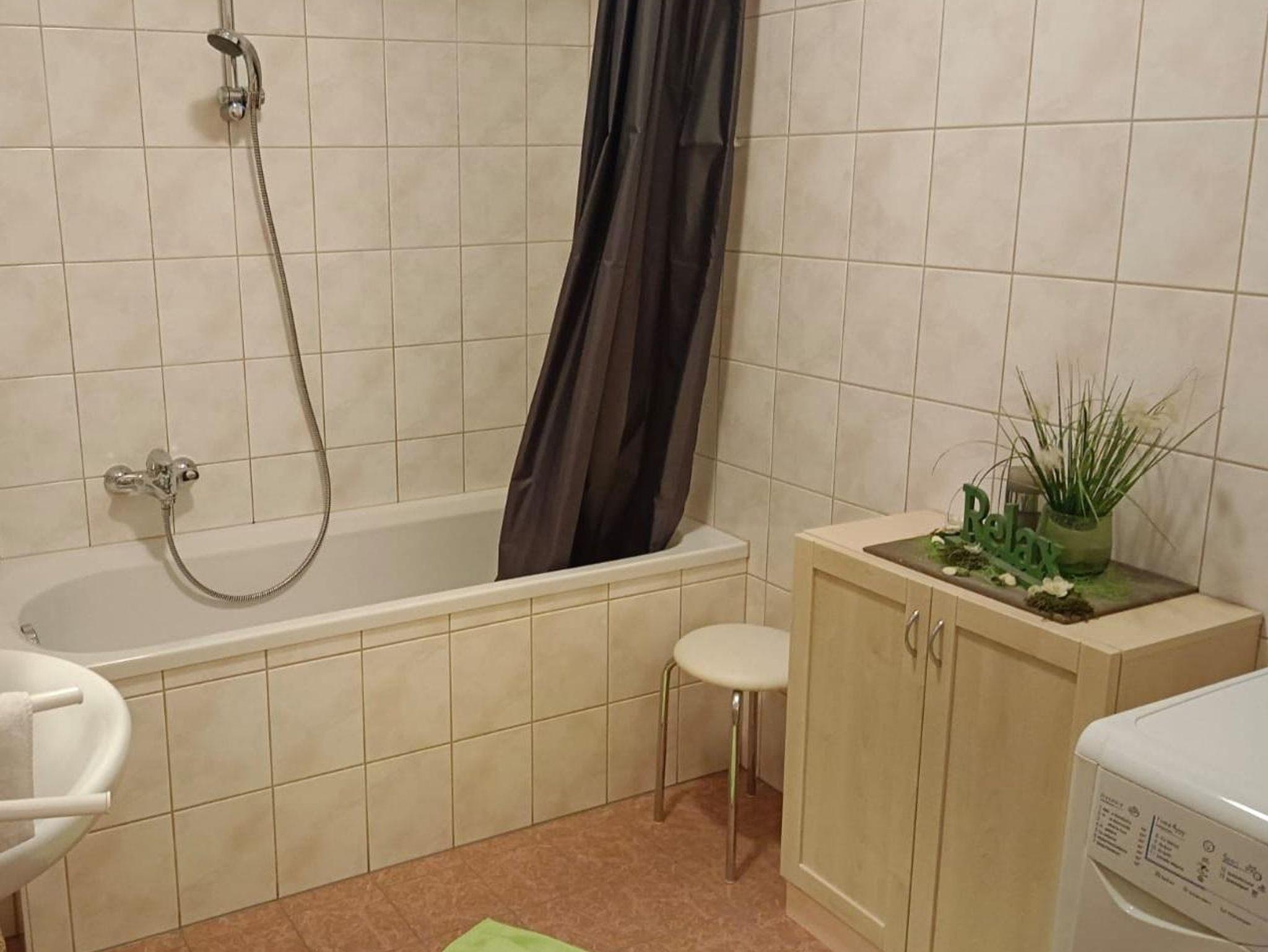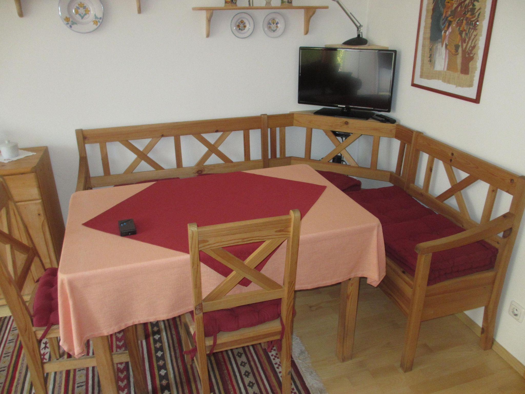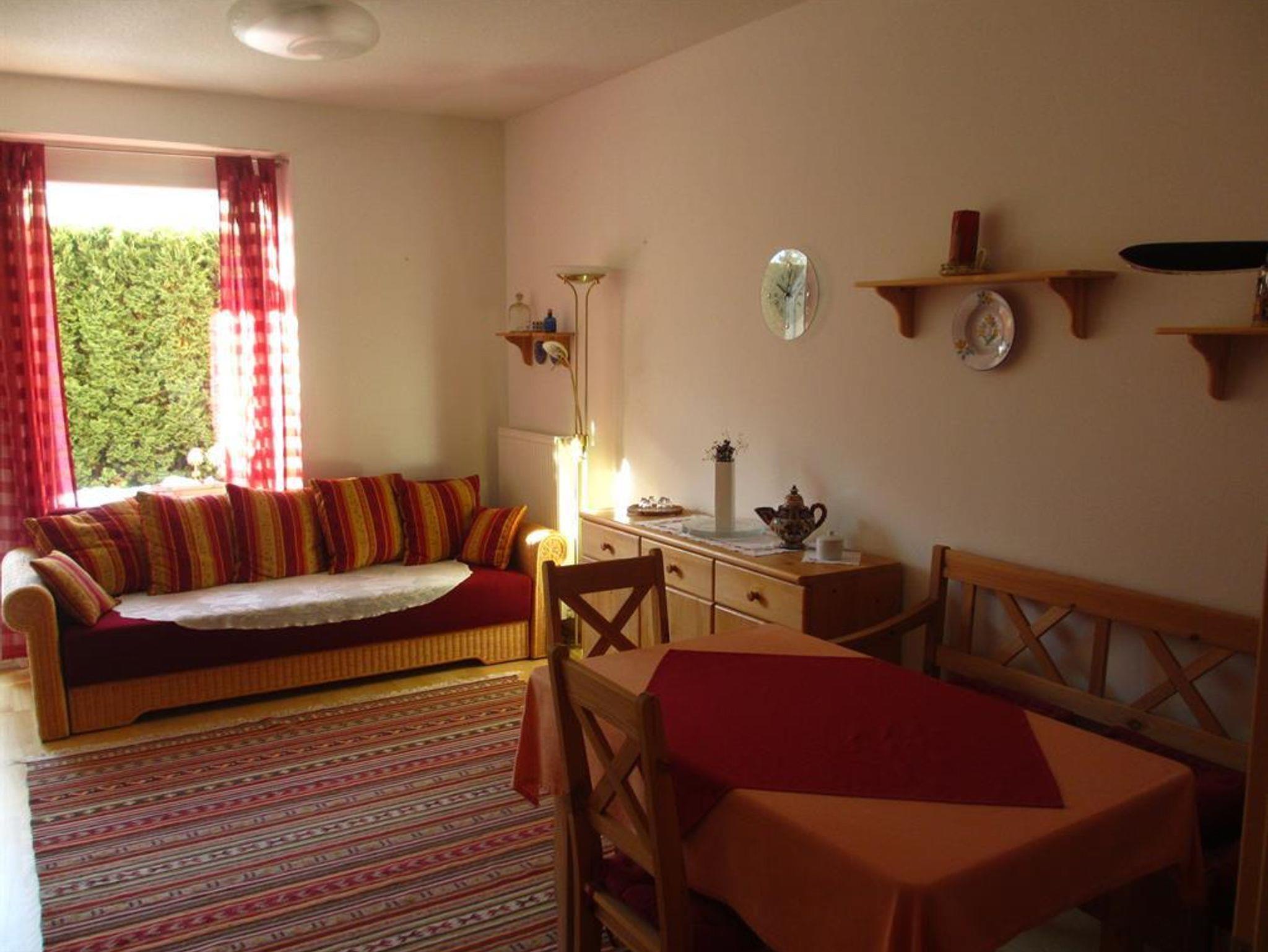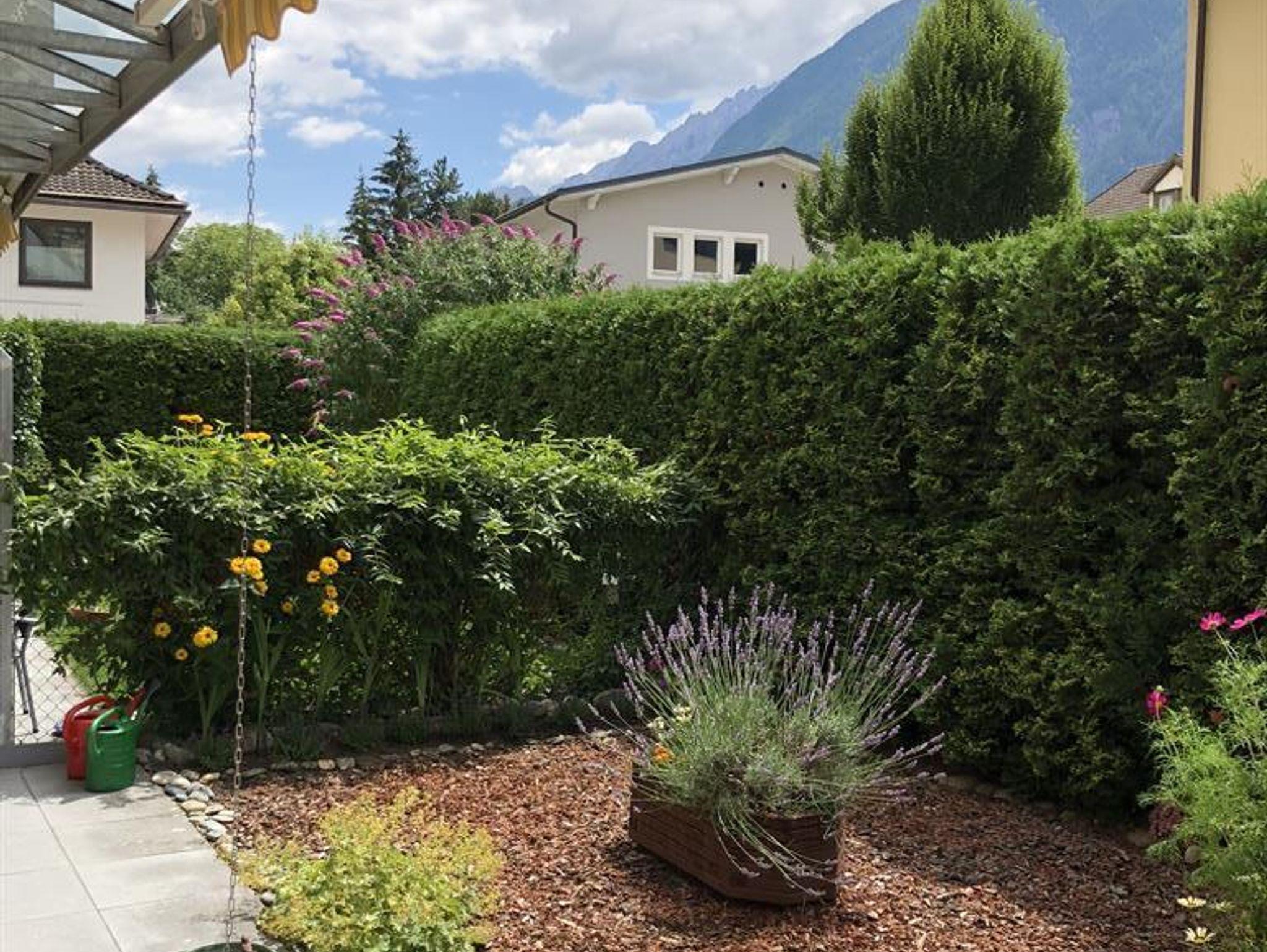 Bad mit Badewanne und Waschmaschine, WC separat, Schlafzimmer mit extralangem Boxspringbett (180 x 220) und Stockbett. Wohnküche mit ausziehbarer Couch, Südterrasse mit Garten, SAT-TV, Tiefgaragenplatz, Bettwäsche und Handtücher incl., WLAN