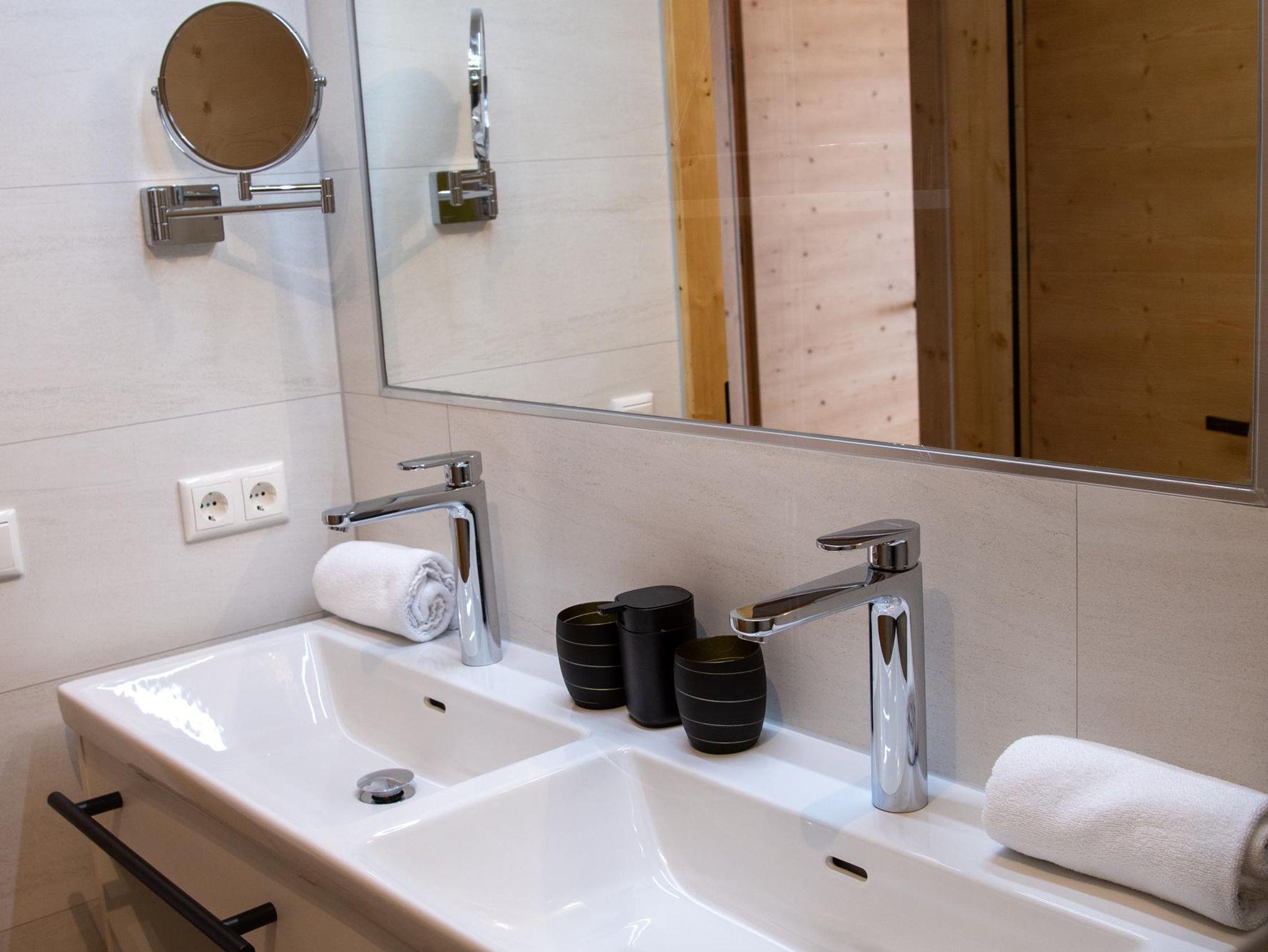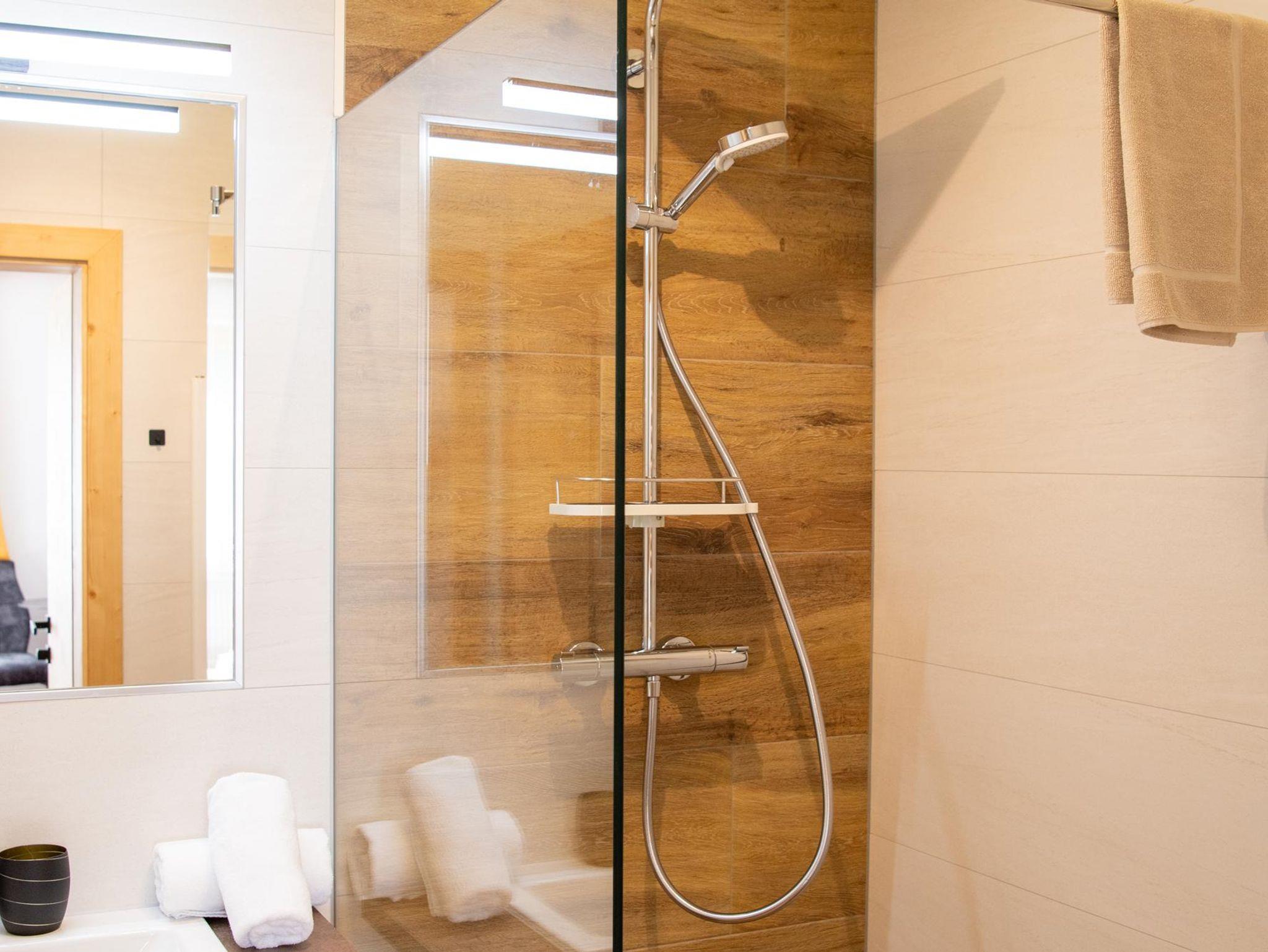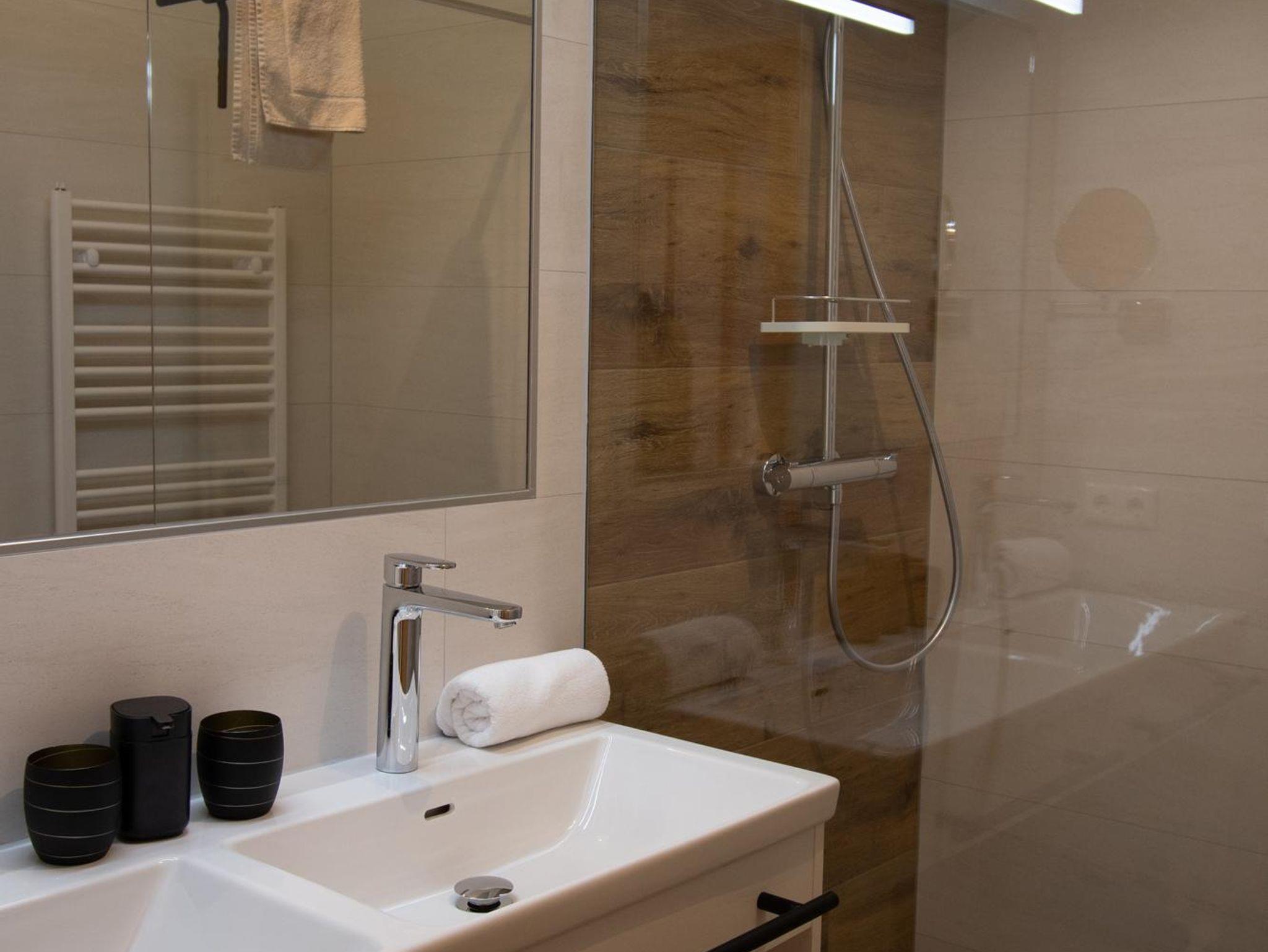 ein Schlafraum, eine Küche mit Sat-TV, ein Wohnraum mit Sat-TV, Dusche/WC getrennt, Doppelwaschbeckenk, Föhn, Kosmetikspiegel, Abstellraum und Balkon