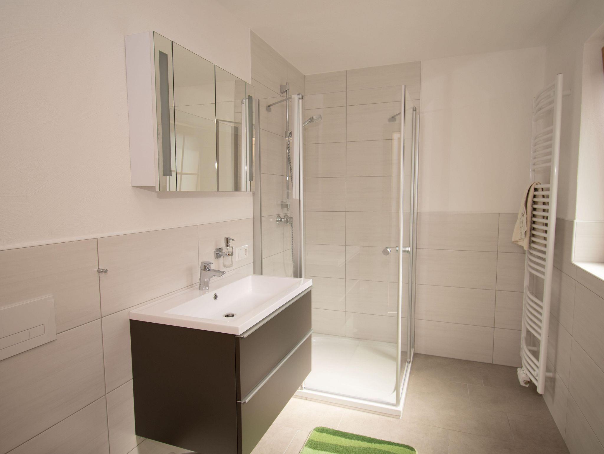 Geräumiges Badezimmer Das geräumige, neu errichtete Badezimmer umfasst Dusche, WC, Waschbecken und Föhn. Jeder Gast erhält kostenlose Handtücher. So kann man sich nach einer Wanderung oder einem Tag auf der Skipiste bestens erfrischen und wohlfühlen.