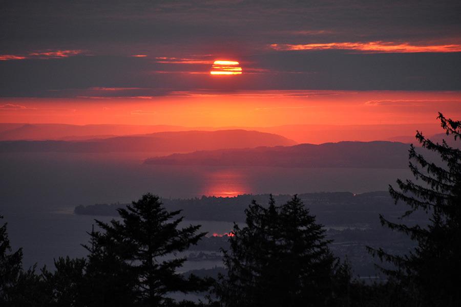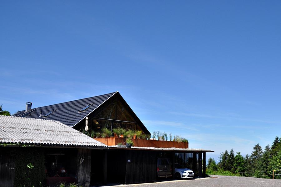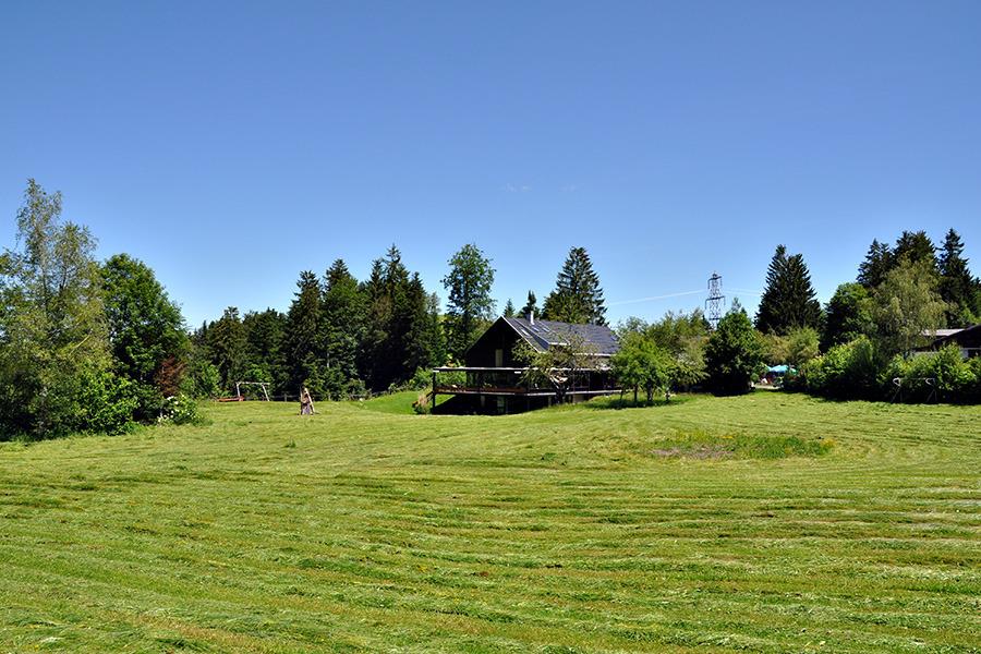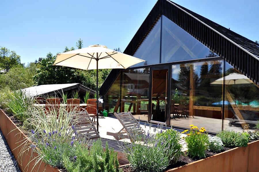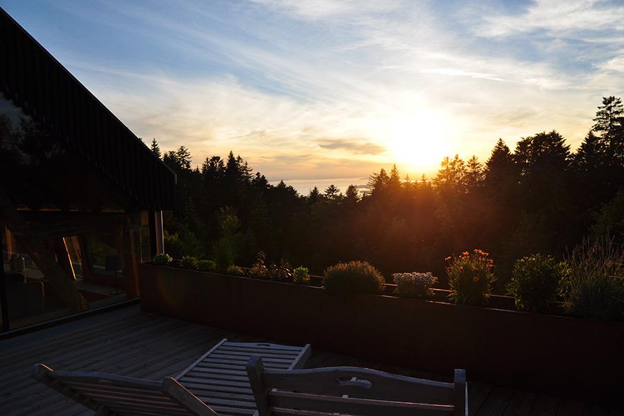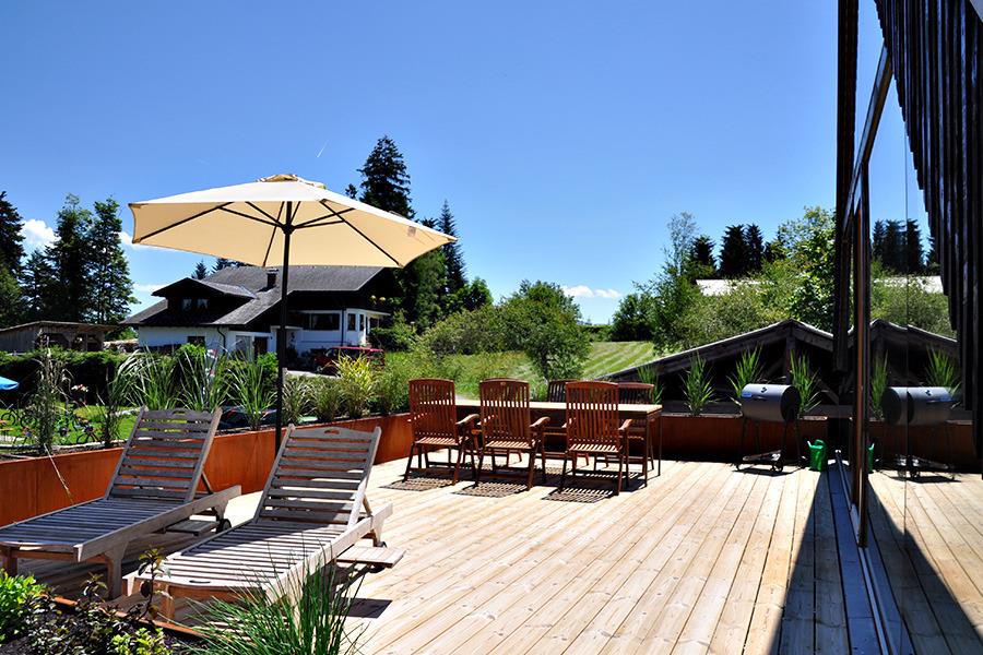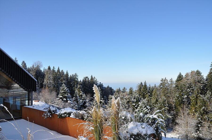 Auf der Großen, mit Pflanzen umsäumten Terrasse können sie den ganzen Tag einen wunderschönen Blick in die umliegende Natur mit viel Grün und Bergen, sowie atemberaubende Sonnenuntergänge über dem Bodensee erleben. Die Terrasse ist mit einem Holzgrill, einer großen, automatischen Markise sowie Sitz- und Liegemöglichkeiten ausgestattet.