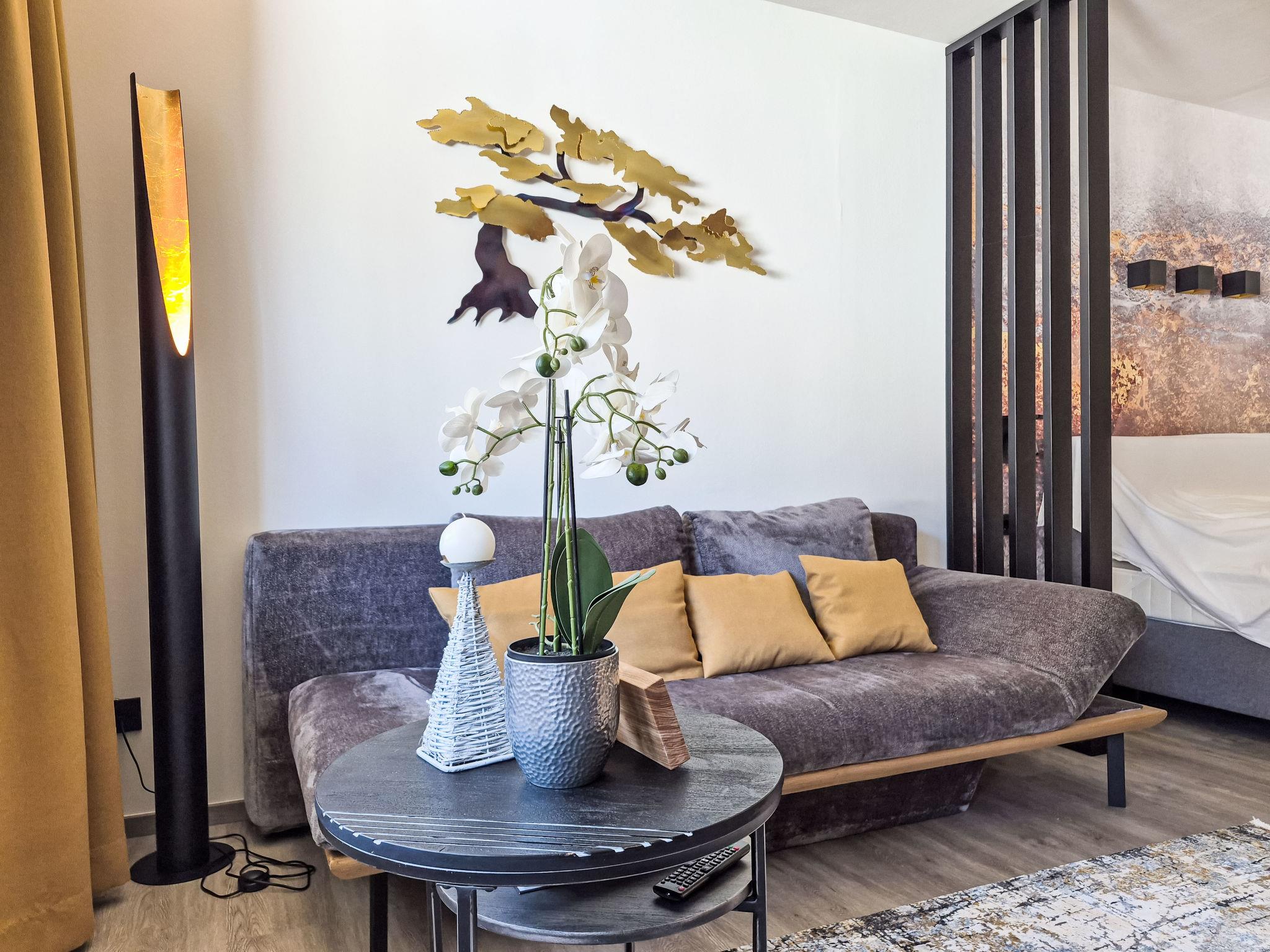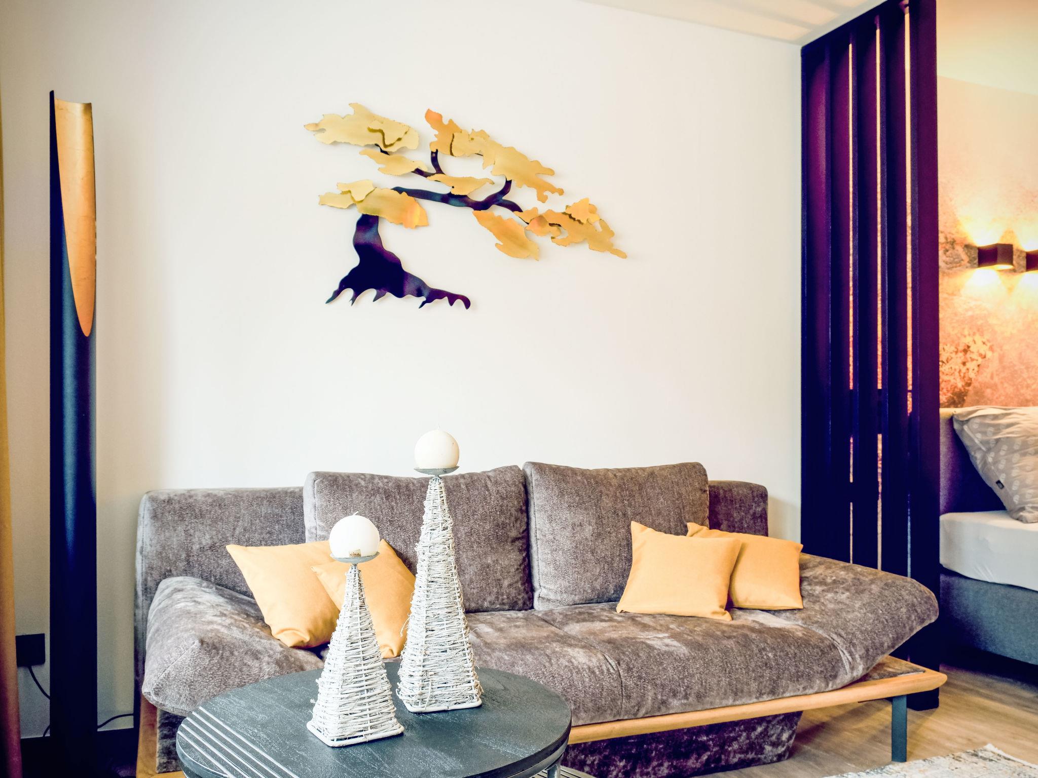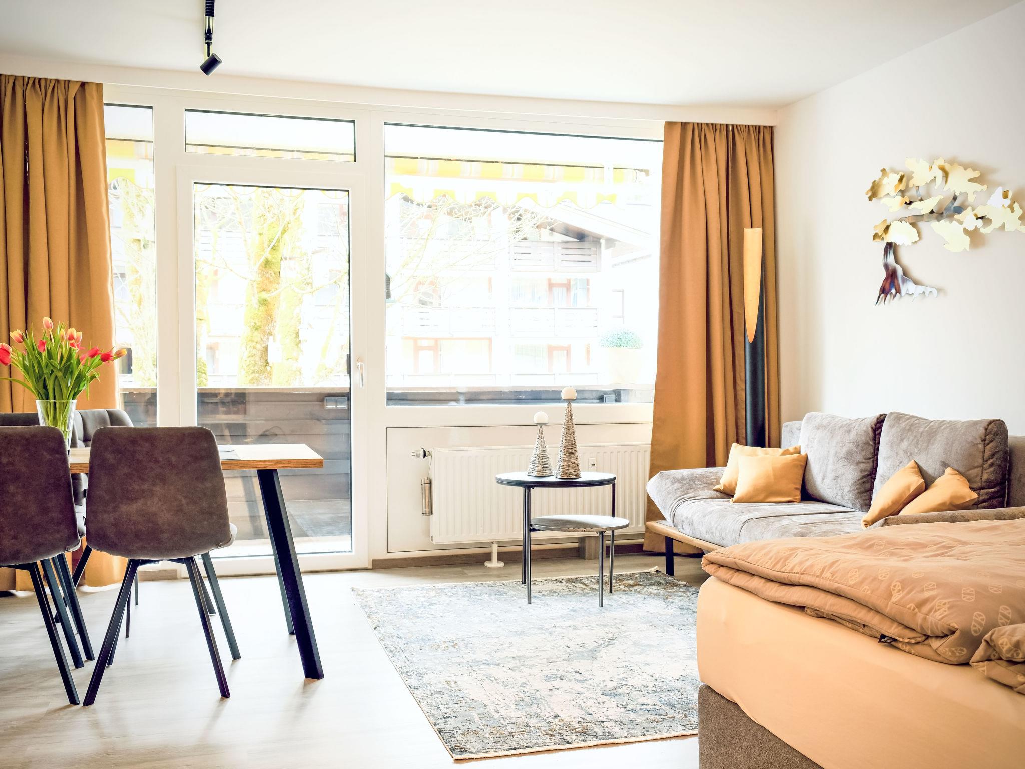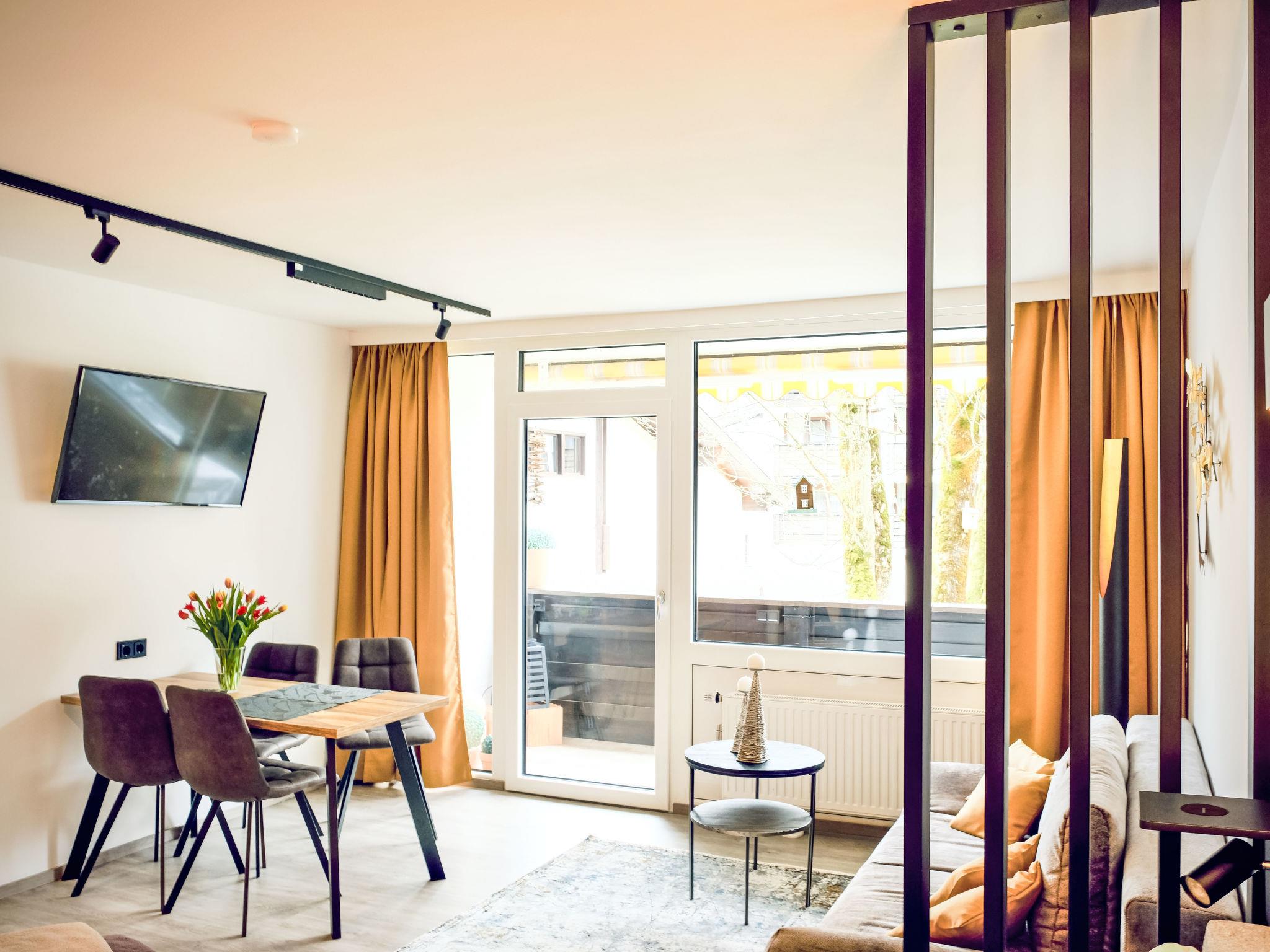 "Zum Goldenen Baum", 1-room apartment 40 m2. Modern and tasteful furnishings: living/sleeping room with 1 sofabed, 1 double bed, dining table and TV. Kitchenette (oven, dishwasher, 4 ceramic glass hob hotplates, kettle, freezer, electric coffee machine). Shower/WC. Heating. Parquet floors. Balcony 7 m2. Balcony furniture. Very beautiful view of the mountains. Facilities: Internet (WiFi, free). Please note: non-smokers only. Smoke alarm, fire extinguisher. A charmingly renovated and very well-maintained apartment with great attention to detail.