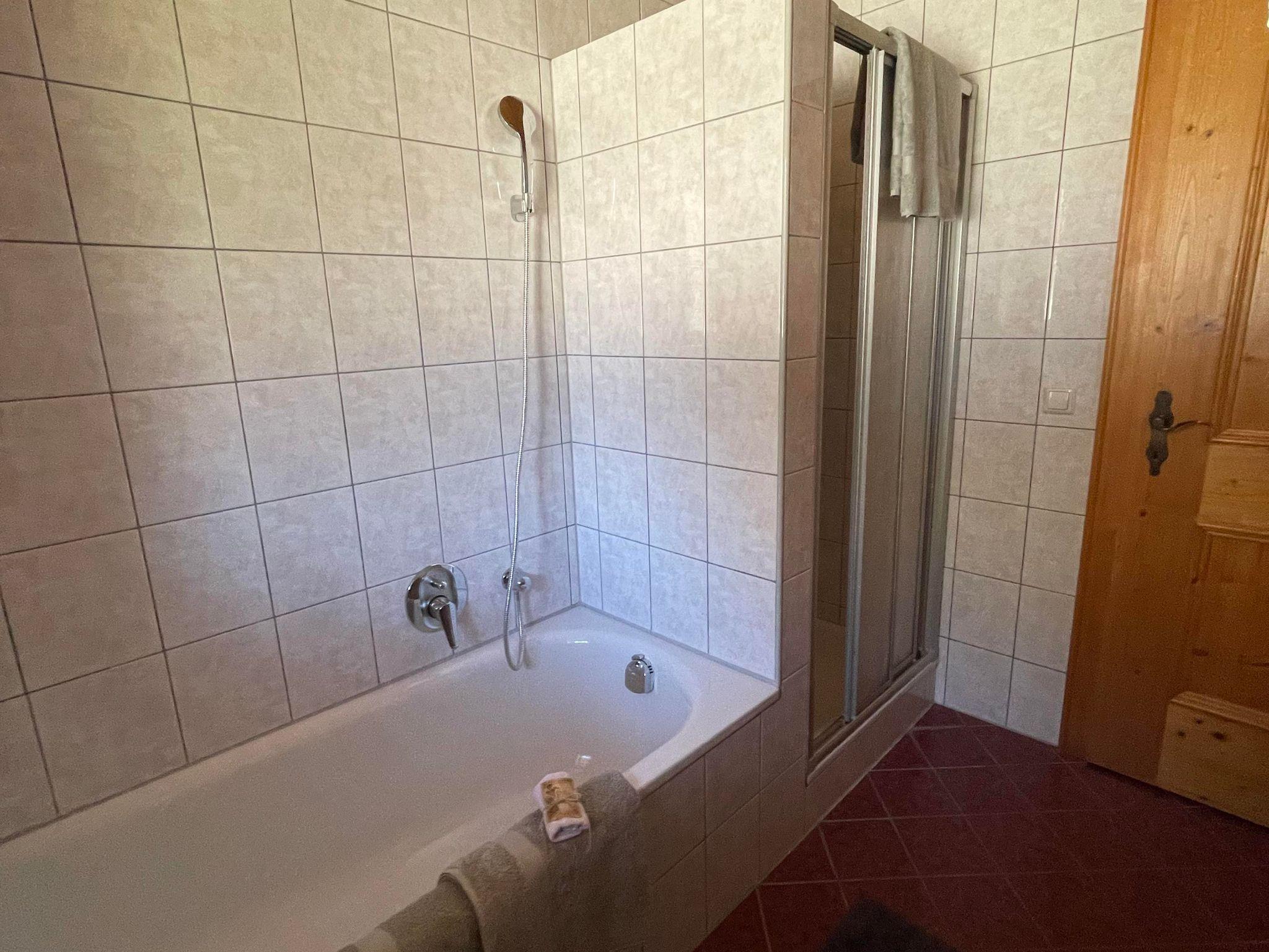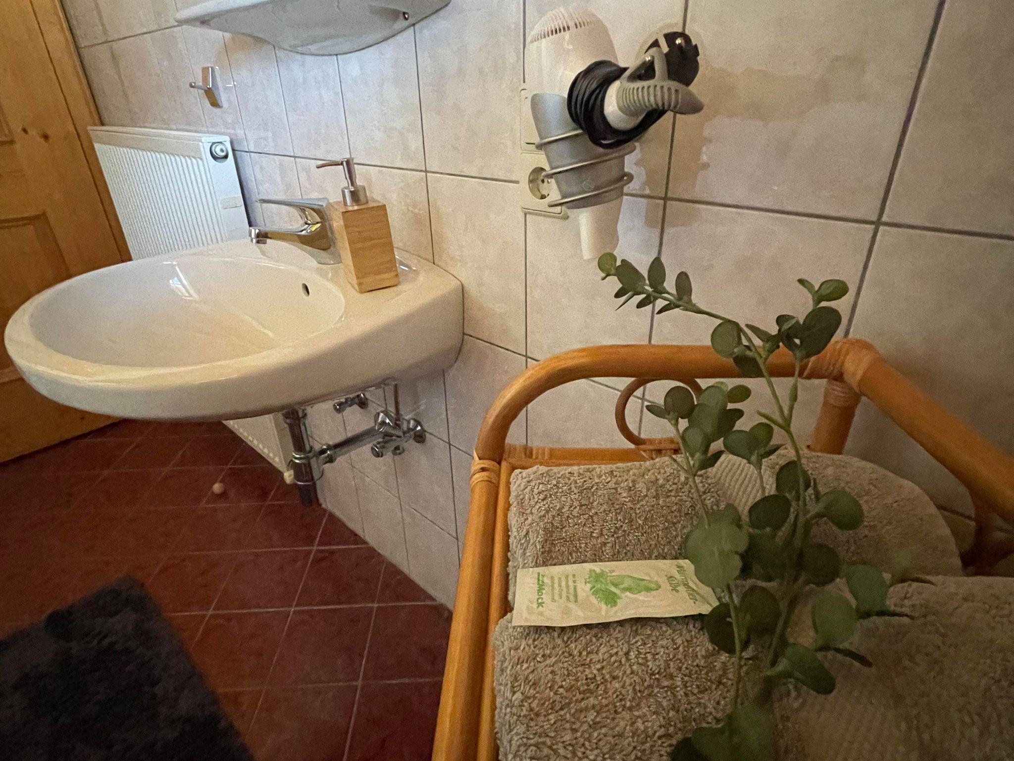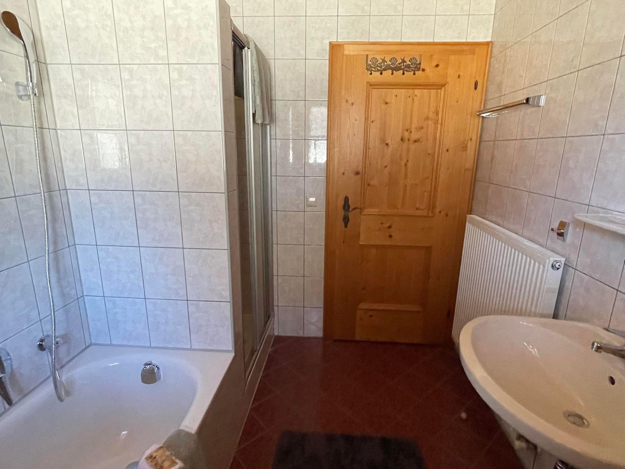 Unser Doppelzimmer und Dreibettzimmer sind gemütlich eingerichtet, das Badezimmer ist ausgestattet mit einer Dusche, eigener Badewanne und nebenan seperates WC. Allergiker Wohnung nur Fliesen und Parkett!