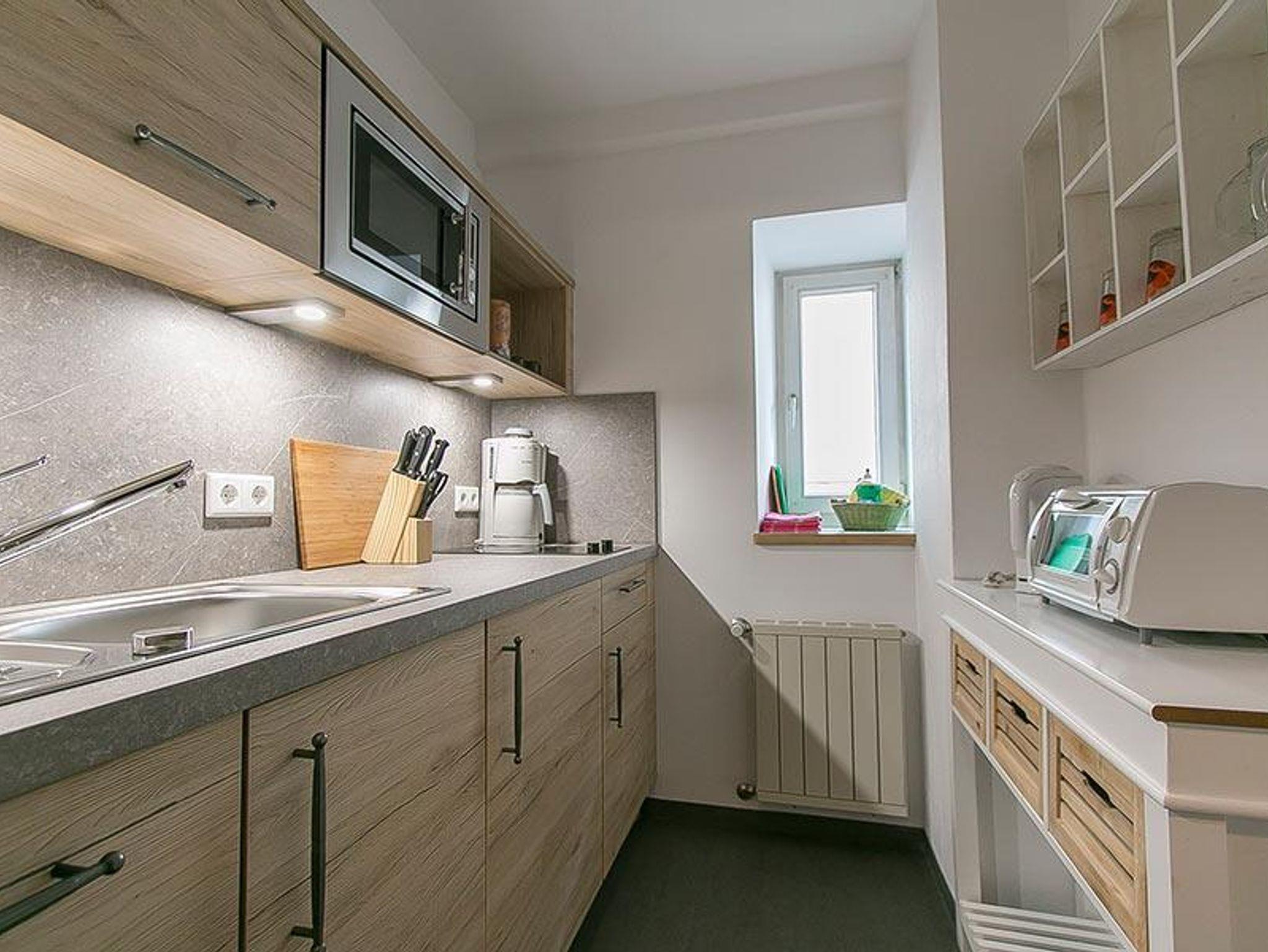 Die neu renovierte Küche ist vollständig ausgestattet und verfügt über einen Geschirrspüler, Mikrowelle, Kaffeemaschine und einen Wasserkocher.