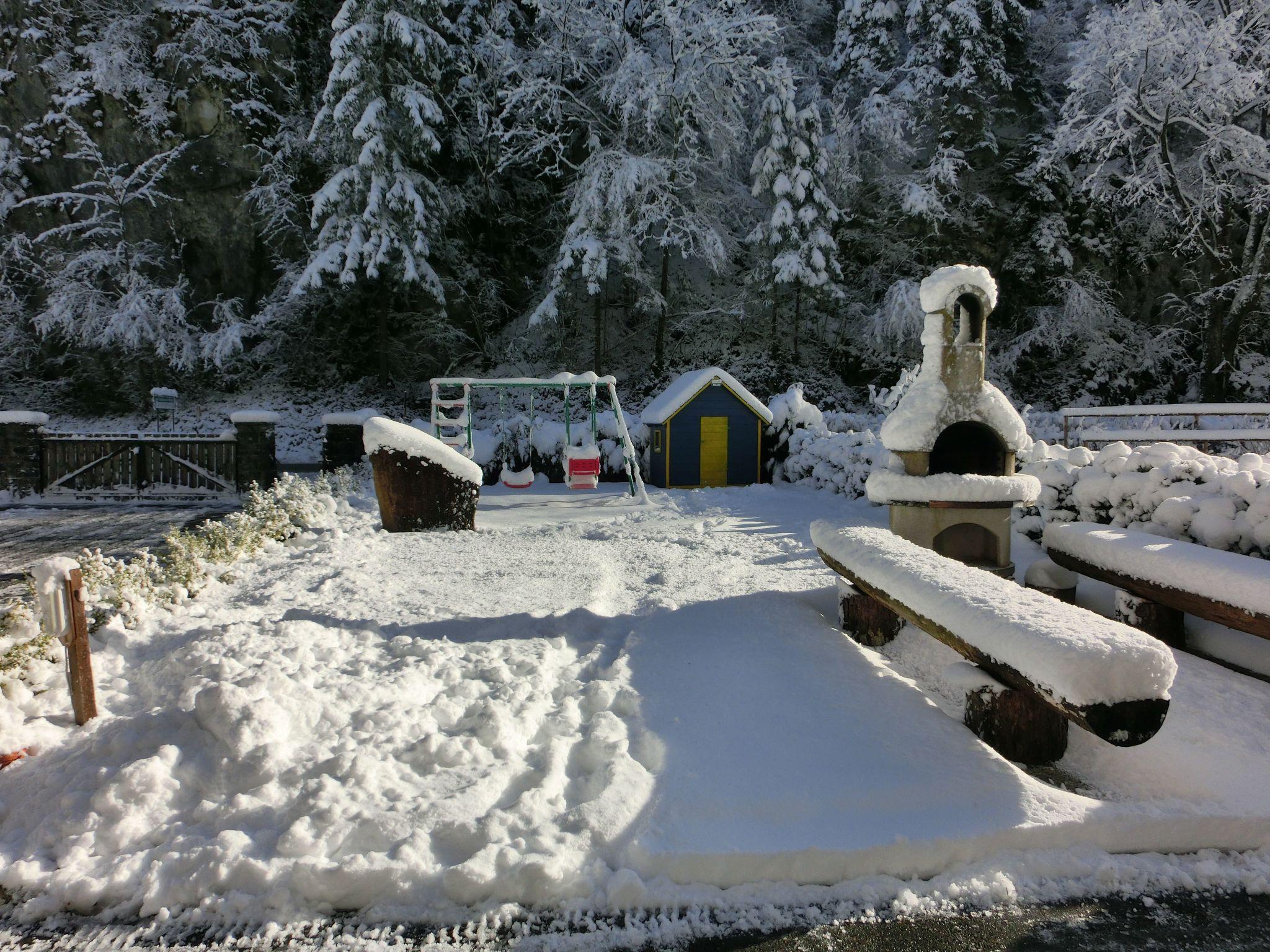There is a terrace. The fully fenced outdoor area borders a little stream. A grill area, a fireplace, a Wendy house and children’s play equipment are available. The site is accessed via a bridge and has plenty of parking space.