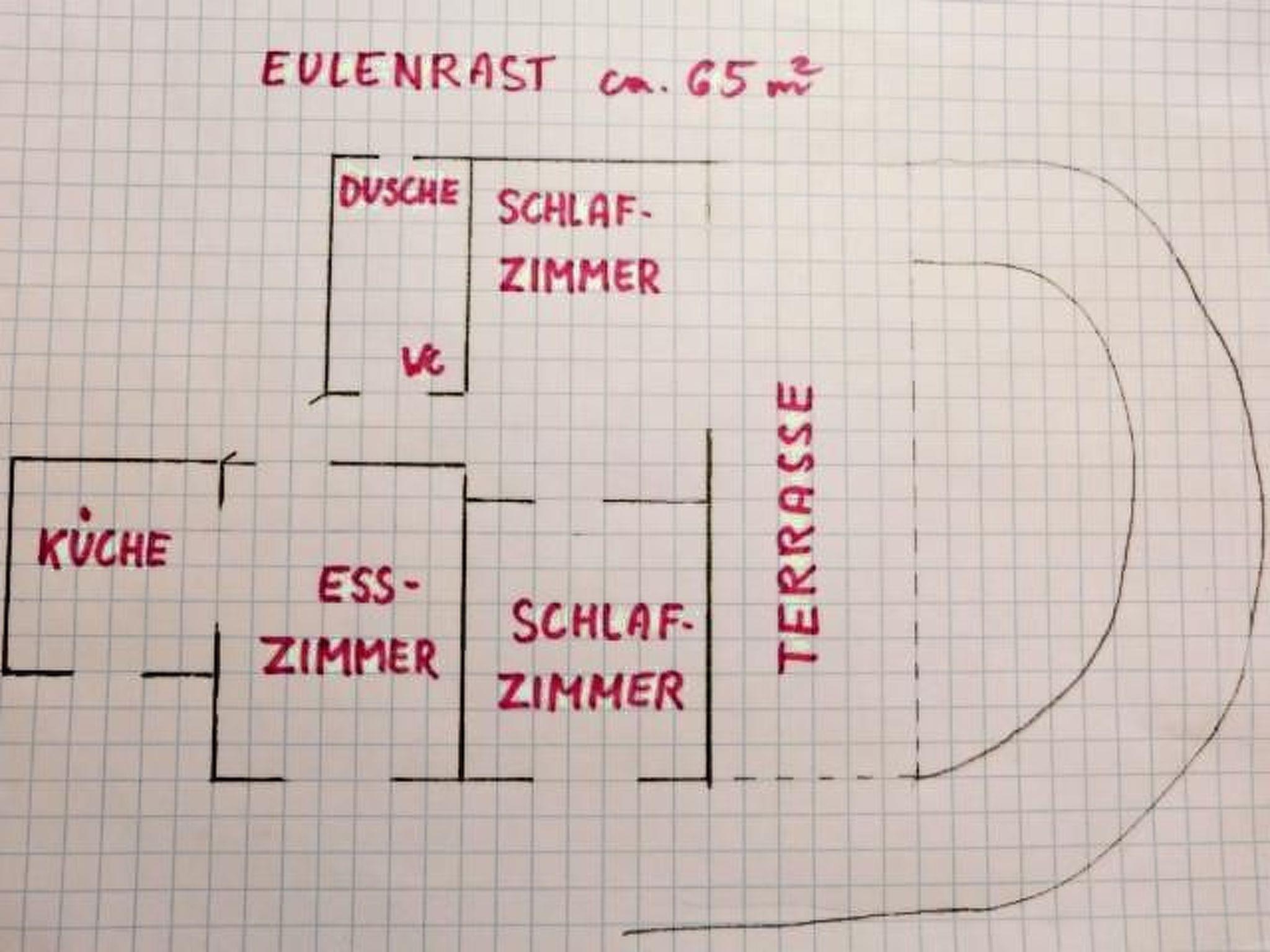 The “Eulenrast” apartment is on the ground floor and measures around 70m². It comprises an entrance area, a shower/WC, a living and dining room and a fully-equipped kitchen, as well as two separate bedrooms.