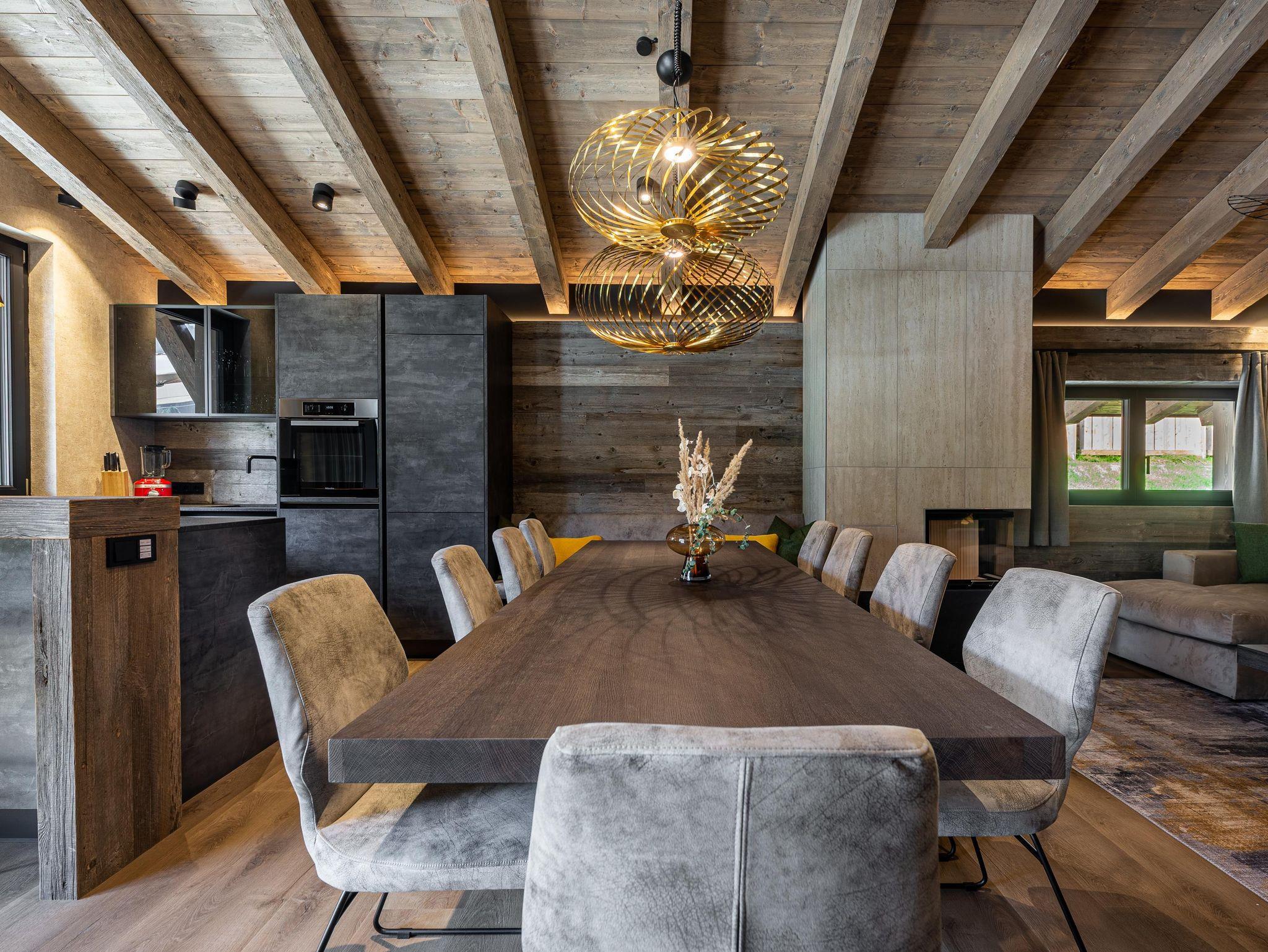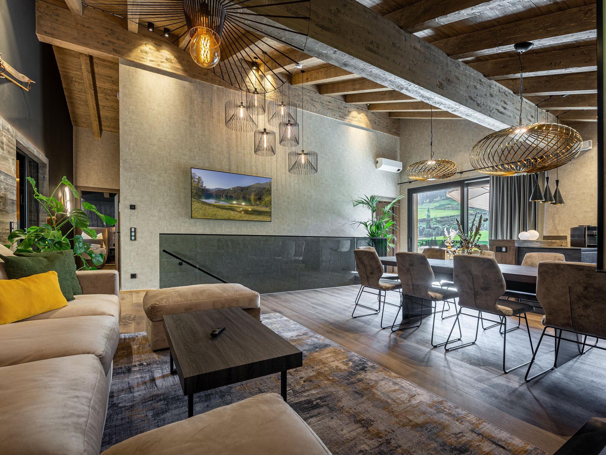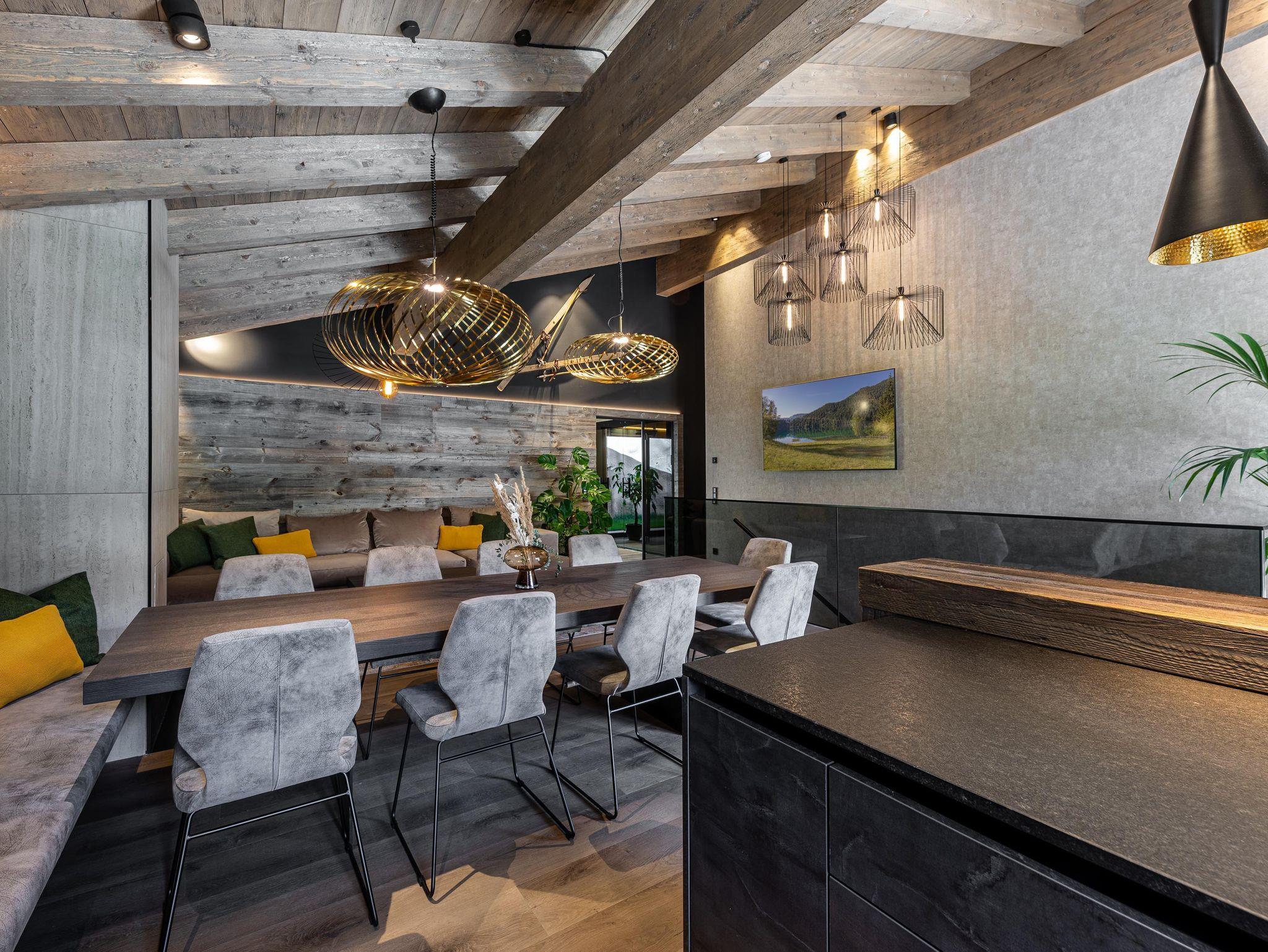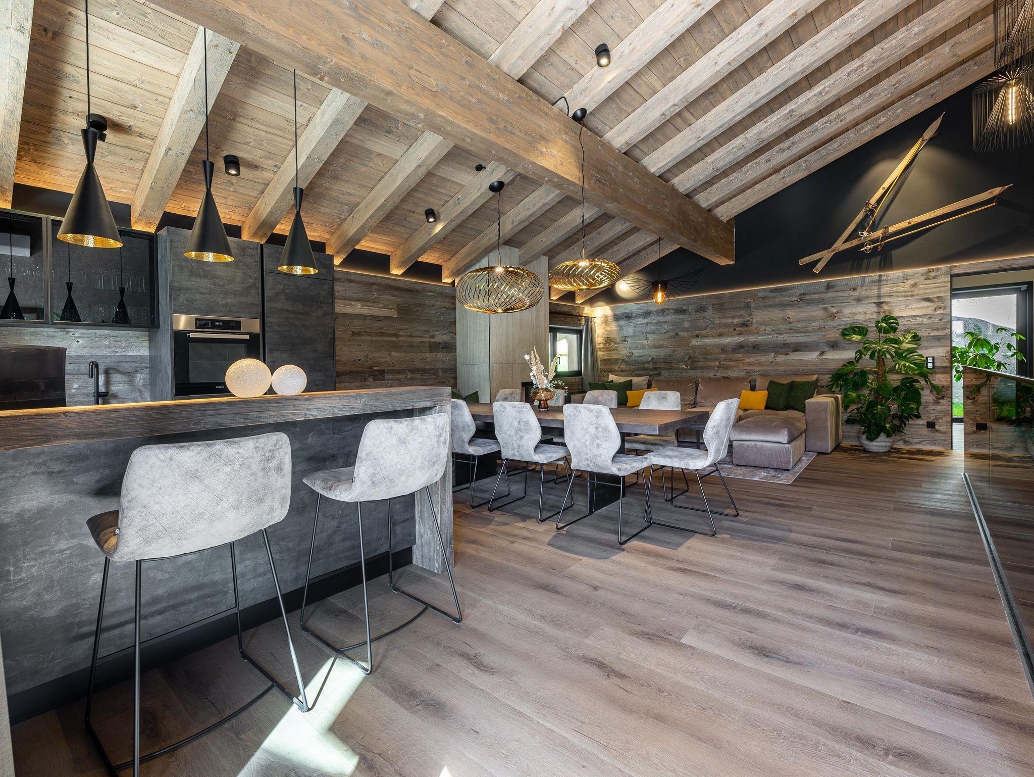 Willkommen im Kellnergut Chalet FRITZ. Dieses exklusive Privatchalet mit 310 m² Wohnfläche bietet Platz für bis zu 10 Personen in 5 Schlafzimmern mit eigenen Bädern. Entspannen Sie im privaten Wellnessbereich mit Sauna und Relax-Ruheraum oder auf der großzügigen Sonnenterrasse und Talblick. Die alpin-moderne Einrichtung mit Sichtdachstuhl, der gemütliche Wohnbereich mit Kamin und Panorama-Fenster sowie die hochwertig ausgestattete Küche lassen keine Wünsche offen.