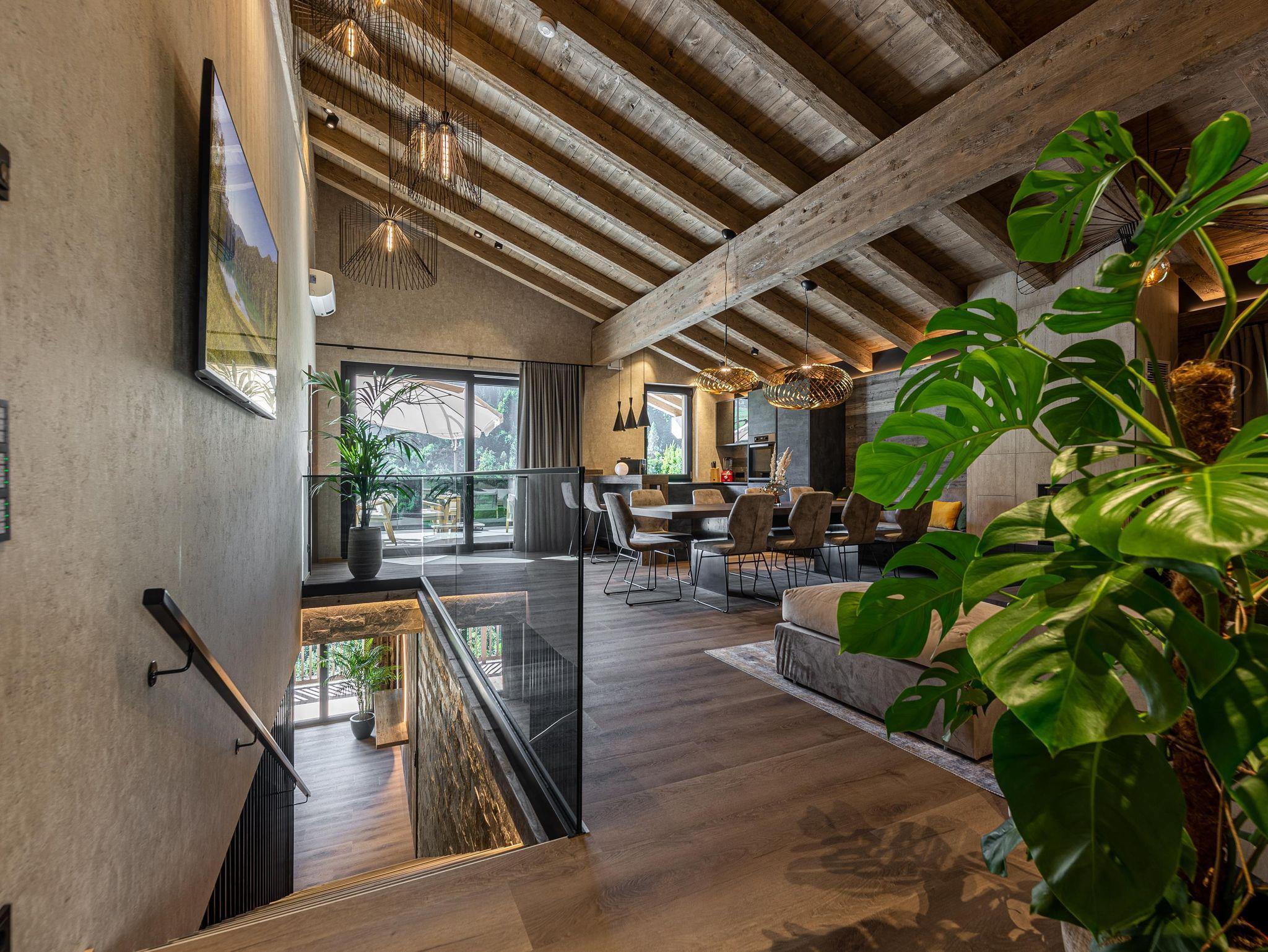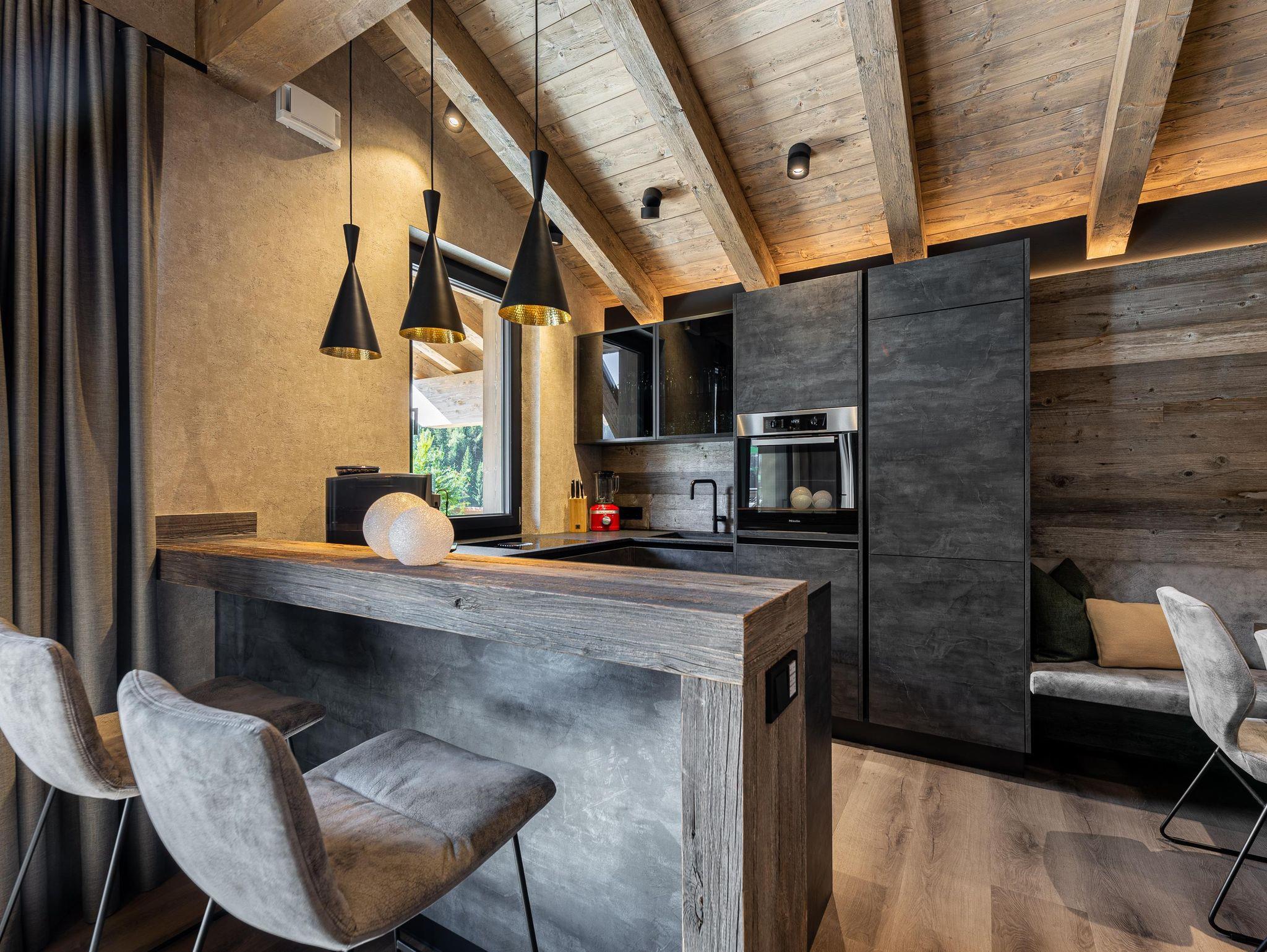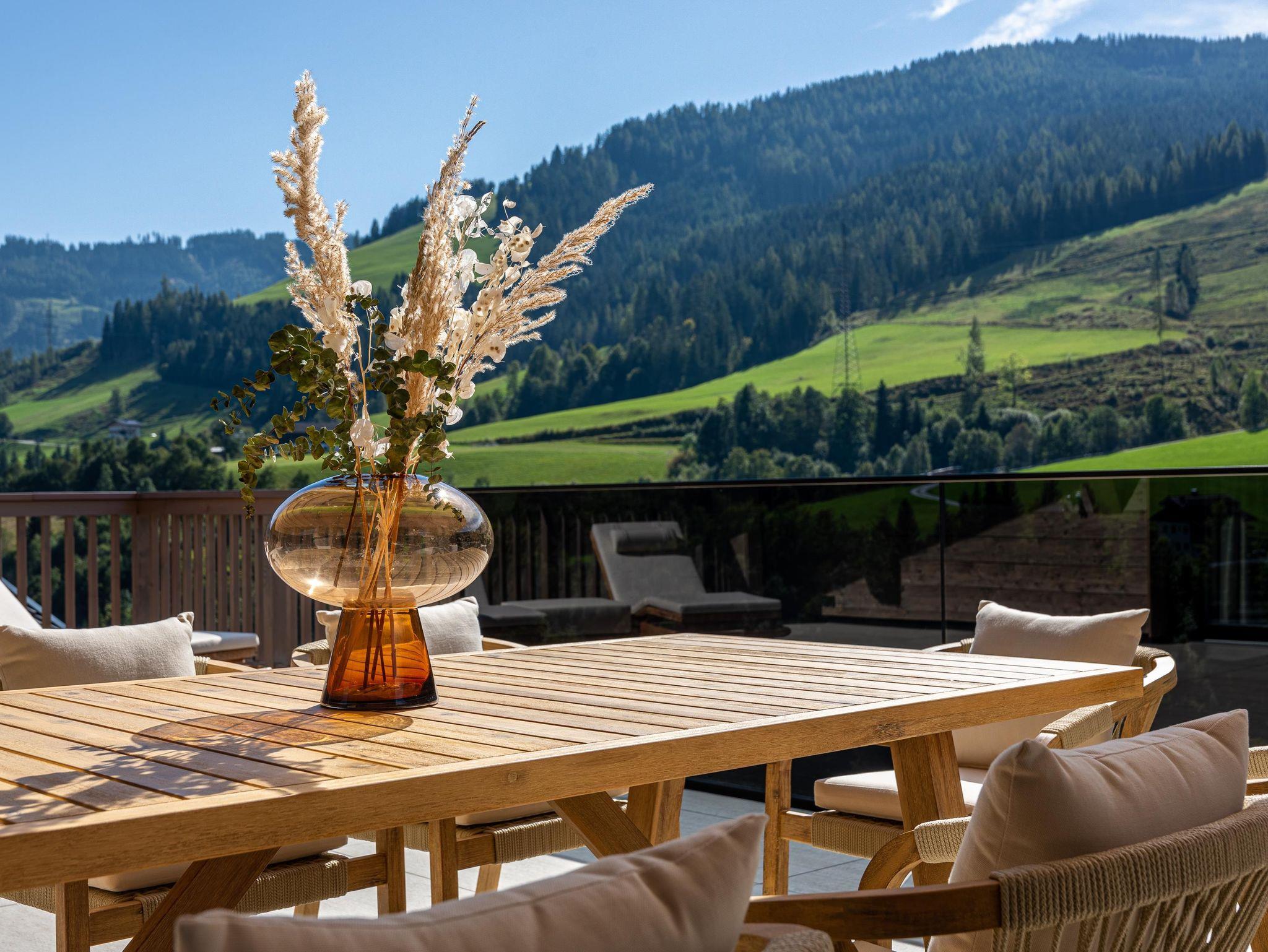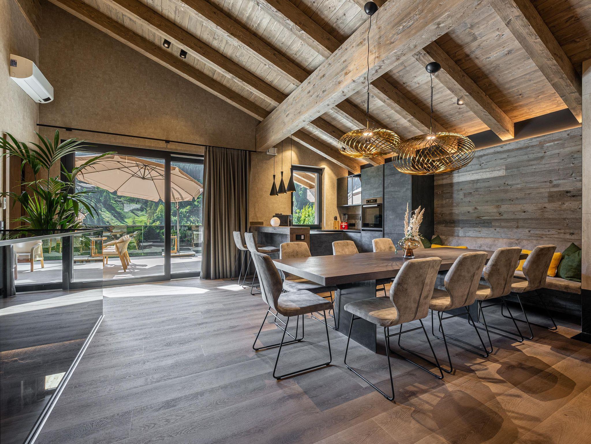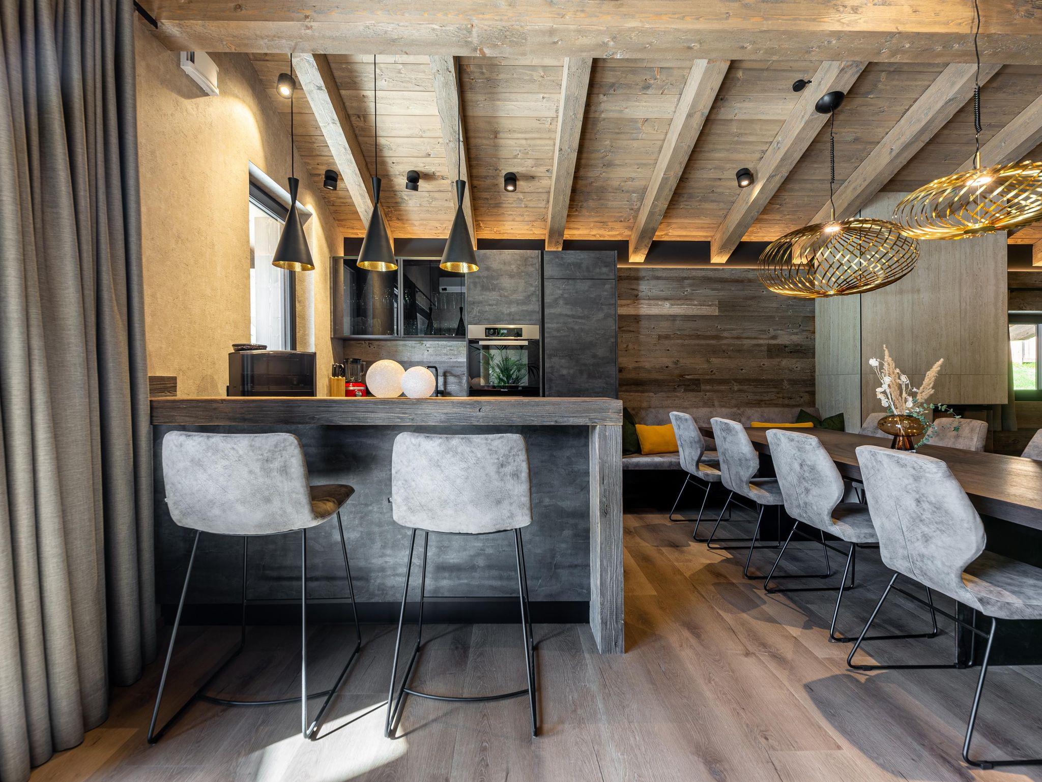 Willkommen im Kellnergut Chalet FRITZ. Dieses exklusive Privatchalet mit 310 m² Wohnfläche bietet Platz für bis zu 10 Personen in 5 Schlafzimmern mit eigenen Bädern. Entspannen Sie im privaten Wellnessbereich mit Sauna und Relax-Ruheraum oder auf der großzügigen Sonnenterrasse und Talblick. Die alpin-moderne Einrichtung mit Sichtdachstuhl, der gemütliche Wohnbereich mit Kamin und Panorama-Fenster sowie die hochwertig ausgestattete Küche lassen keine Wünsche offen.