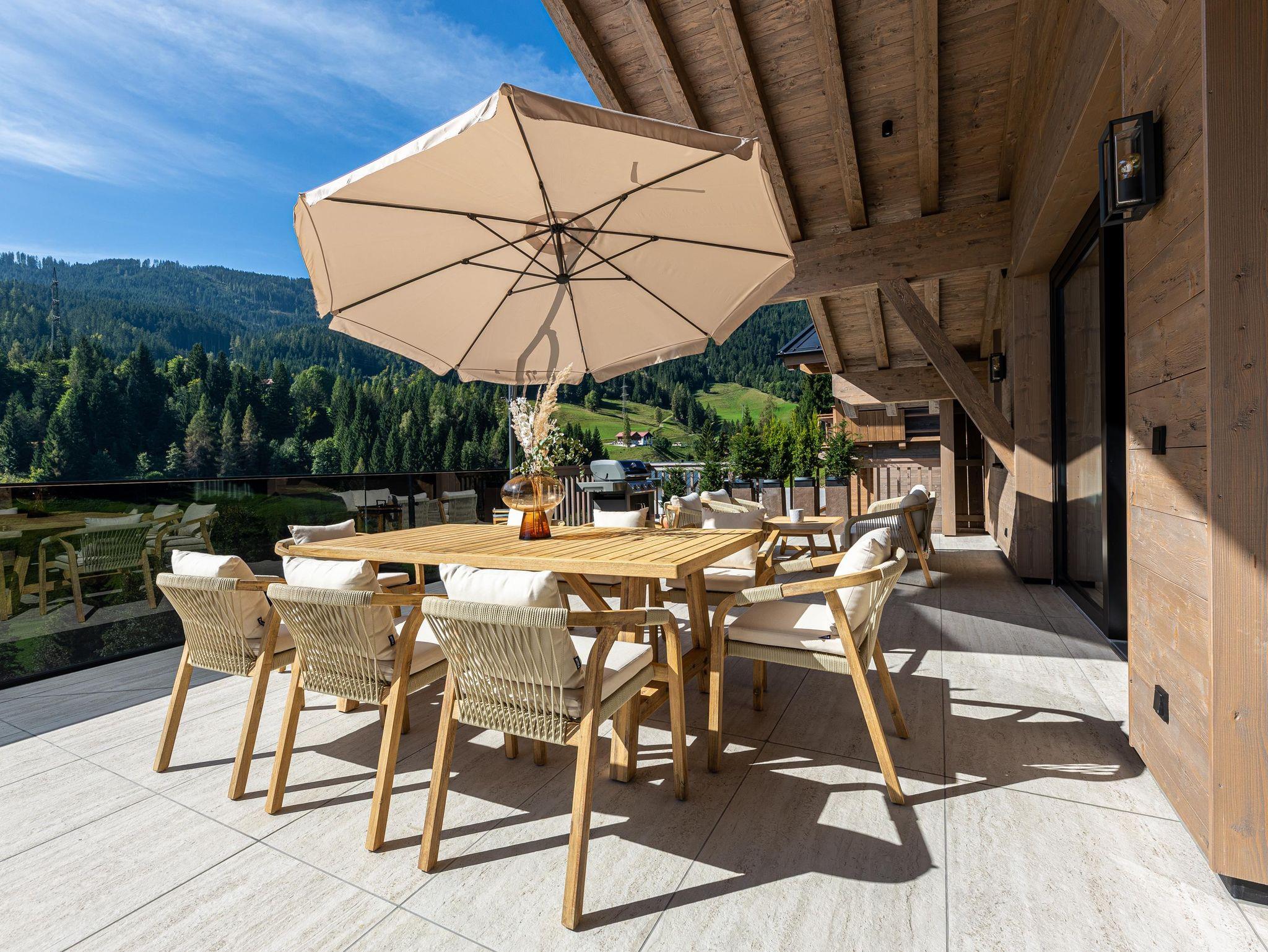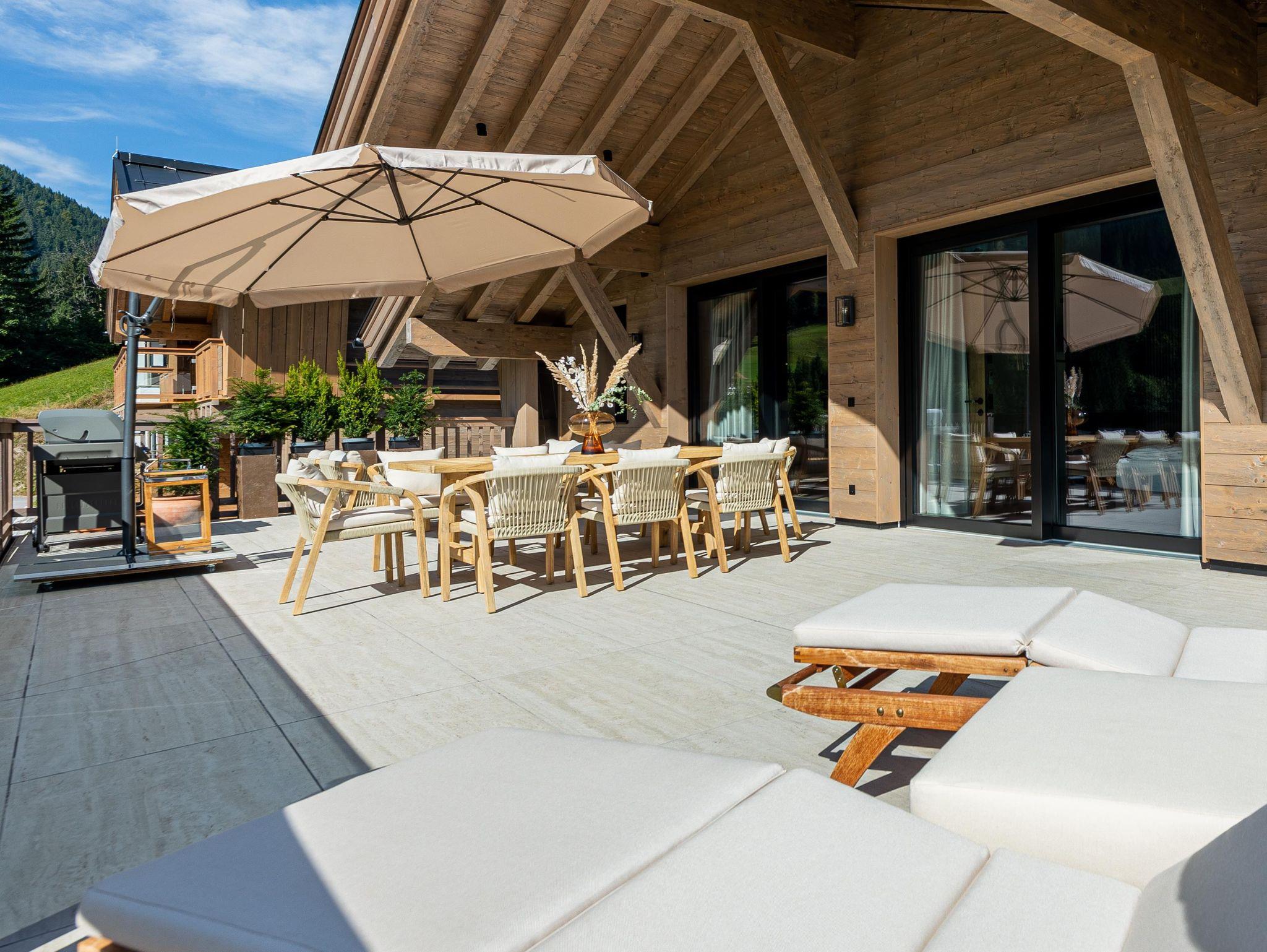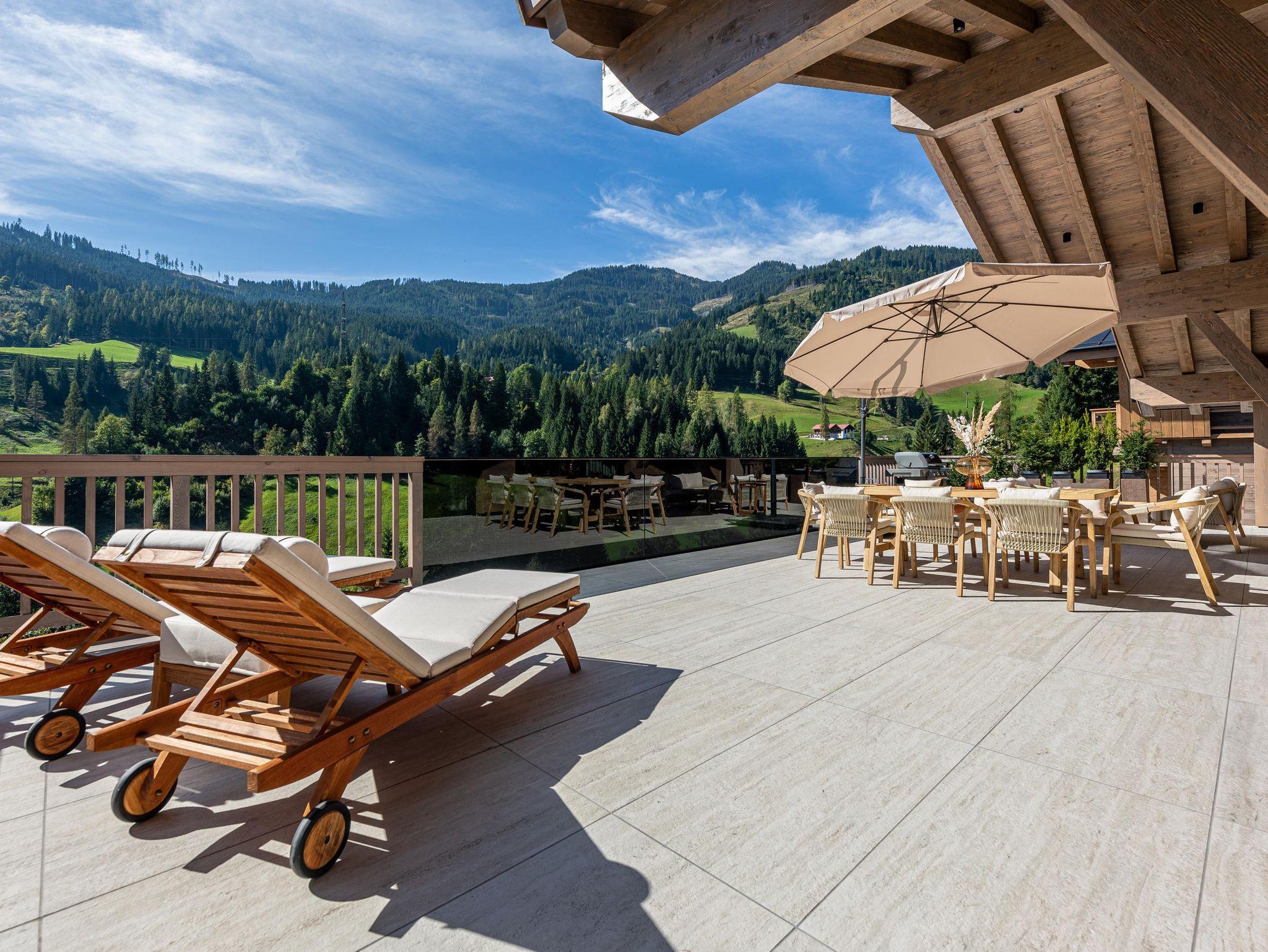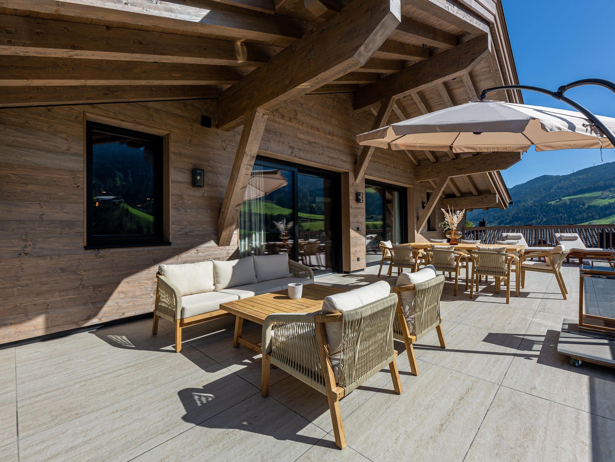 Willkommen im Kellnergut Chalet FRITZ. Dieses exklusive Privatchalet mit 310 m² Wohnfläche bietet Platz für bis zu 10 Personen in 5 Schlafzimmern mit eigenen Bädern. Entspannen Sie im privaten Wellnessbereich mit Sauna und Relax-Ruheraum oder auf der großzügigen Sonnenterrasse und Talblick. Die alpin-moderne Einrichtung mit Sichtdachstuhl, der gemütliche Wohnbereich mit Kamin und Panorama-Fenster sowie die hochwertig ausgestattete Küche lassen keine Wünsche offen.
