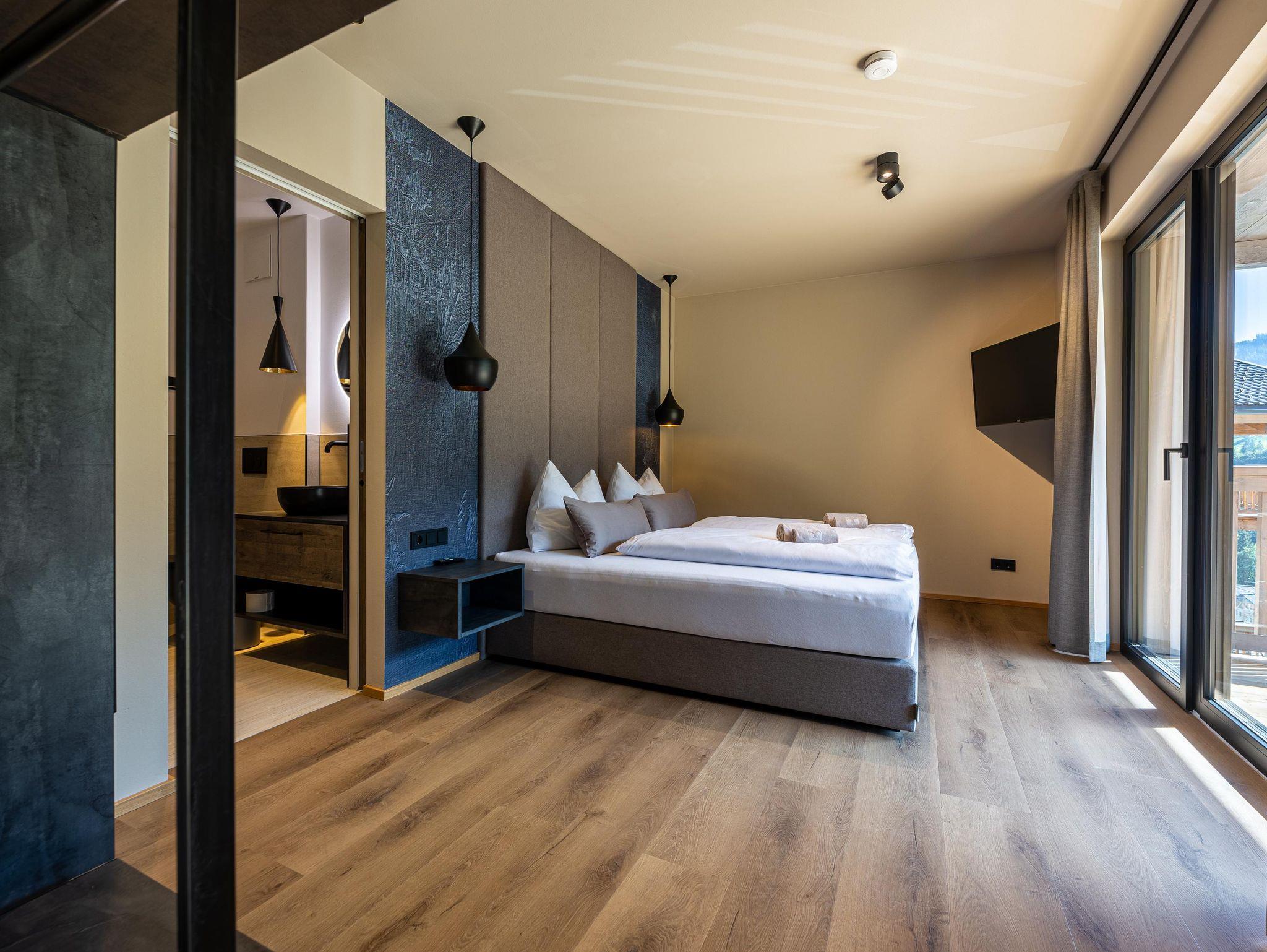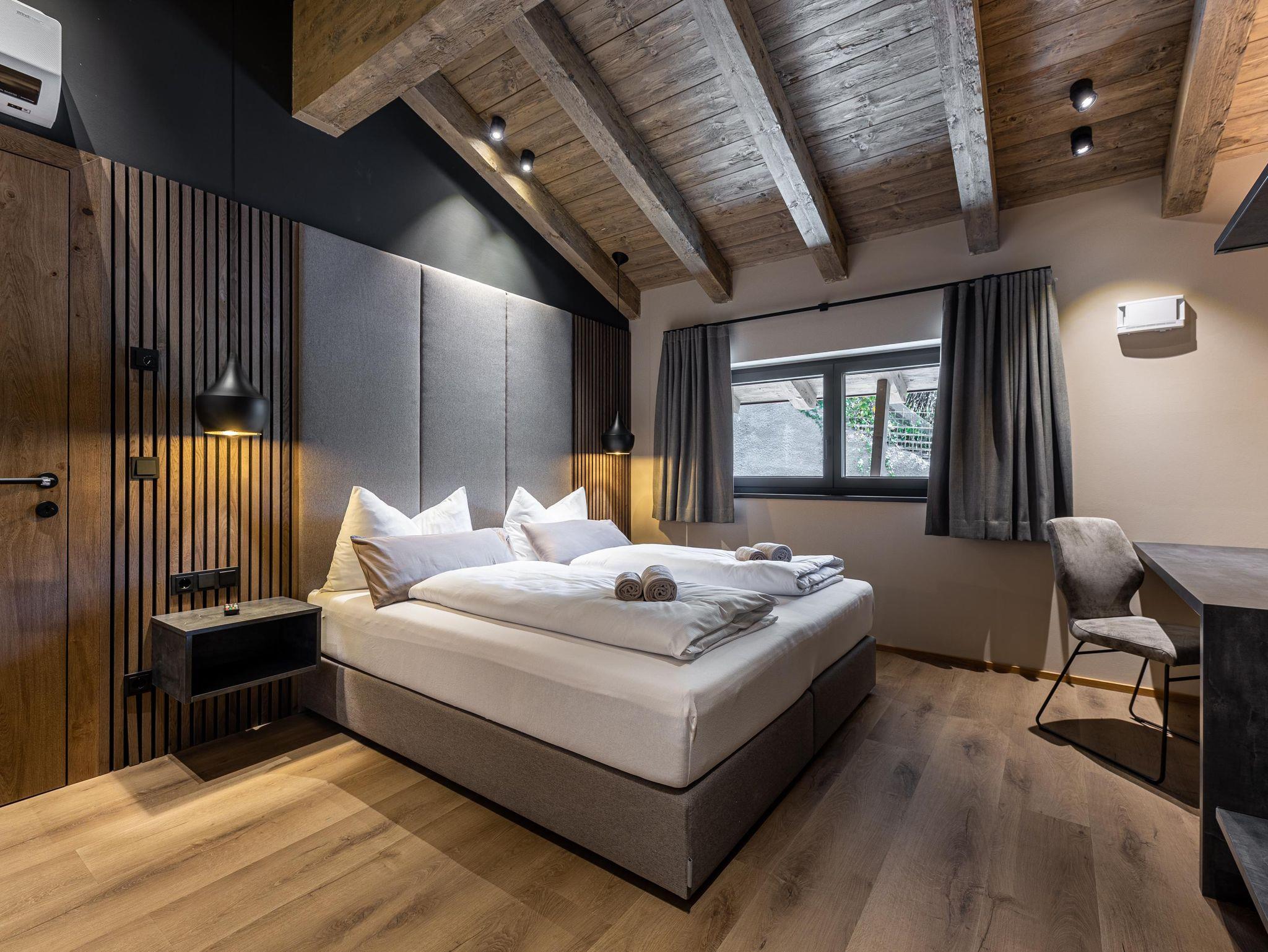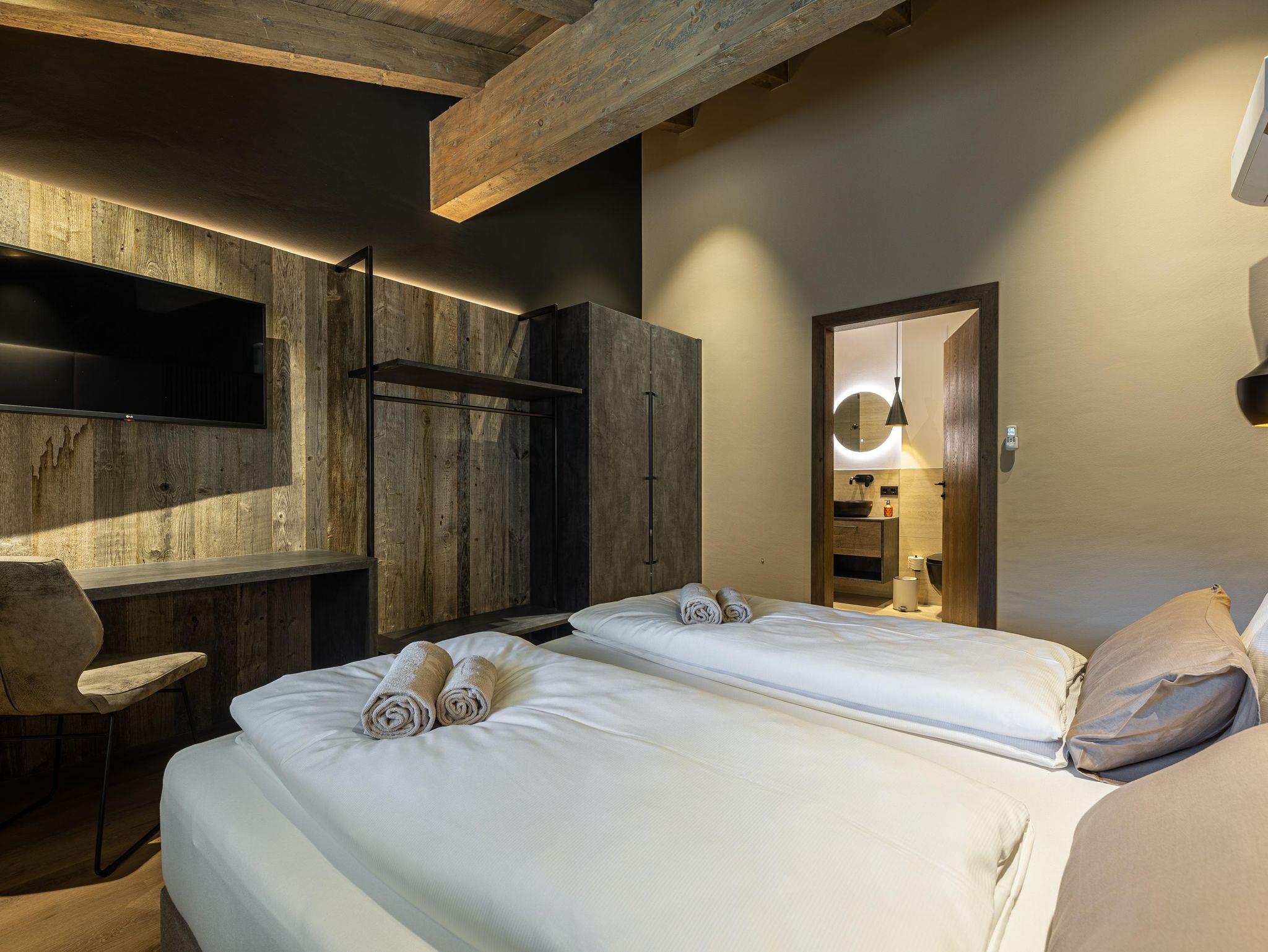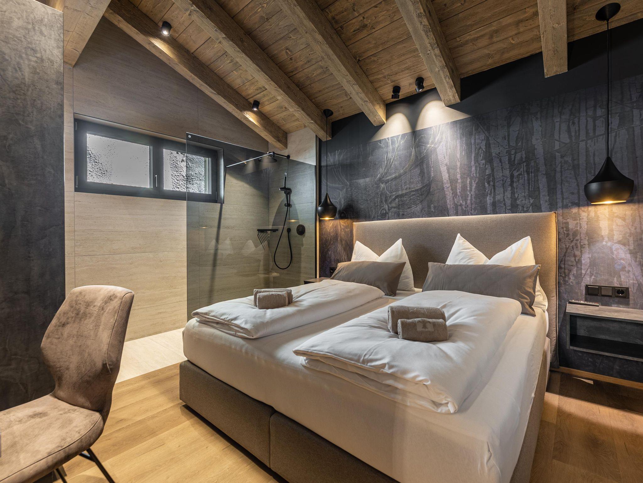 Die Chalets FRITZ und FRIEDA bestechen durch eine alpin-moderne Einrichtung, gemütliche Wohnbereiche mit Kamin und Panorama-Fenster sowie voll ausgestattete Küchen. Während das Chalet FRITZ mit 310 m² Wohnfläche 5 Schlafzimmer mit eigenen Bädern bietet, verfügt das Chalet FRIEDA auf 270 m² über 4 Schlafzimmer, ebenfalls mit privaten Bädern. Beide Chalets laden mit privaten Wellnessbereichen zum Entspannen ein: Im Chalet FRITZ erwartet Sie eine Sauna mit Relax-Ruheraum und eine großzügige Sonnenterrasse mit Talblick. Das Chalet FRIEDA bietet einen Relax-Garten mit Panorama-Sauna.