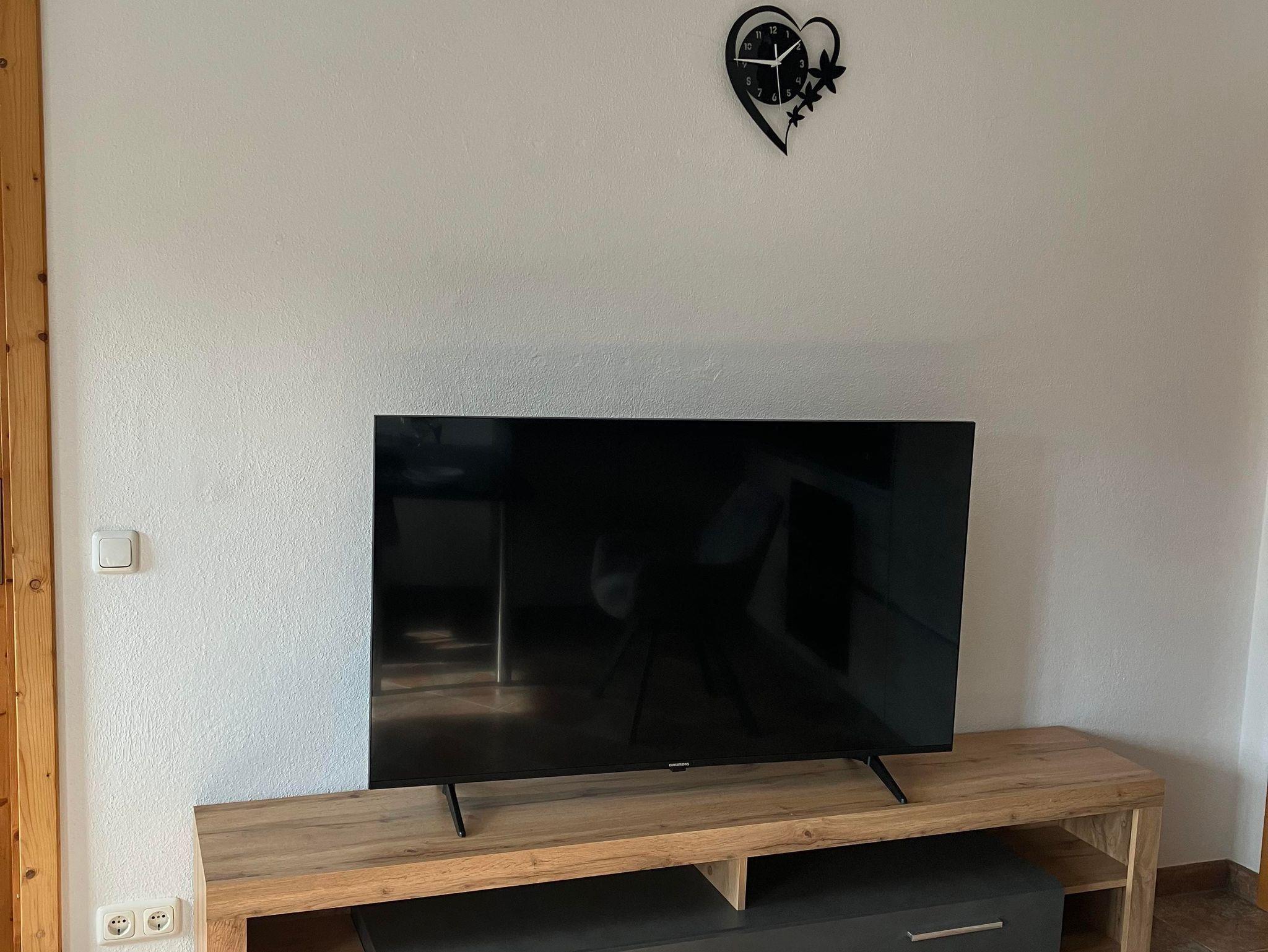 Der Wohnbereich lädt mit Sofa, Esstisch und Flat-TV zu entspannten Stunden ein.