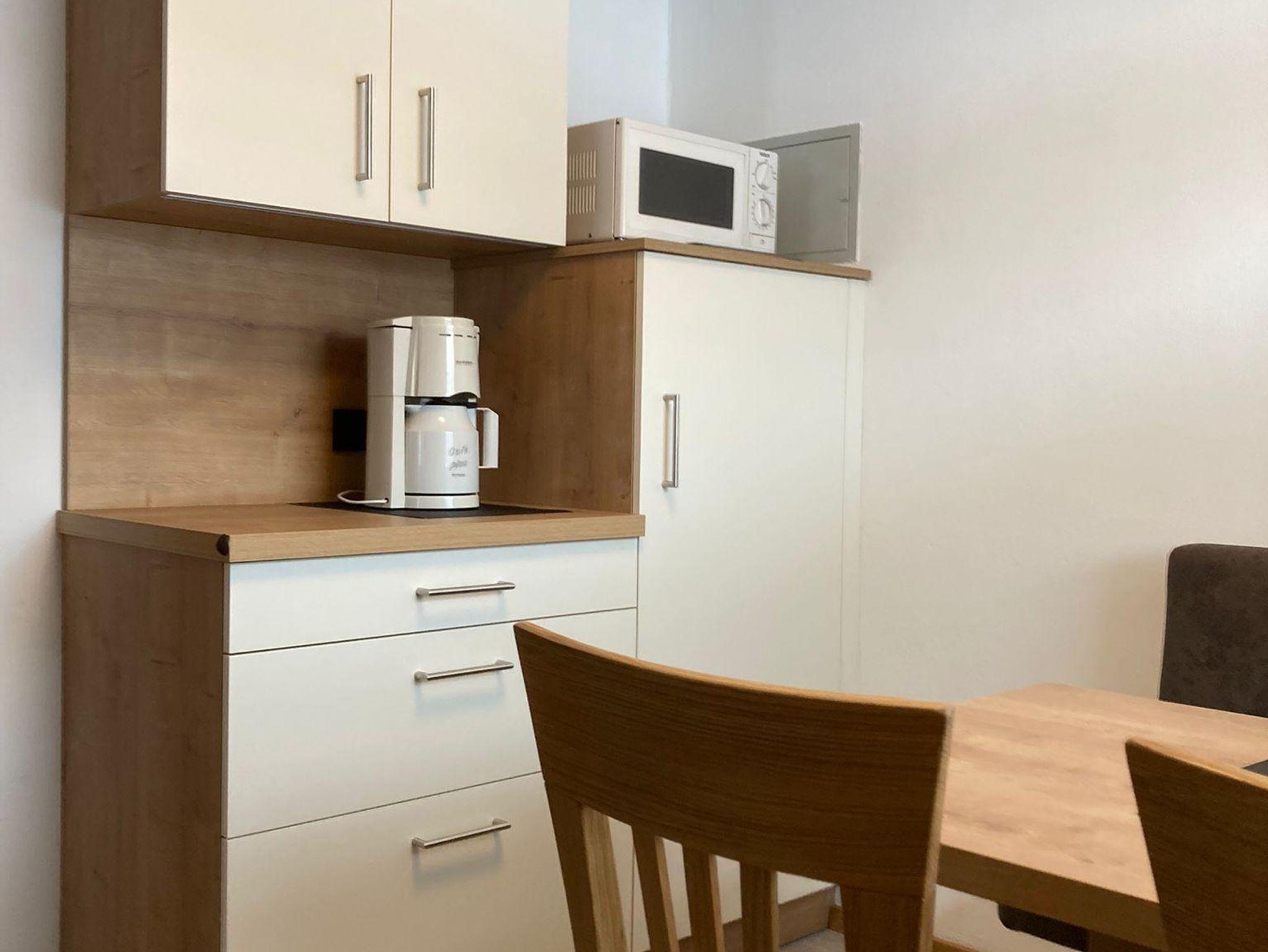 Das Appartement ist voll ausgestattet mit sämtlichen Koch- und Essgeschirr sowie E-Herd, Mikrowelle, Kaffeemaschine, Wasserkocher, Kühlschrank mit Gefrierfach, Geschirrspülmaschine, Handtücher, Bettwäsche, usw.