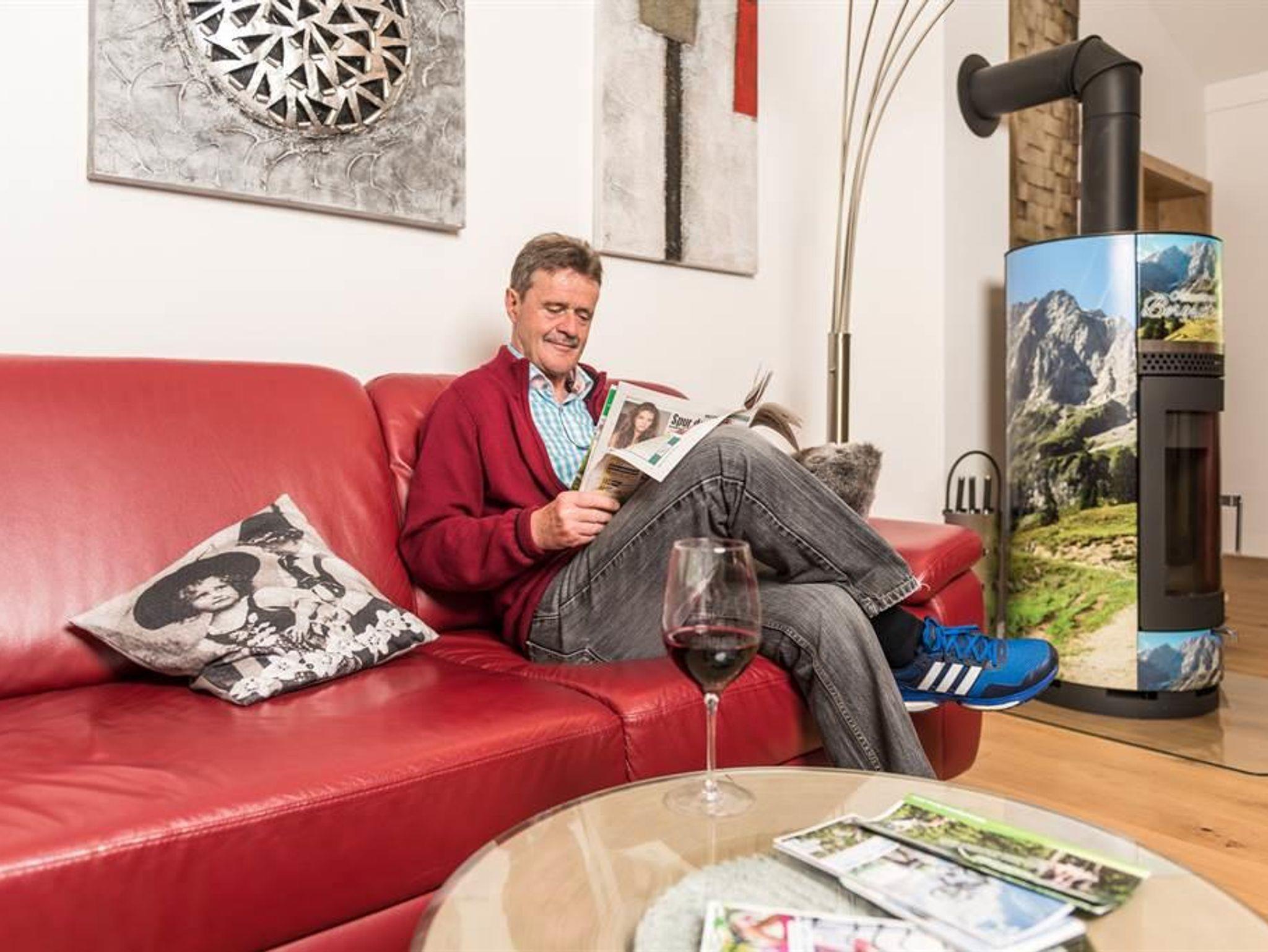 Ein Schlafzimmer mit Kingsize-Boxspringbetten mit großem Badezimmer mit Dusche, getrenntem WC, Radio, Kosmetikspiel, Fön und Infrarotkabine. Zweites Schlafzimmer mit Kingsize-Boxspringbetten, einer gemütlichen Couch (Zusatzbett) westseitig gelegenem Balkon und eigenem Badezimmer mit Dusche, WC, Radio, Kosmetikspiel und Fön. Sehr großzügiger Lebensraum mit Kaminofen, Kuschelecke mit Ausziehcouch (Zusatzbett) und großem Mühlsteintisch, großer Flatscreen mit Kabel-TV, komplett ausgestatteter Küche mit Esstisch. Großer Balkon mit Blick auf den Hochkönig und das Gartenhaus. Genügend Platz für ein Gitterbett.