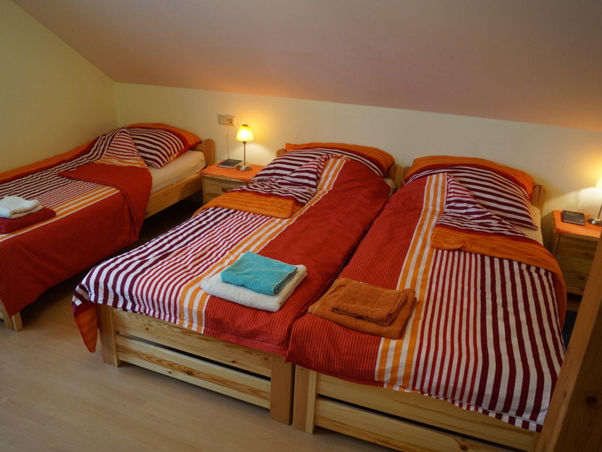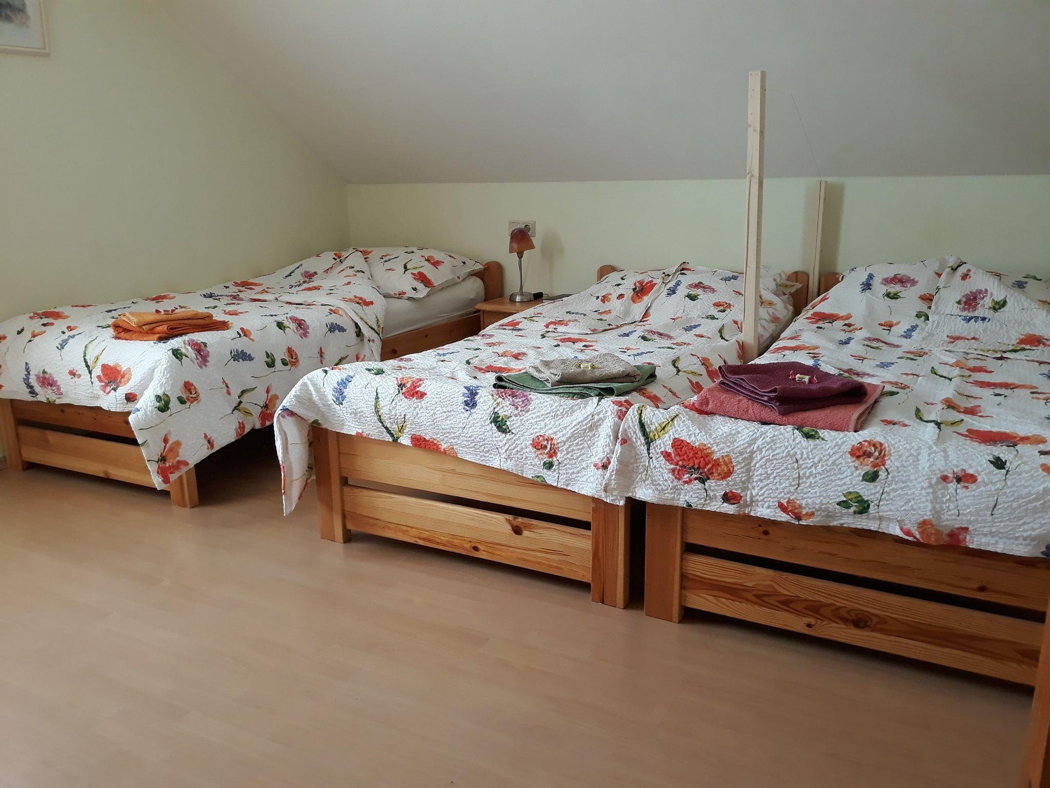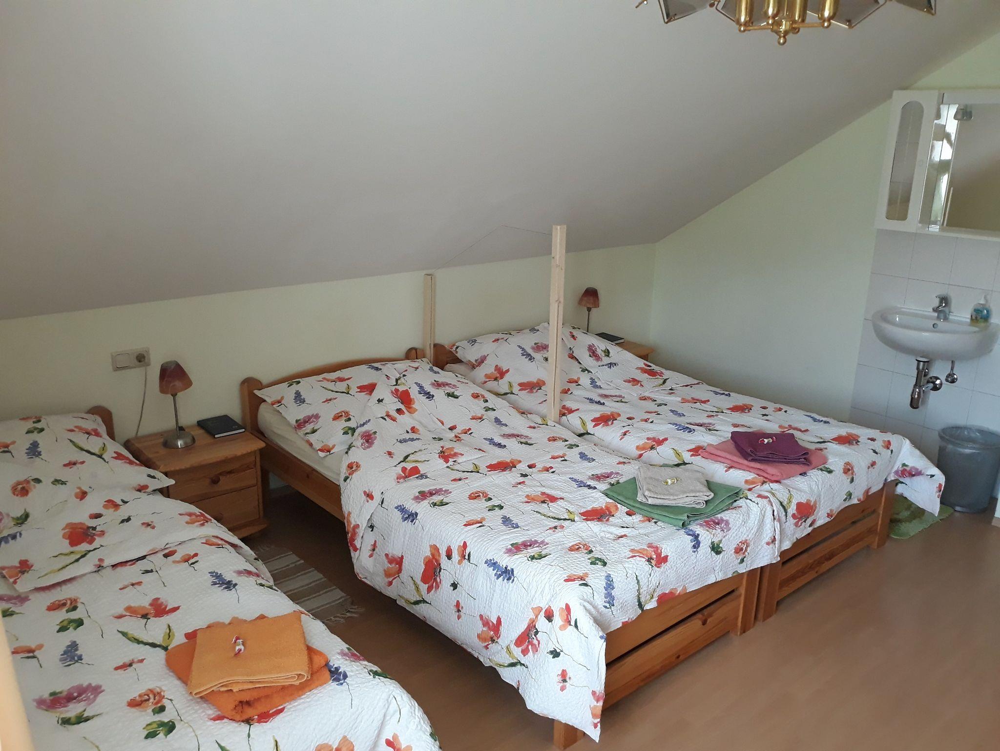 Unser 3/4-Bettzimmer mit Vollholzmöbeln kann natürlich auch von Single-Personen oder Paaren genutzt werden. Die Einzelbetten können getrennt oder auch zusammengeschoben stehen, wie es den Wünschen entspricht. Auch hier wurde an Rückenpatienten gedacht und auf hochwertige Matratzen zum bequemen Schlafen Wert gelegt.