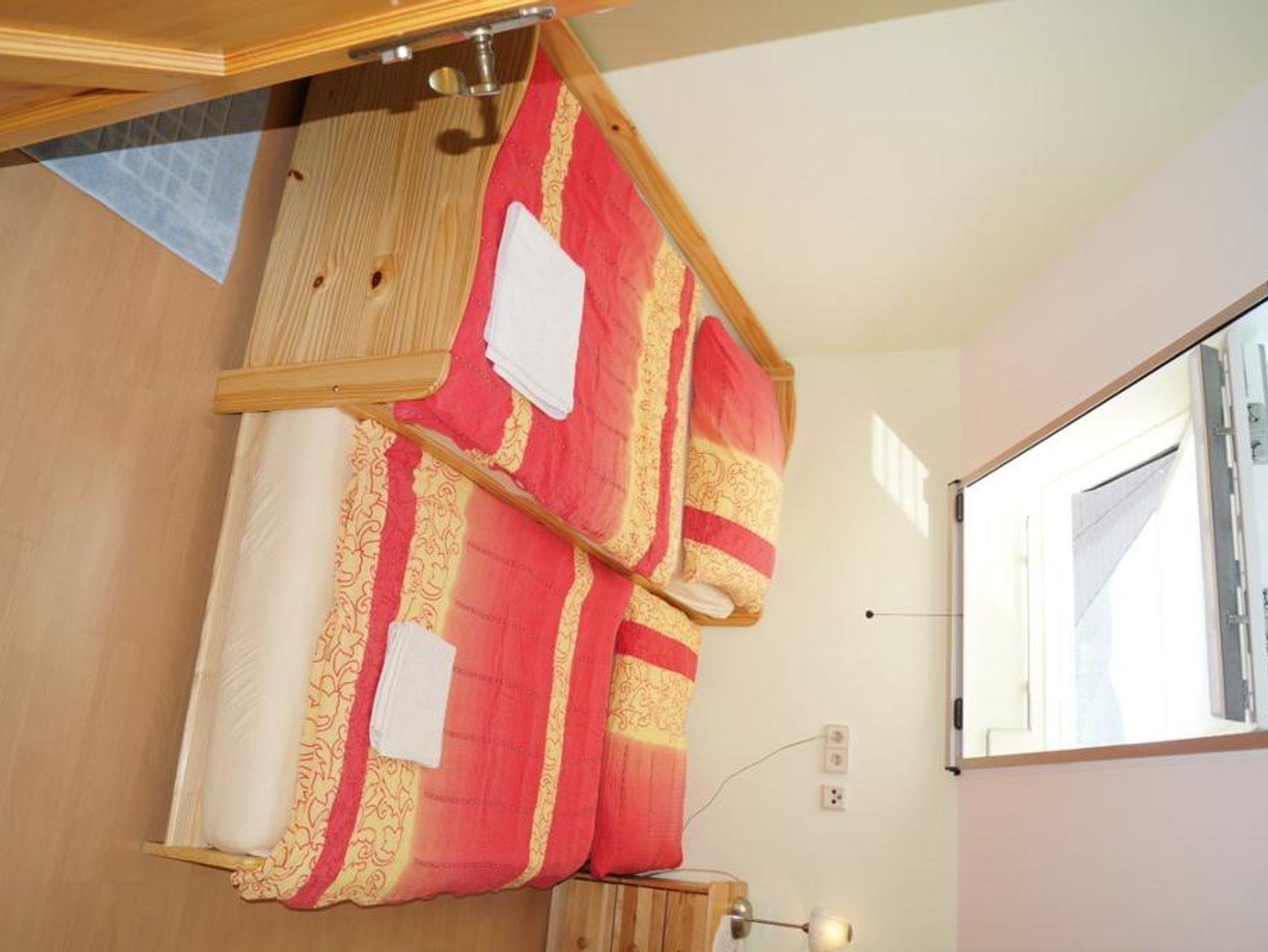 Das Zusatzbett kann auf Anfrage aufgestellt werden. Im Raum befindet sich eine Waschgelegenheit, ein großer Tisch mit drei Stühlen sowie ein geräumiger Kasten. Die Heizung ist im Boden integriert. Bei Hitze im Sommer kann ein Ventilator extra Luftzufuhr spenden. Das Fenster hat Fliegengitter und einen Rolladen zum Schutz gegen Hitze oder Kälte oder Lichteinfall.