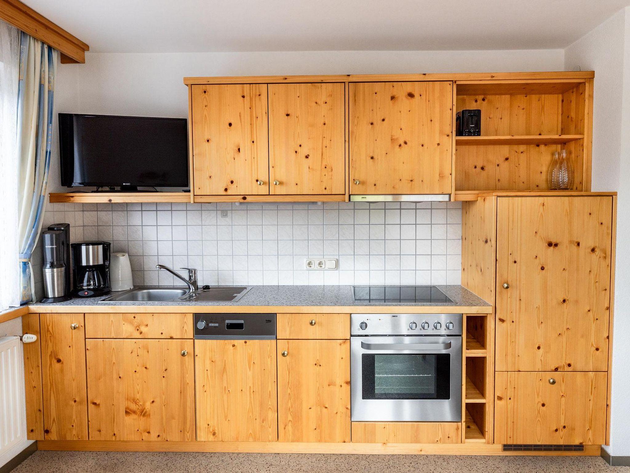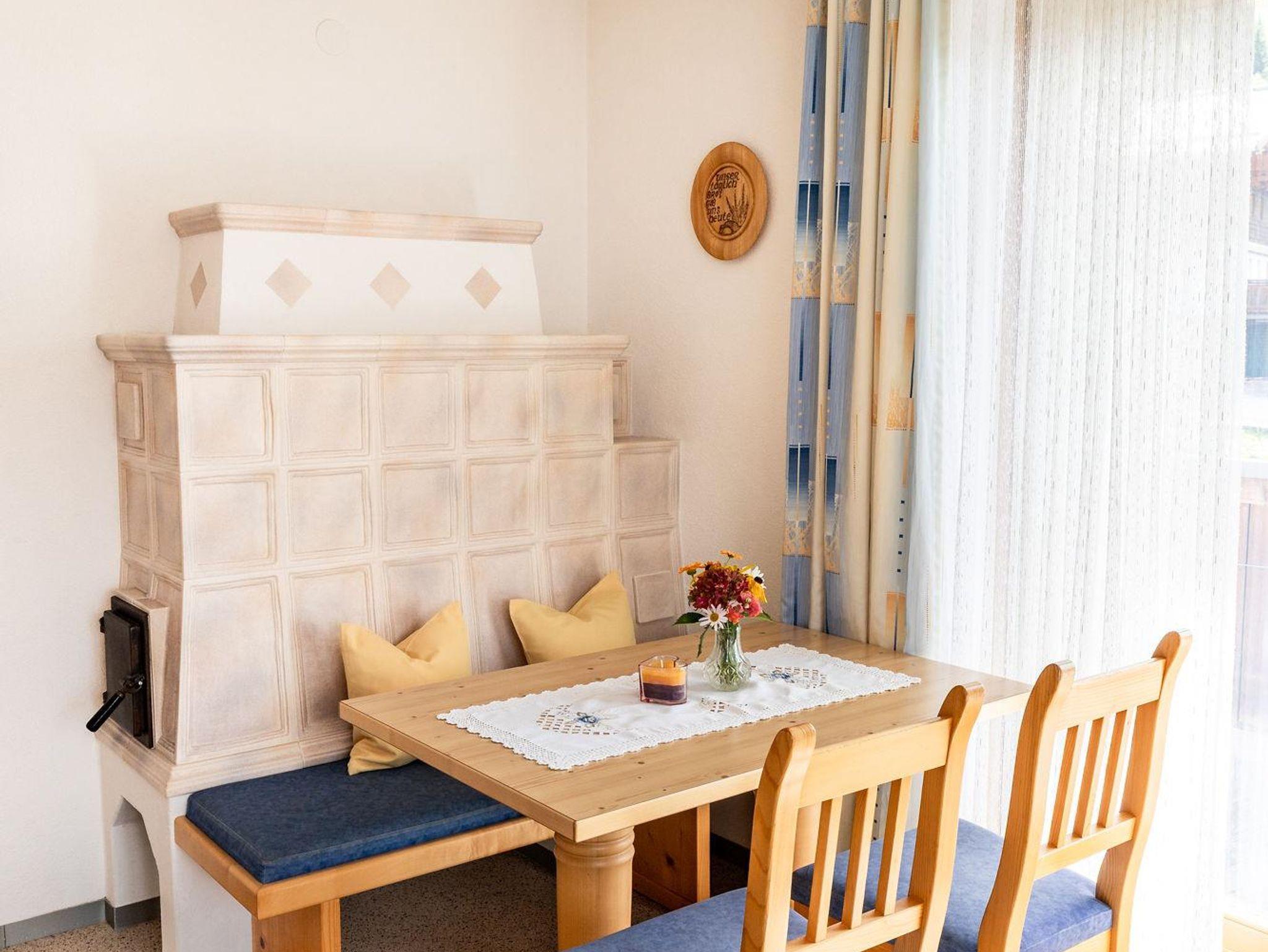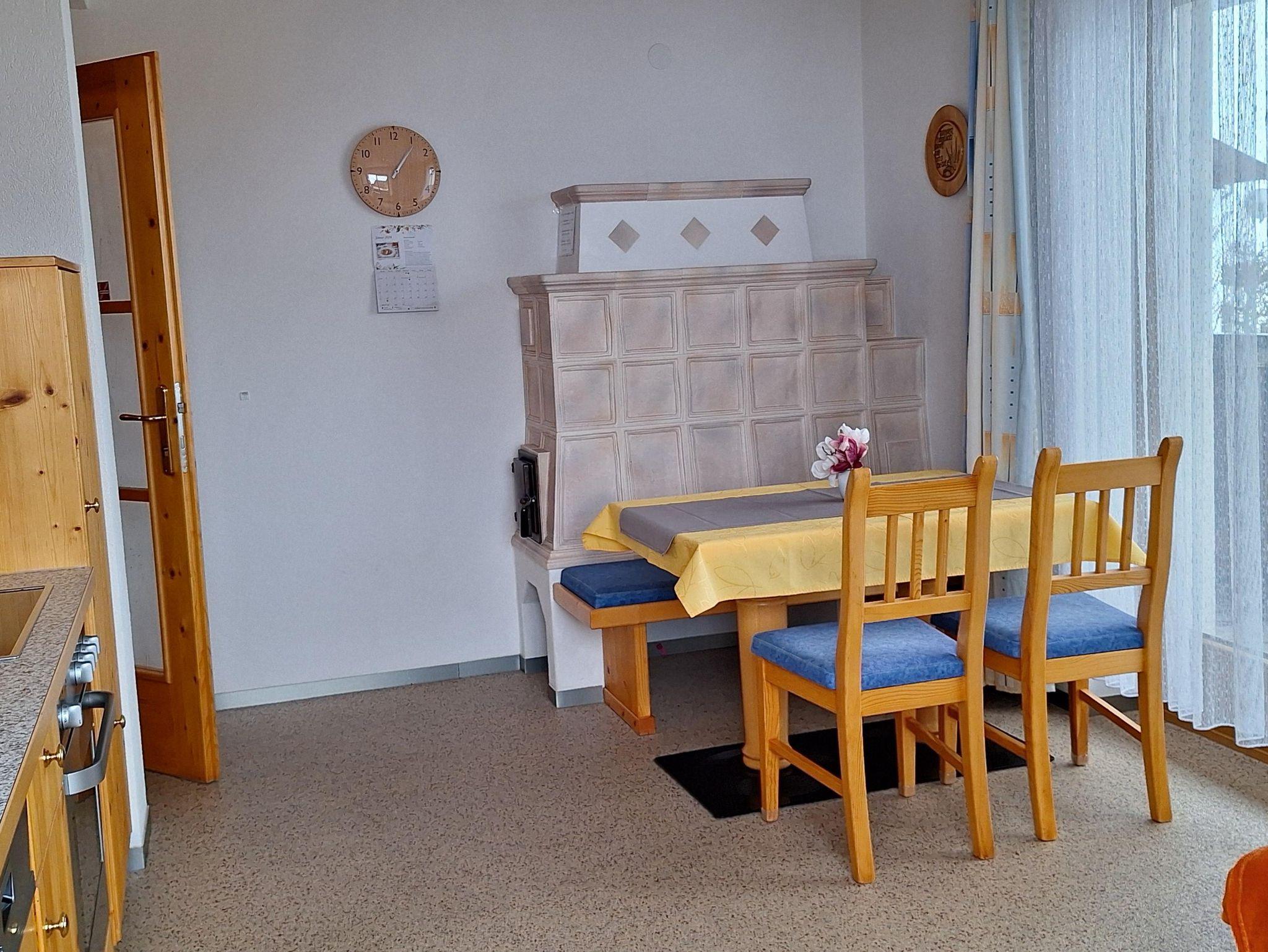 Der Wohnraum verfügt über einen modernen Küchenblock mit Geschirrspüler sowie eine gemütliche Essecke. Ein Kachelofen und eine bequeme Couch sorgen für wohnliche Atmosphäre.