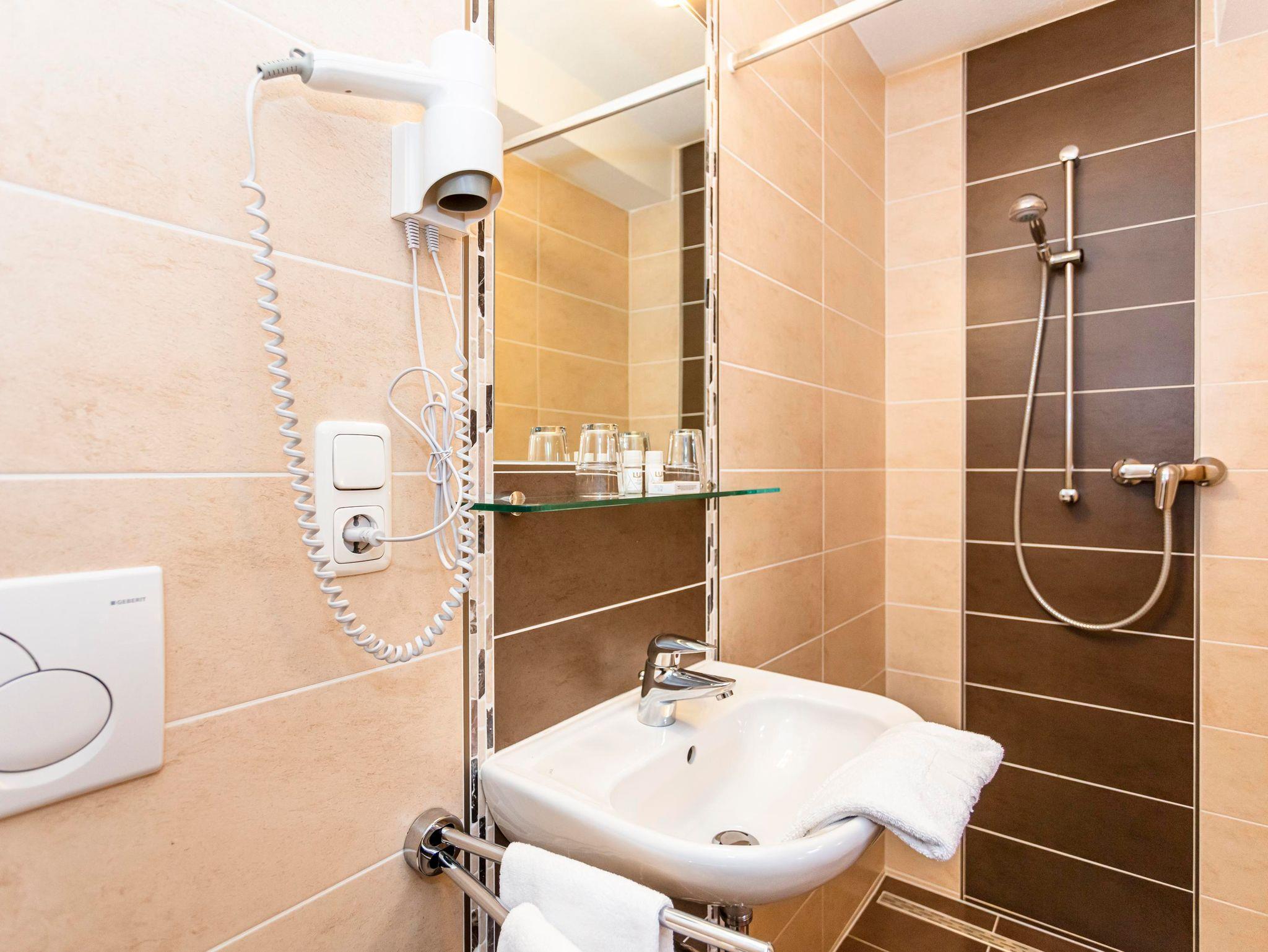 Dreibettzimmer mit Badezimmer mit Bad und WC. Kabel-TV, W-Lan und Balkon.