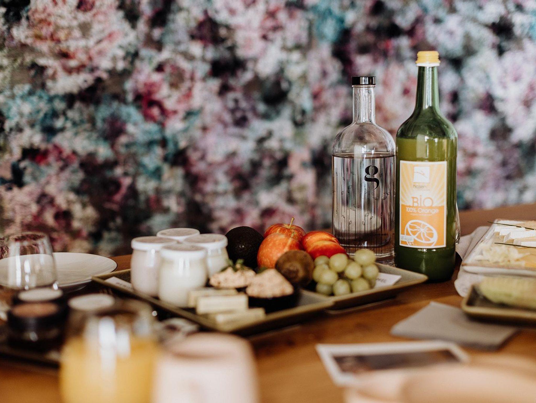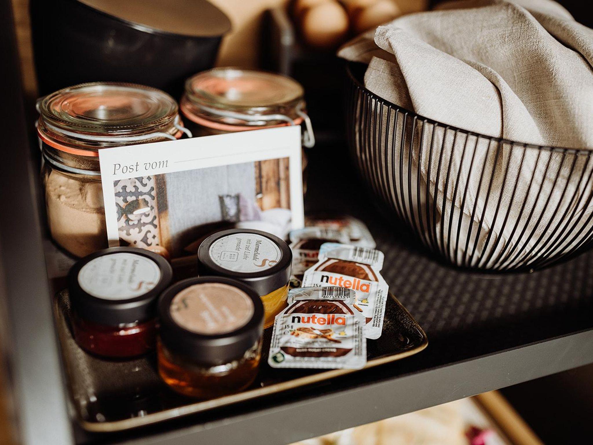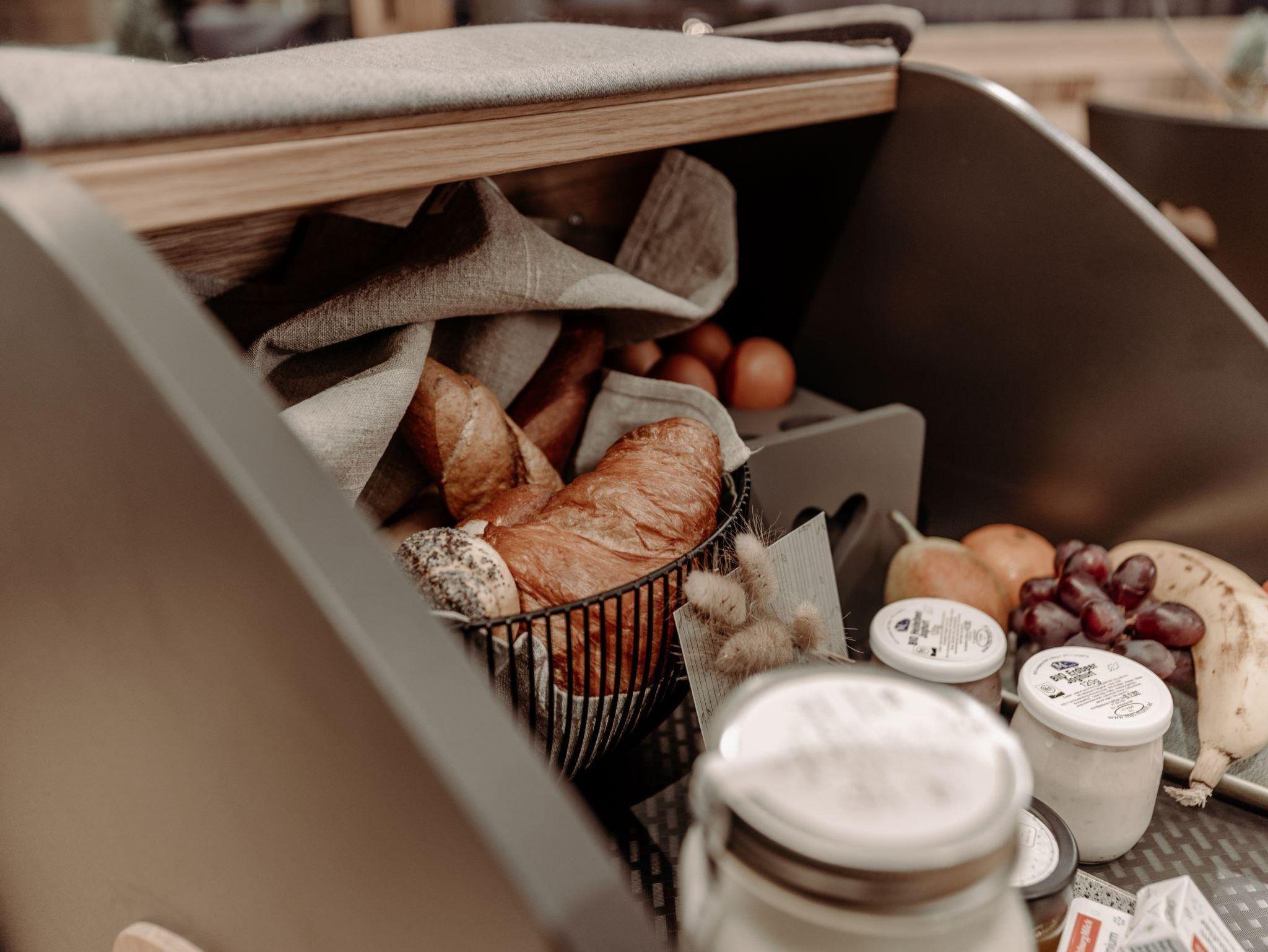 Für den perfekten Start in den Tag sorgt der Frühstücksservice. Eine reichhaltige Auswahl an Bio-Produkten wird direkt vor die eigene Türe geliefert. Ein Großteil der Köstlichkeiten stammt dabei aus eigener Bio-Produktion und das Frühstücksei direkt von Henriette und ihren Freundinnen.