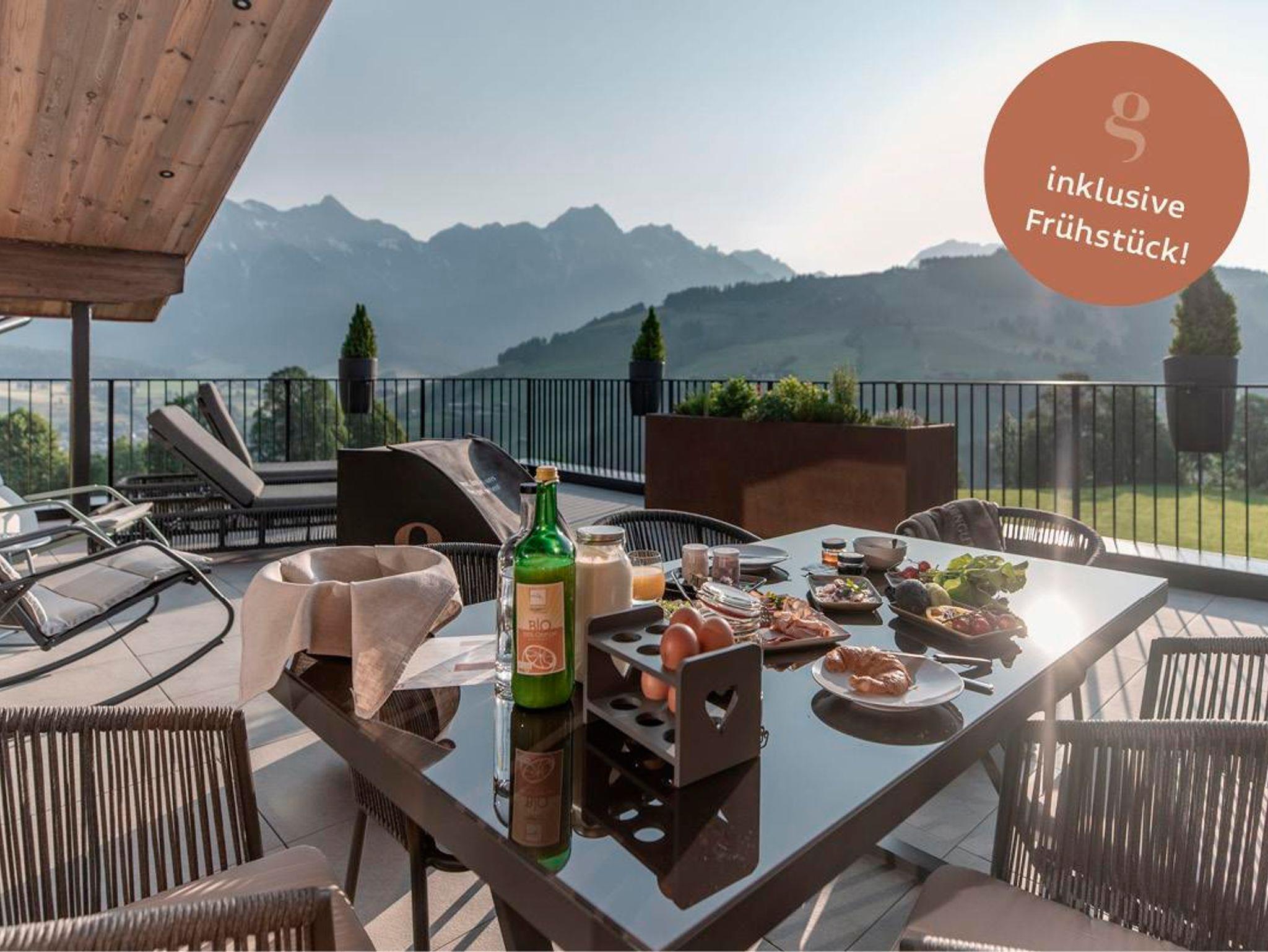 2 – 7 Personen, inklusive Frühstück in den Suiten Erholung und Genuss auf höchstem Niveau: Ein traumhafter Blick über die Region Hochkönig in der eigenen Panoramasauna warten in diesem Apartment im obersten Geschoss.