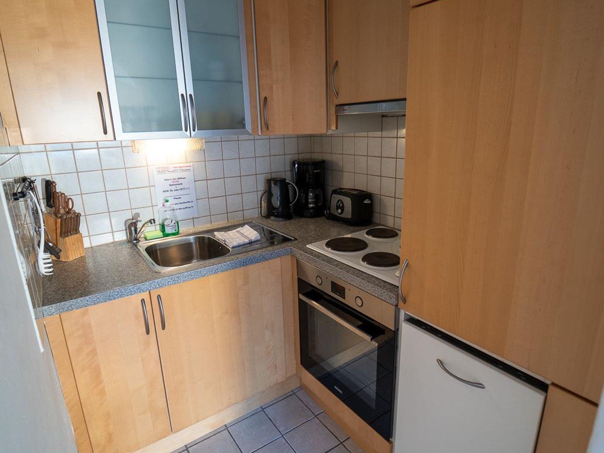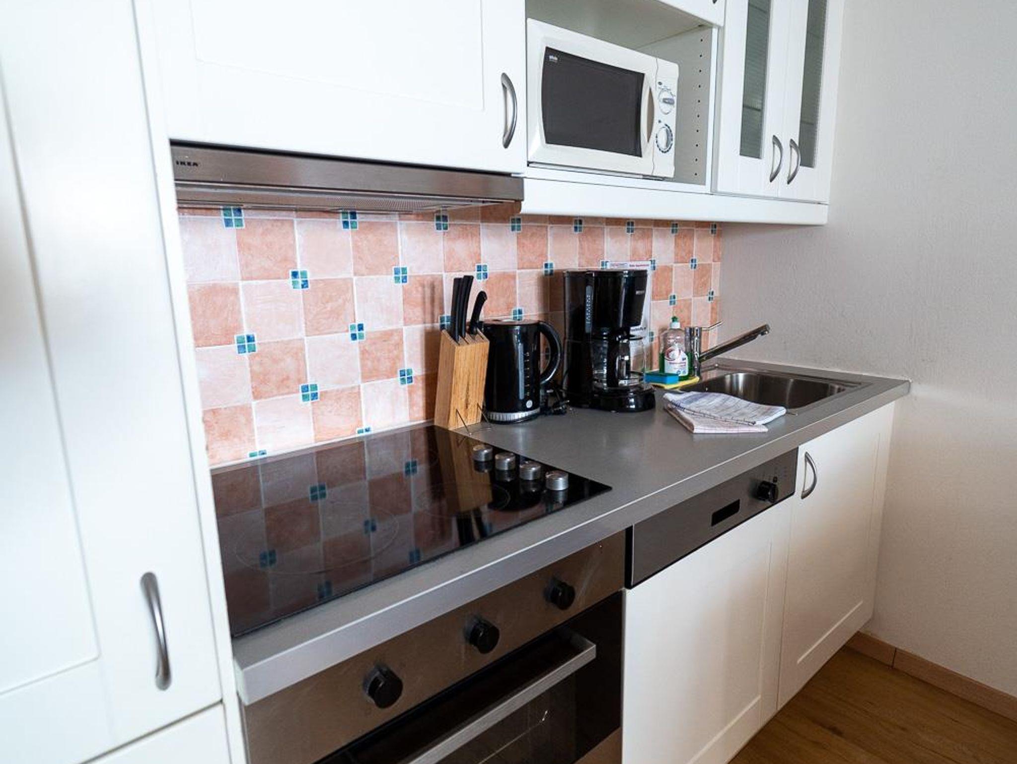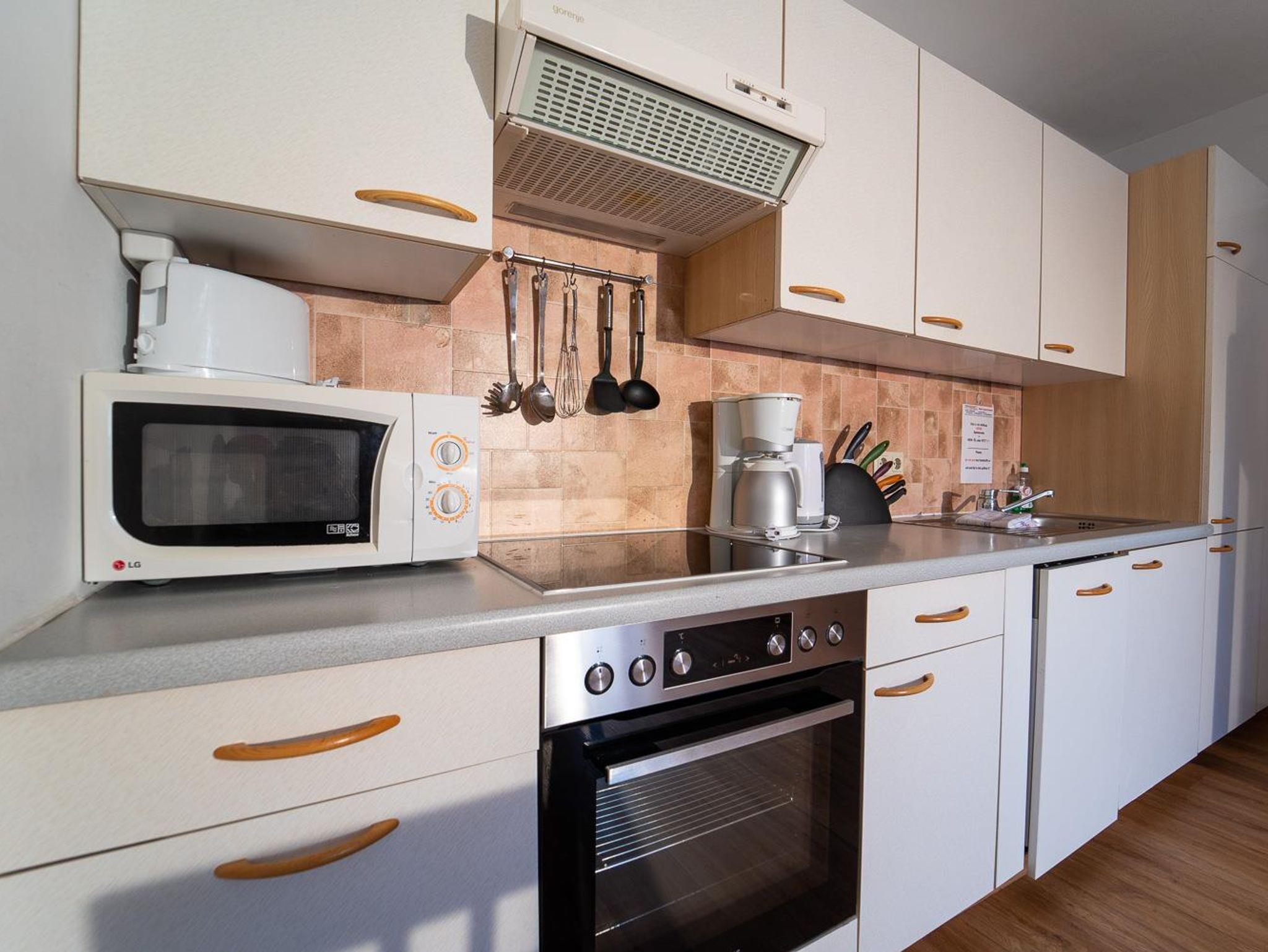 . voll ausgestattete Küche mit Geschirrspüler, 4 Ceranfeldern, Backrohr, Kühlschrank (teilw. mit Gefrierfach) sowie Mikrowelle, Kaffeemaschine, Wasserkocher und Toaster