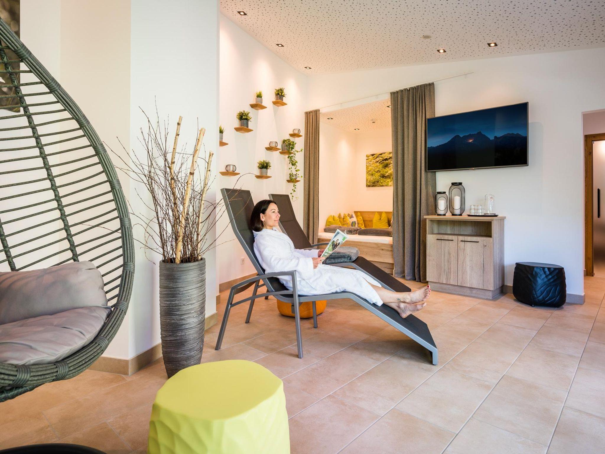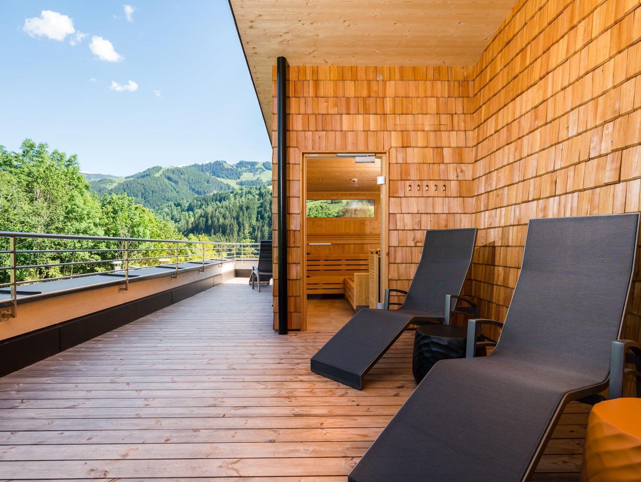 Der Wellnessbereich am Dach mit Panormasauna, Ruheliegen und Sonnenterrasse verspricht erholsame Momente.