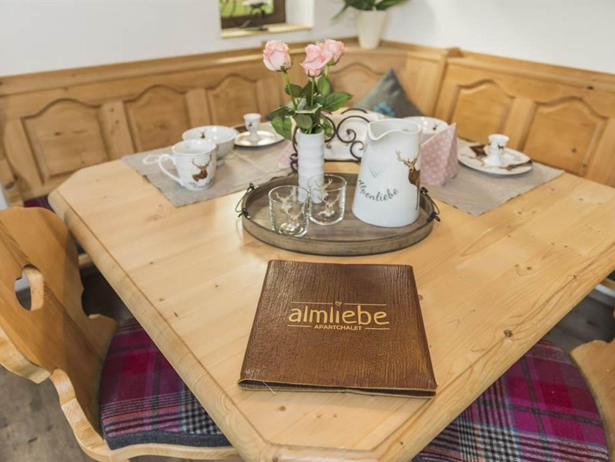 Das Apartchalet Almliebe verfügt über: - 2 Schlafzimmer mit modernen, hochkomfortablen Boxspringbetten und Flat-TV - Bad mit Dusche, Infrarotkabine, WC und Haarfön - Voll ausgestattete Küche mit rustikaler Sitzecke und Wohnzimmer mit offenem Kamin