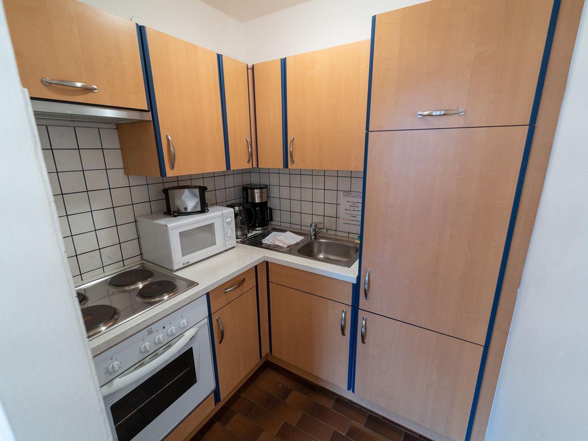 . voll ausgestattete Küche mit 4 Ceranfeldern, Backrohr, Kühlschrank mit Gefrierfach sowie Mikrowelle, Kaffeemaschine, Wasserkocher und Toaster