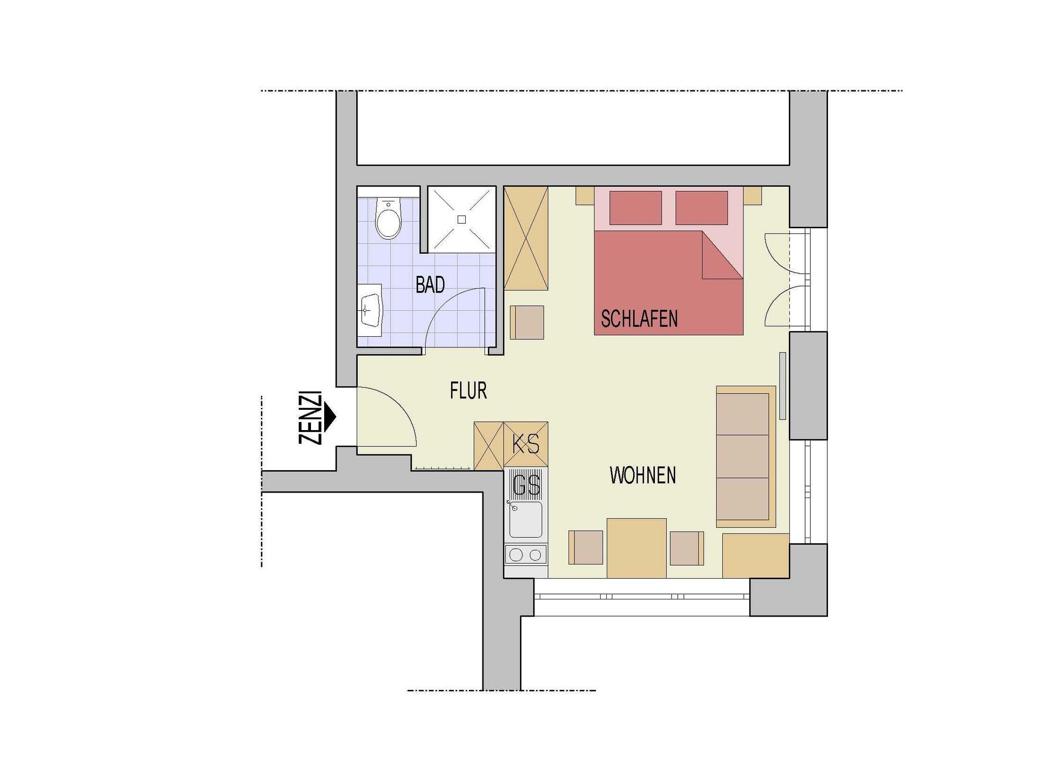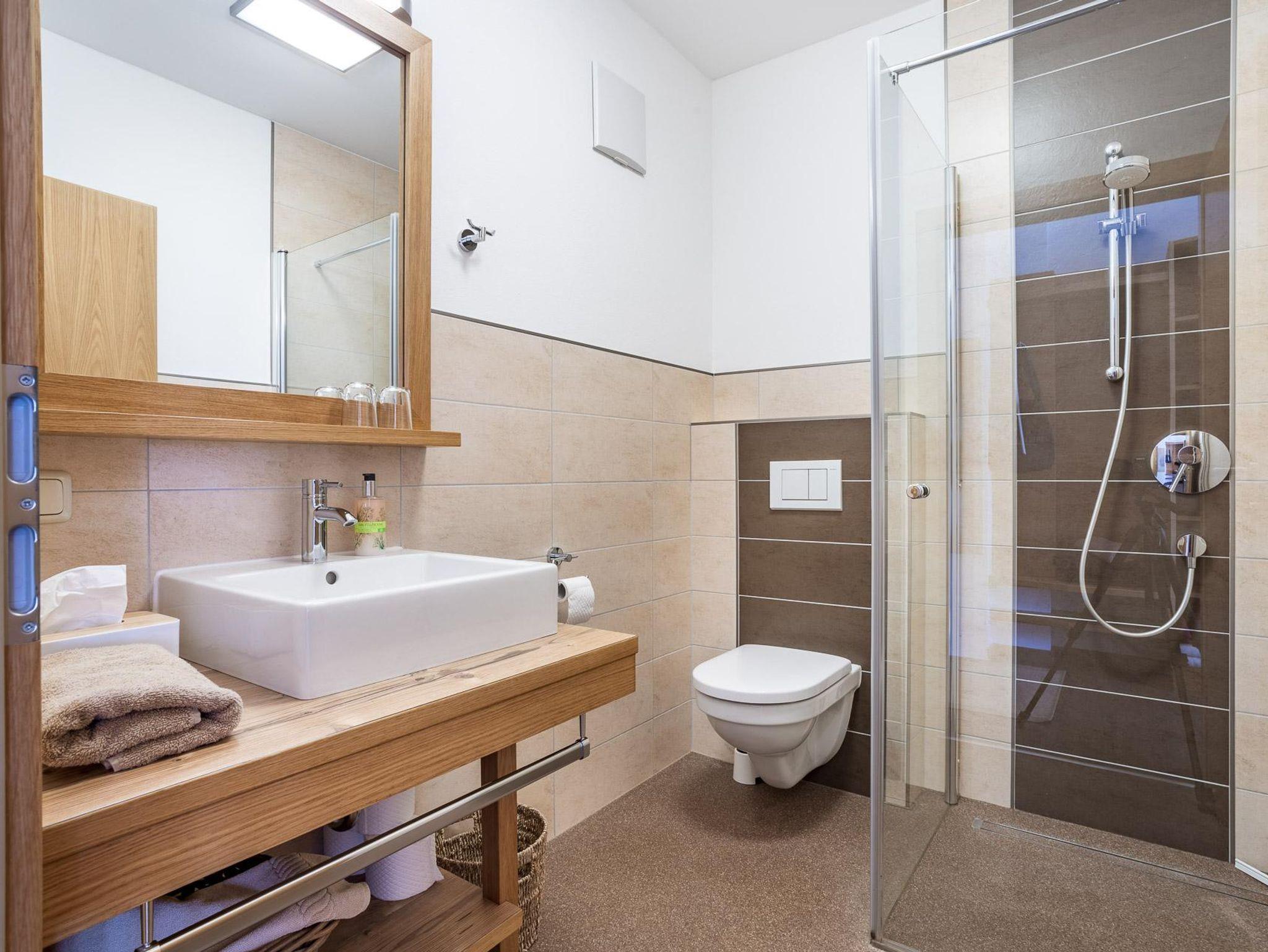 Das Apartment ist für max. 3 Personen gedacht. Es liegt im Erdgeschoss und hat einen direkten Zugang zum Garten. Es ist ausgestattet mit: Vorraum und Garderobe und Spiegel, Wohn-Schlafraum im alpinen Stil mit hochwertigen Möbeln, Doppelbett, Couch für eine dritte Person, Küchenzeile, Eßbereich mit Stühlen, Flachbildschirmfernseher mit Kabel-TV, Gratis Internet über WLAN; Bad mit Dusche und WC, Handtücher liegen für Sie bereit