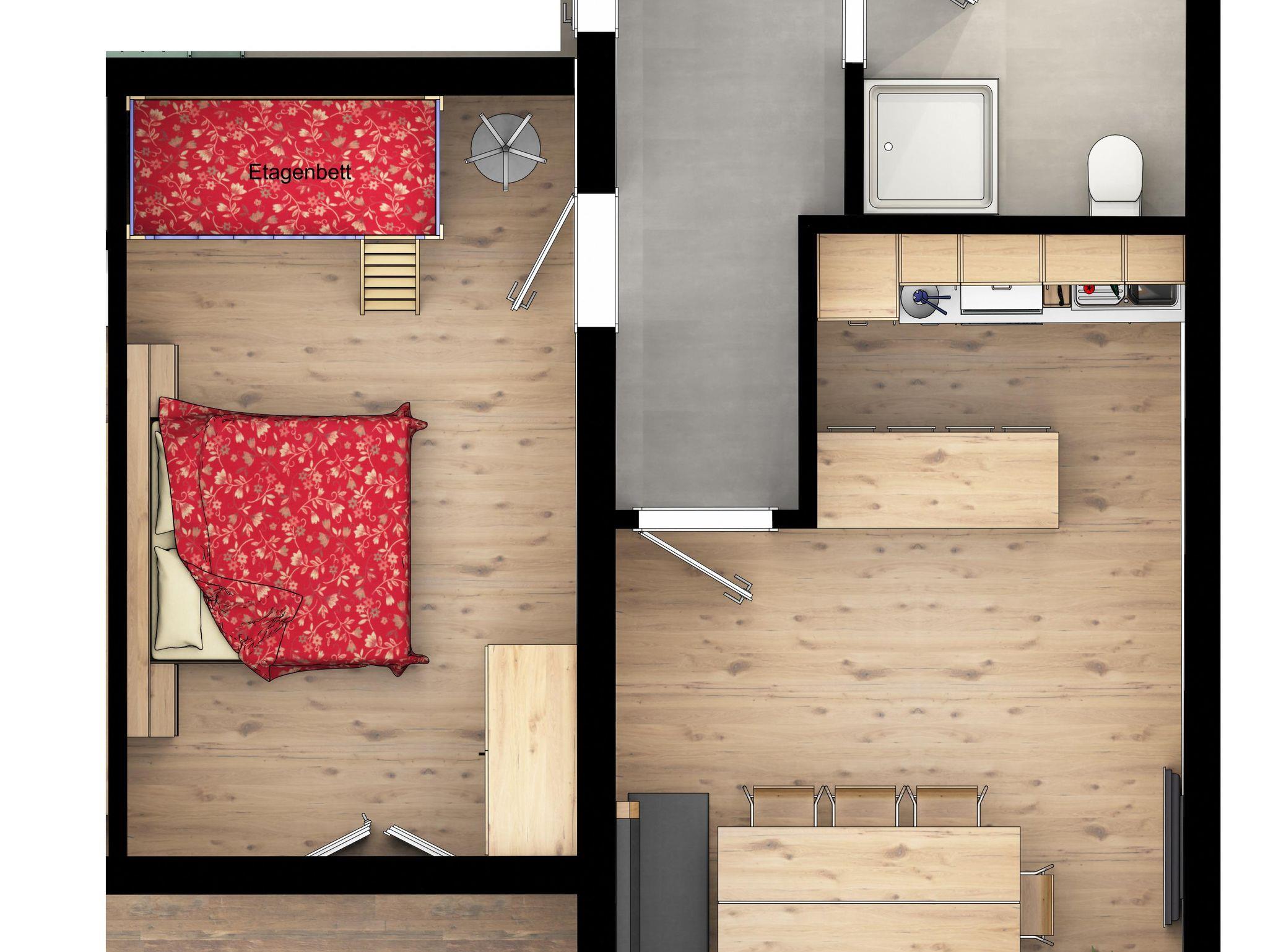 In der Wohnung befinden sich ein Schlafzimmer mit Doppelbett und einem Etagenbett (nur für kleine Kinder), ein geräumiger Wohn- und Essbereich mit großem Tisch und Kabel-TV, eine gut ausgestatteter Küche und ein Badezimmer mit Dusche und WC. Vom Schlafzimmer gelangen Sie außerdem auf den großen, sonnigen Balkon mit toller Aussicht auf den Natrun.