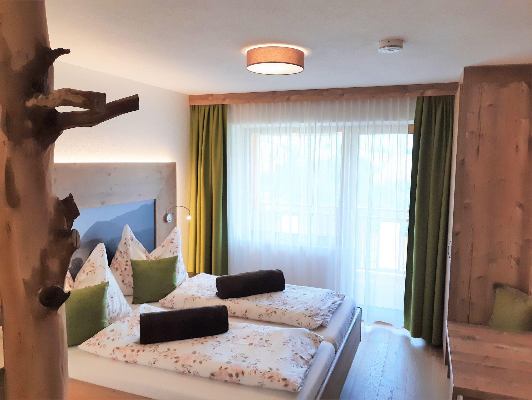 Das Doppelzimmer Morgensonne verfügt über ein großes Doppelbett sowie eine rustikal-moderne Ausstattung. Durch das moderne Badkonzept ist der Sanitärbereich optimal ins Zimmer integriert. Darin befindet sich eine Dusche, ein Waschplatz sowie die Toilette. Hand- sowie Duschtücher liegen für Sie bereit. Der große Balkon lädt mit den gemütlichen Balkonmöbeln zum Verweilen ein. Die wunderschöne Aussicht zur Lindaumauer, in ruhiger Lage, lässt viele entspannte Momente zu.