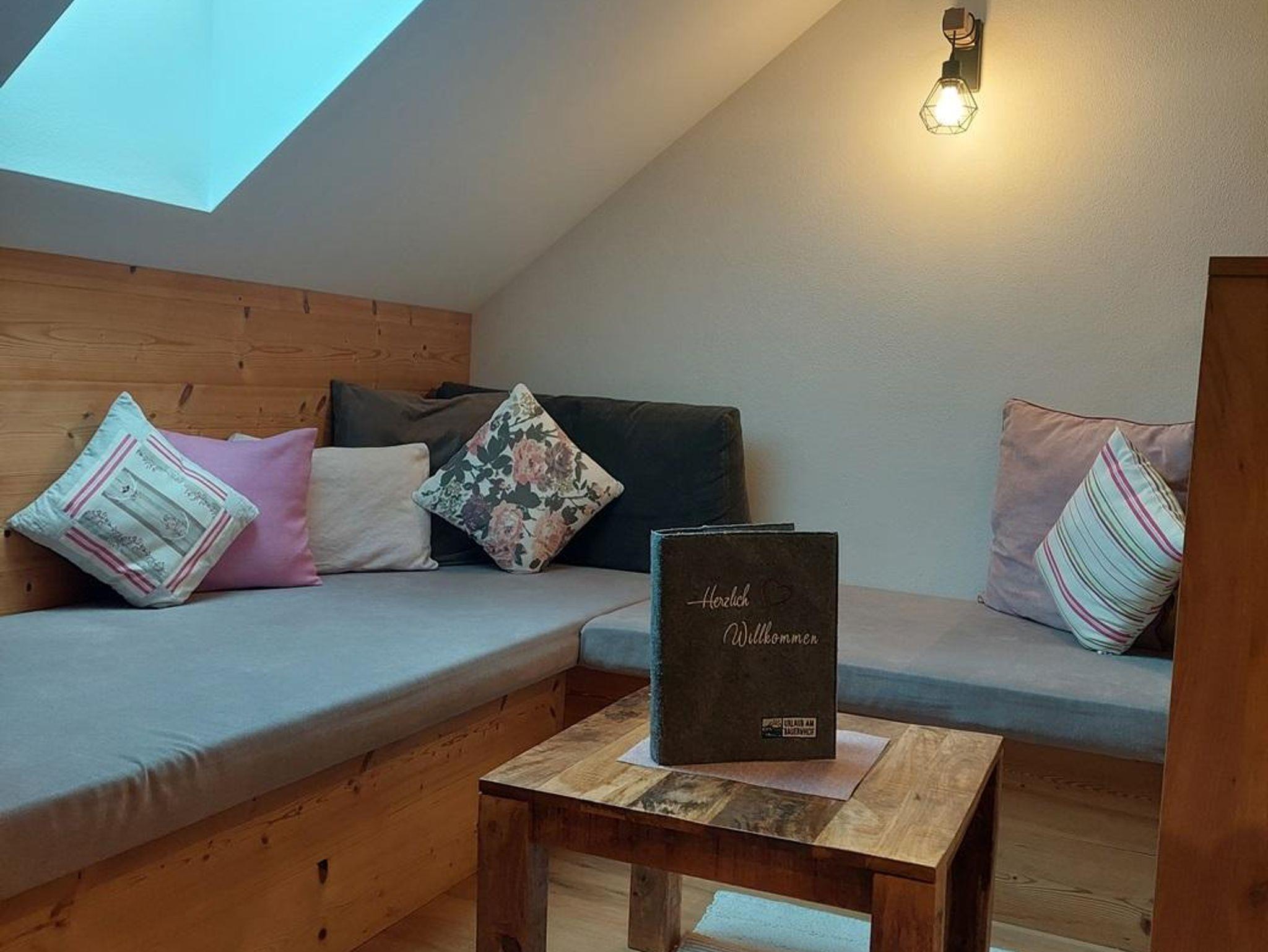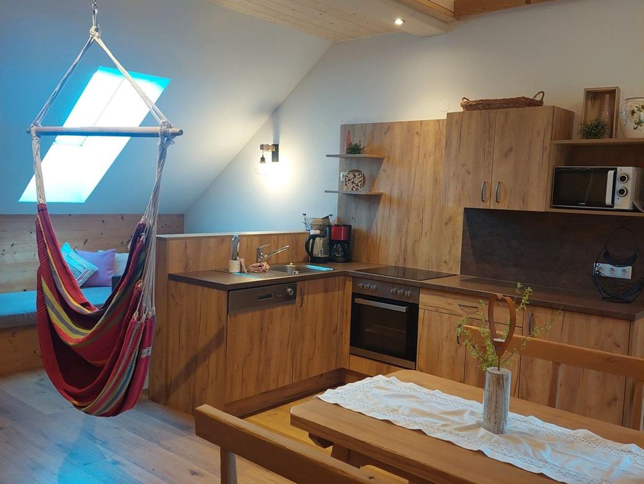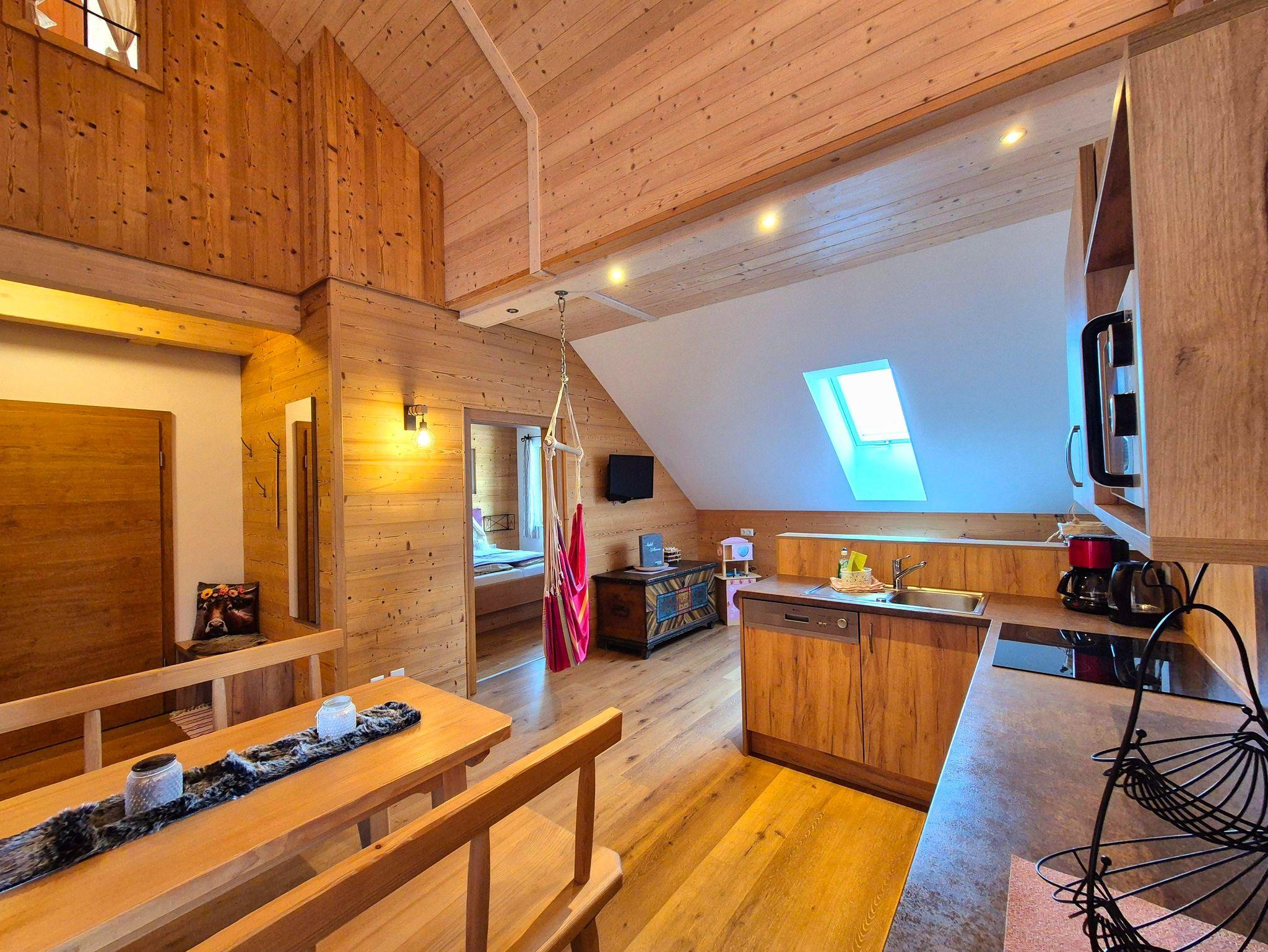 Die mit viel hochwertigem Vollholz eingerichtete Ferienwohnung bietet 2 getrennte Schlafbereiche auf zwei Ebenen und ein Badezimmer mit Dusche/WC, Haarföhn und Kosmetikspiegel. Die vollausgestattete Küchenzeile mit Ceranfeld, Backrohr, Kühlschrank mit Tiefkühlfach, Mikrowelle, Spüle, Geschirrspüler, Filterkaffeemaschine und Wasserkocher ermöglicht alle kulinarischen Erlebnisse. Der gemütliche Wohnbereich mit großer Couch, Sat-TV und Terrasse bietet Entspannung pur.