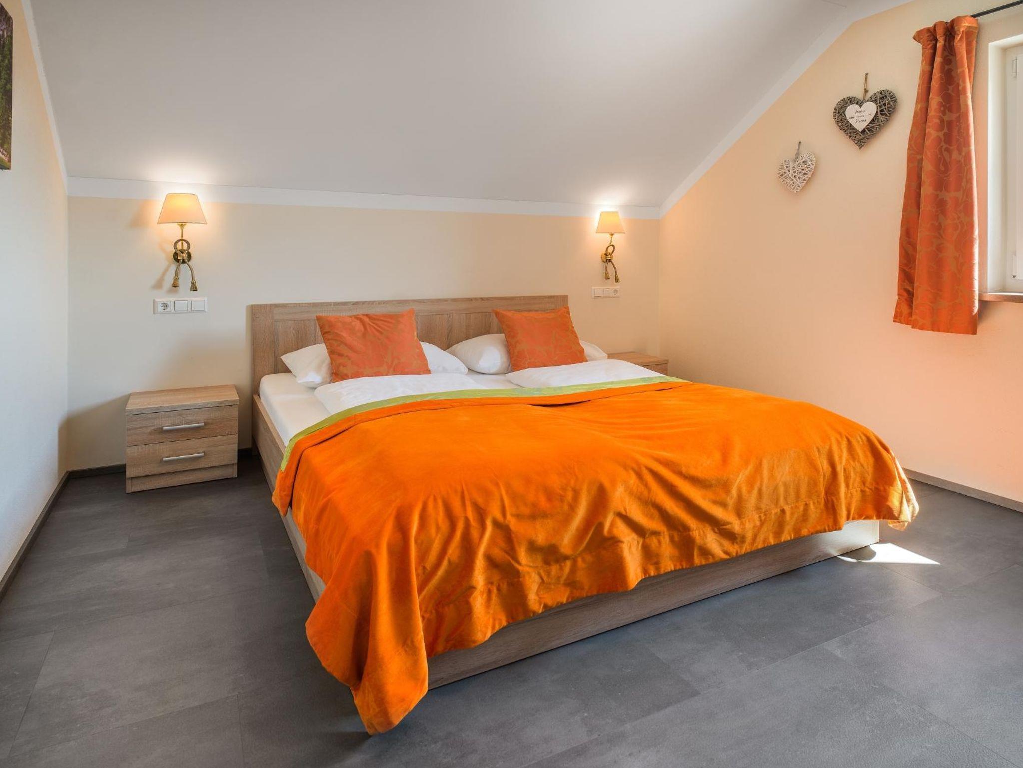 Das Appartement ist ca. 80 qm groß und bietet 2 große Schlafzimmer, ein Bad mit Dusche und WC, ein separates WC sowie eine voll ausgestattete Wohnküche mit Ausziehcouch, Abstellraum und einen Balkon oder Terrasse zum Entspannen.
