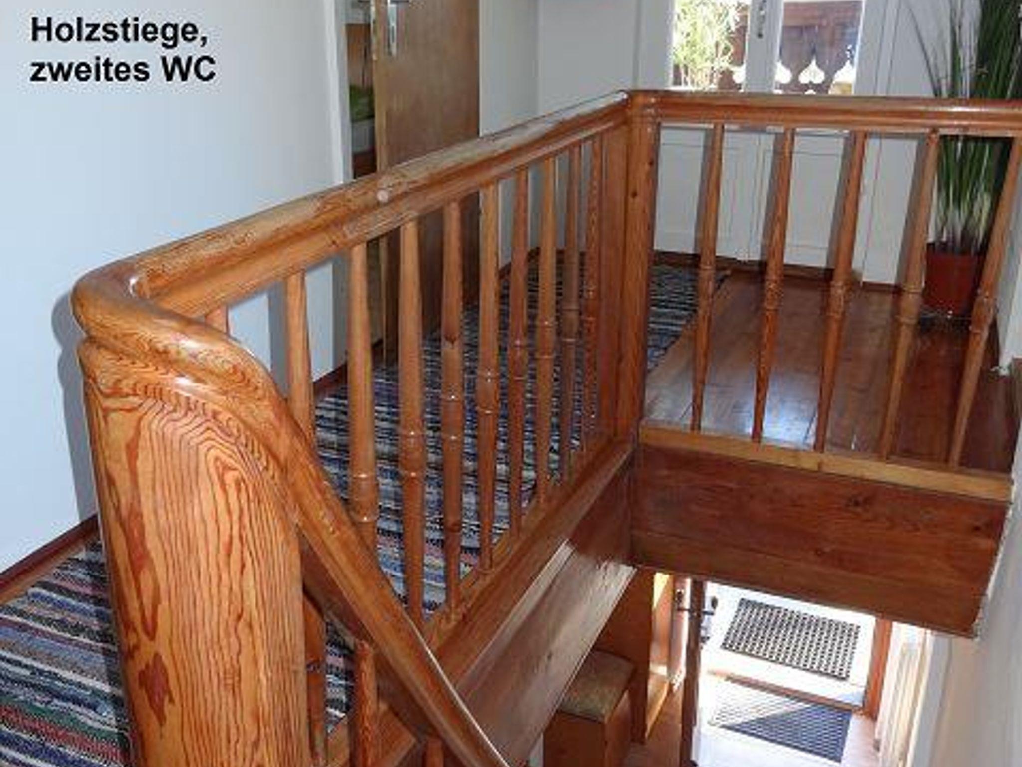 Im Obergeschoß sind die Schlafräume (das große Zimmer mit Doppelbett und Couch, das Sonnenzimmer mit Doppelbett und zwei extra Betten im Nebenraum) und ein separates WC. Auch ein gemütlicher überdachter Balkon mit Sitzmöglichkeit befindet sich im Obergeschoß.