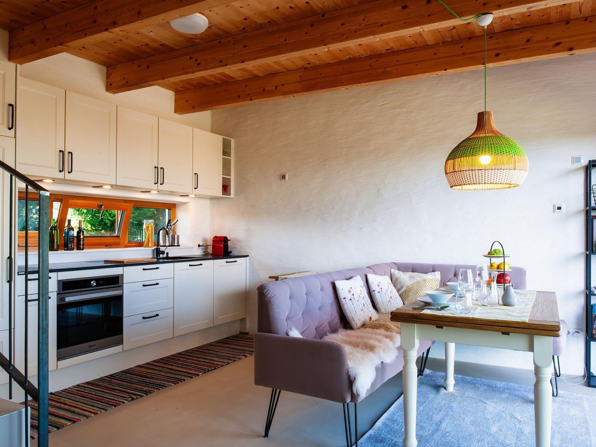 Das Ferienhaus, das Maschansker bietet Genuss auf drei Etagen. Im Erdgeschoß befindet sich der geräumige Schlaf- und Wohraum mit dirketem zugang zur großzügigen Sonnenterasse. Die Inneneinrichtung ist gewissenhaft mit der Architektur des Gebäudes abgestimmt. Für die richtige Stimmung oder Temperatur kann der Holzofen eingeheizt werden. Weiters befindet sich im Erdgeschoß die modern designte Landhausküche und der lichtdurchflutete Essbereich.