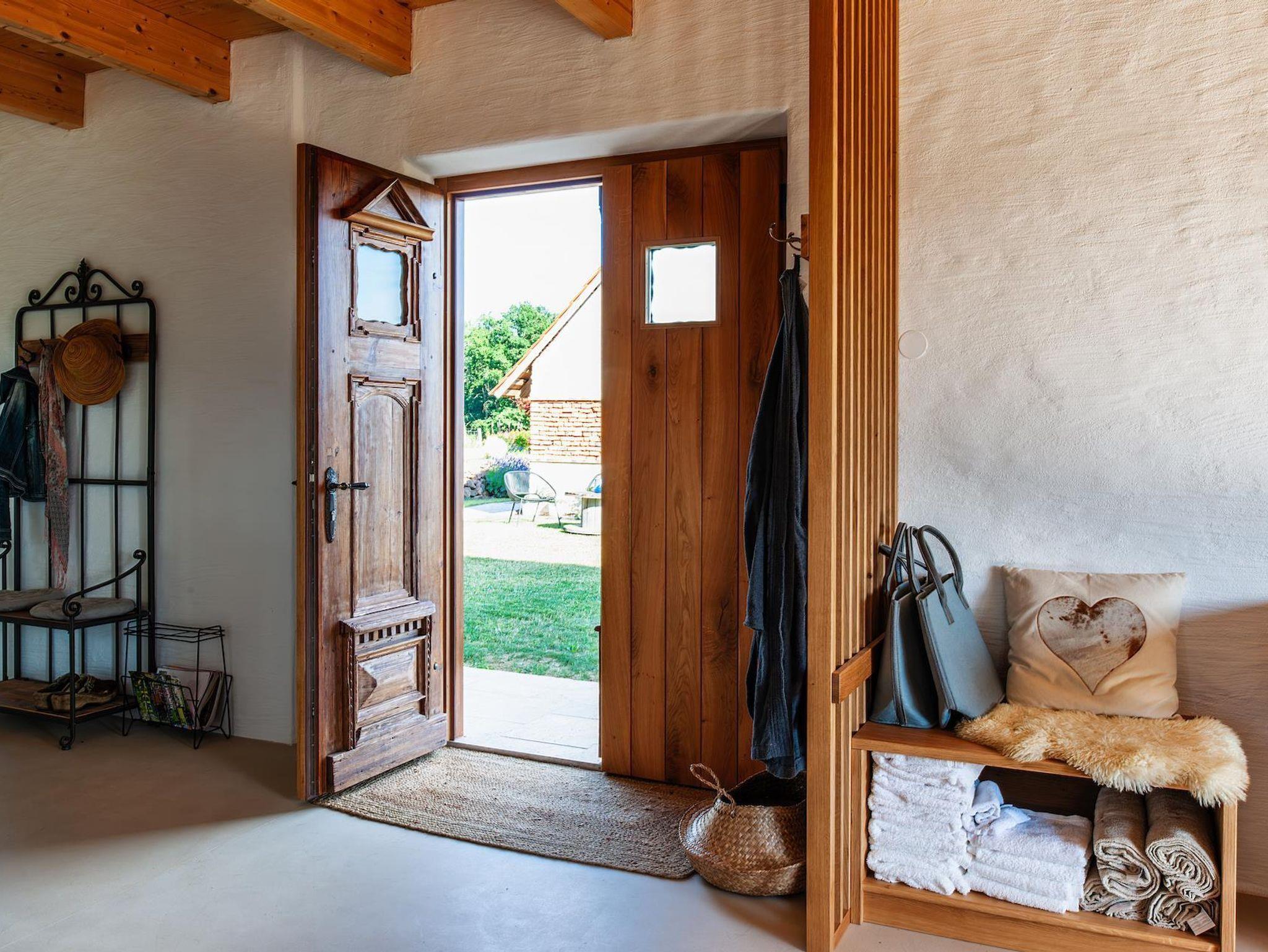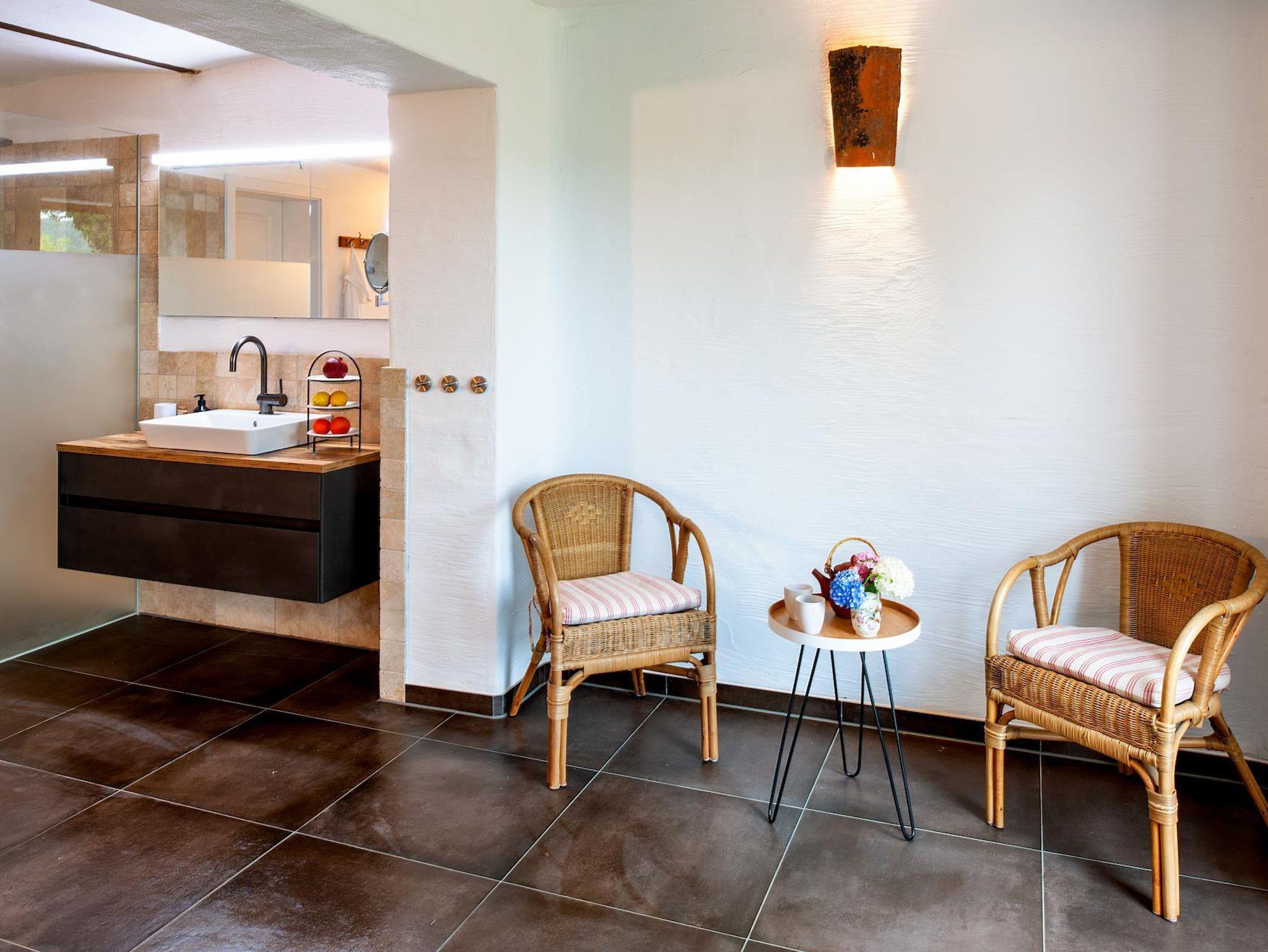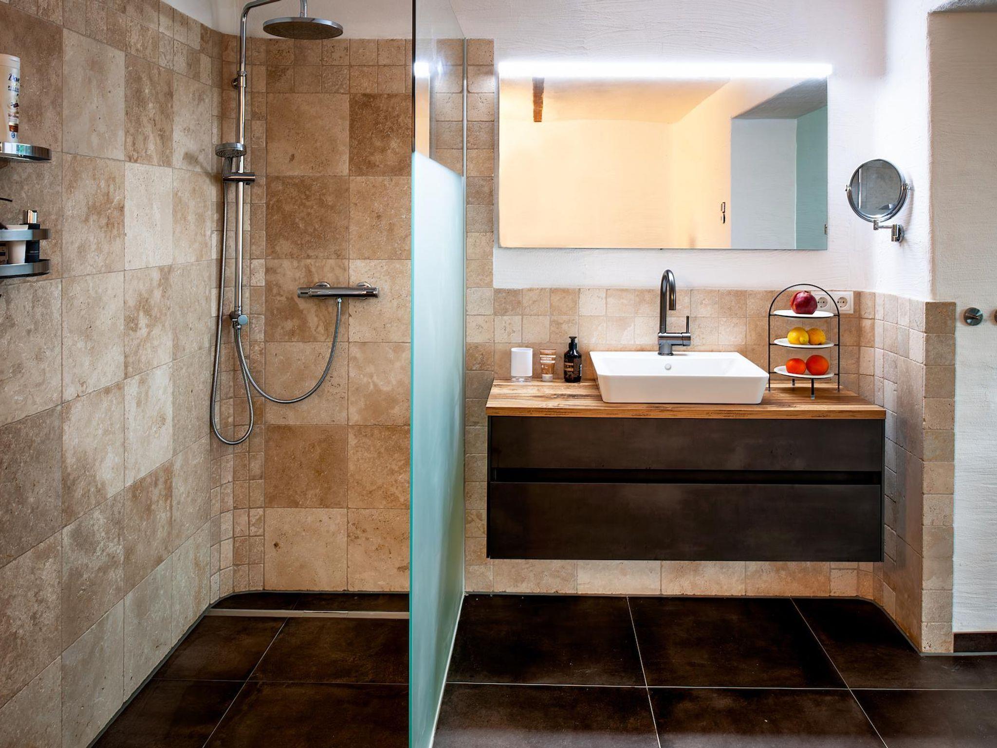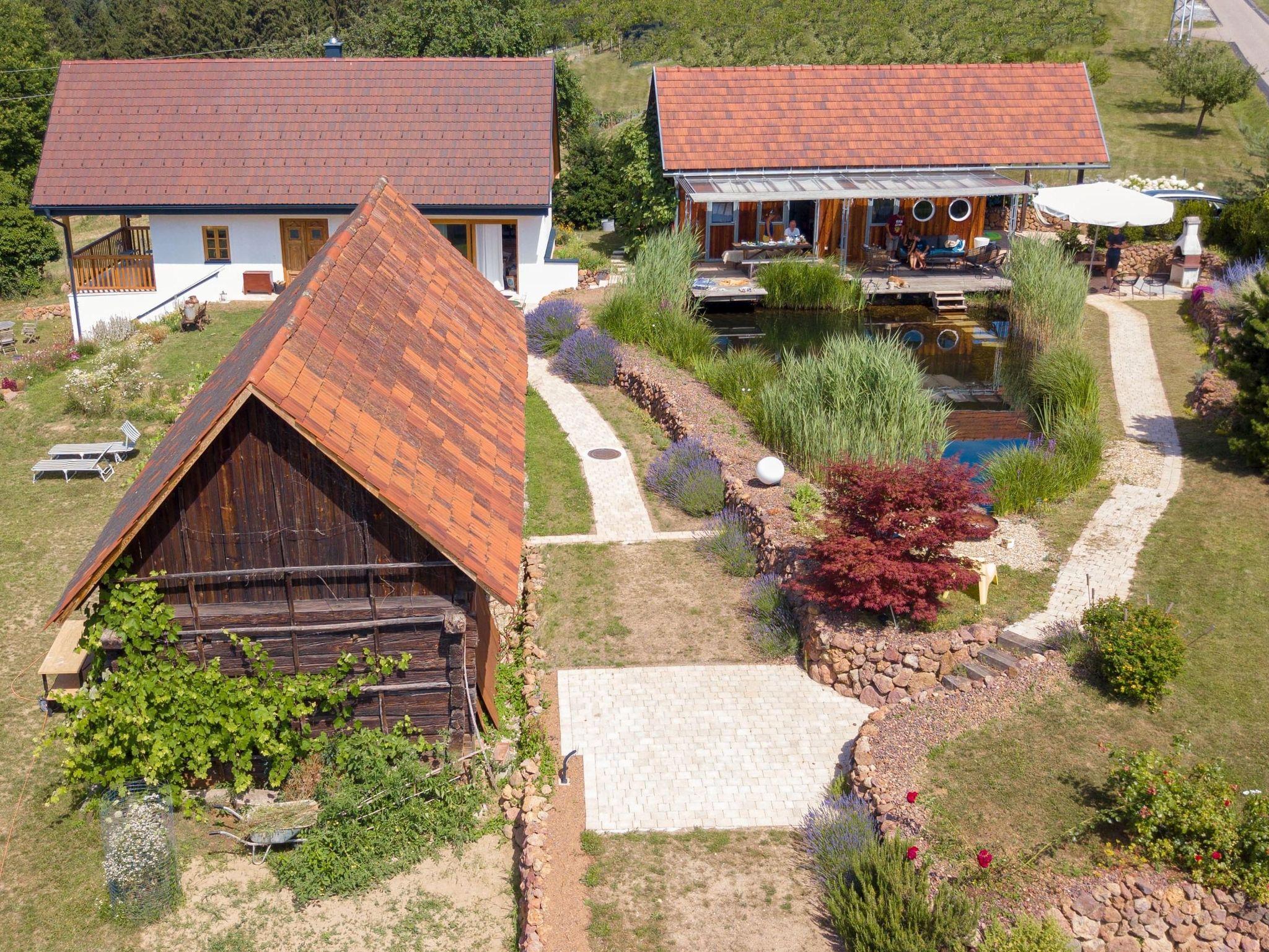 Im Untergeschoß des Hauses erwartet Sie der Wellnessbereich, inklusive des gemütlichen Ruheraums und der Regendusche. Das Herzstück des Wohlfühlbereichs ist die geräumige Sauna (verfügbar ab Herbst 2021) mit Ausblick auf die steilen Obstwiesen. Nach dem Saunagang ist für erlebnisfrohe Gäste der Badeteich nur einen Katzensprung entfernt. Außerdem befindet sich hier im Untergeschoß die hauseigene Weintheke mit ausgewählten Weinen der Region.