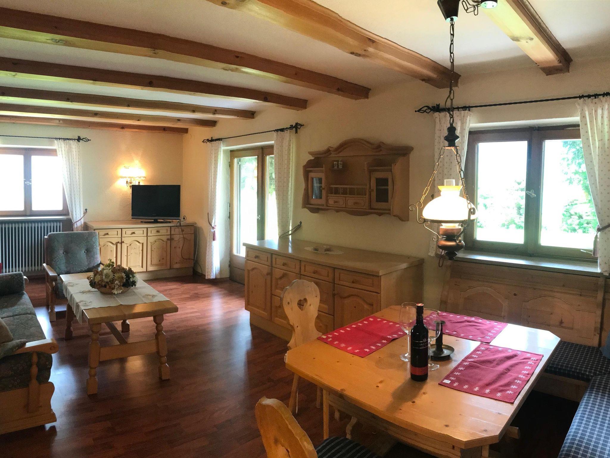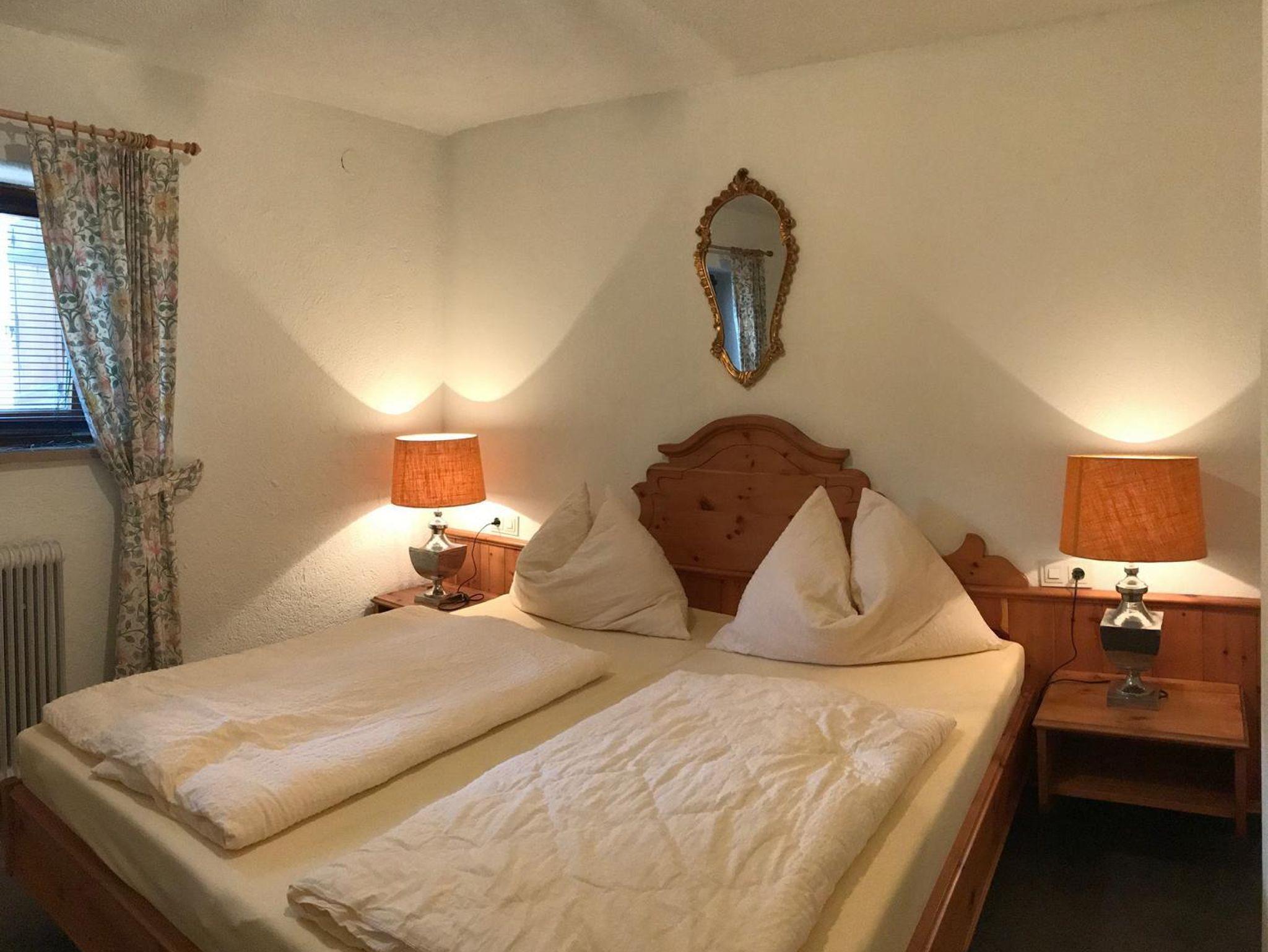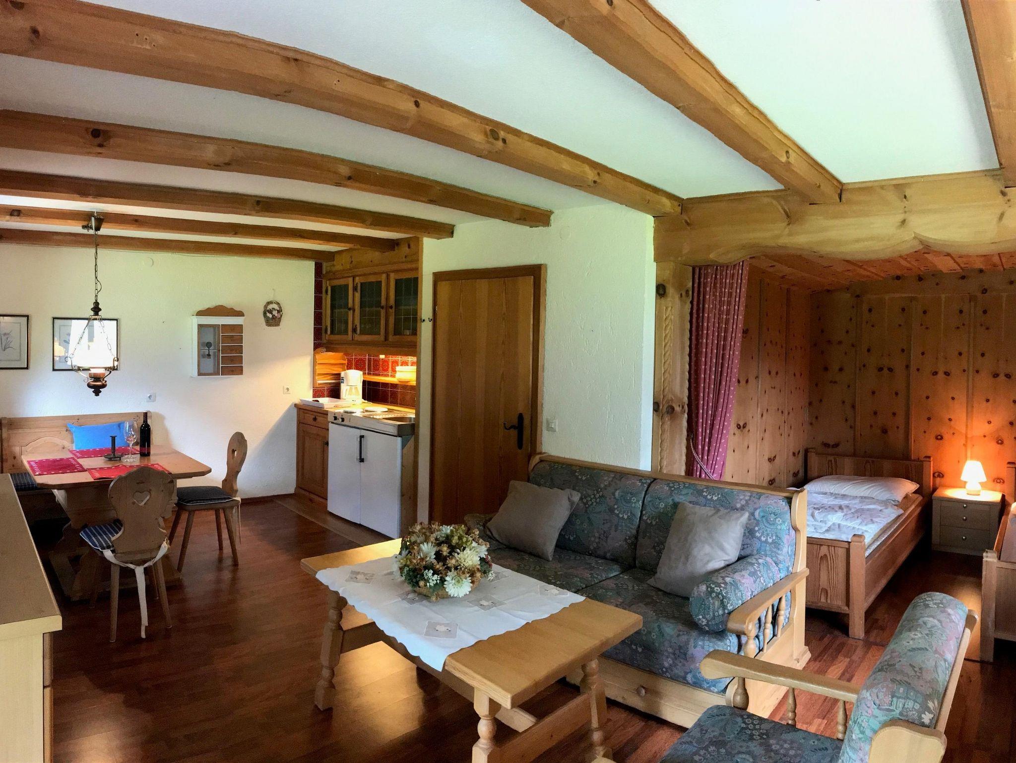 Ein 1-Zimmer-Apartment mit Wohnzimmer und großer Schlafnische mit 2 Betten 100/200. Mit Zirbenholz vertäfelt. Couch- und Essecke, kleine Küchenzeile komplett ausgestattet. Vorraum mit 2 Kleiderkästen, Bad mit Wanne und Toilette, TV mit Kabelanschluss. WLAN kostenfrei, Gartenterrasse und Panoramablick zum Seegeschehen.