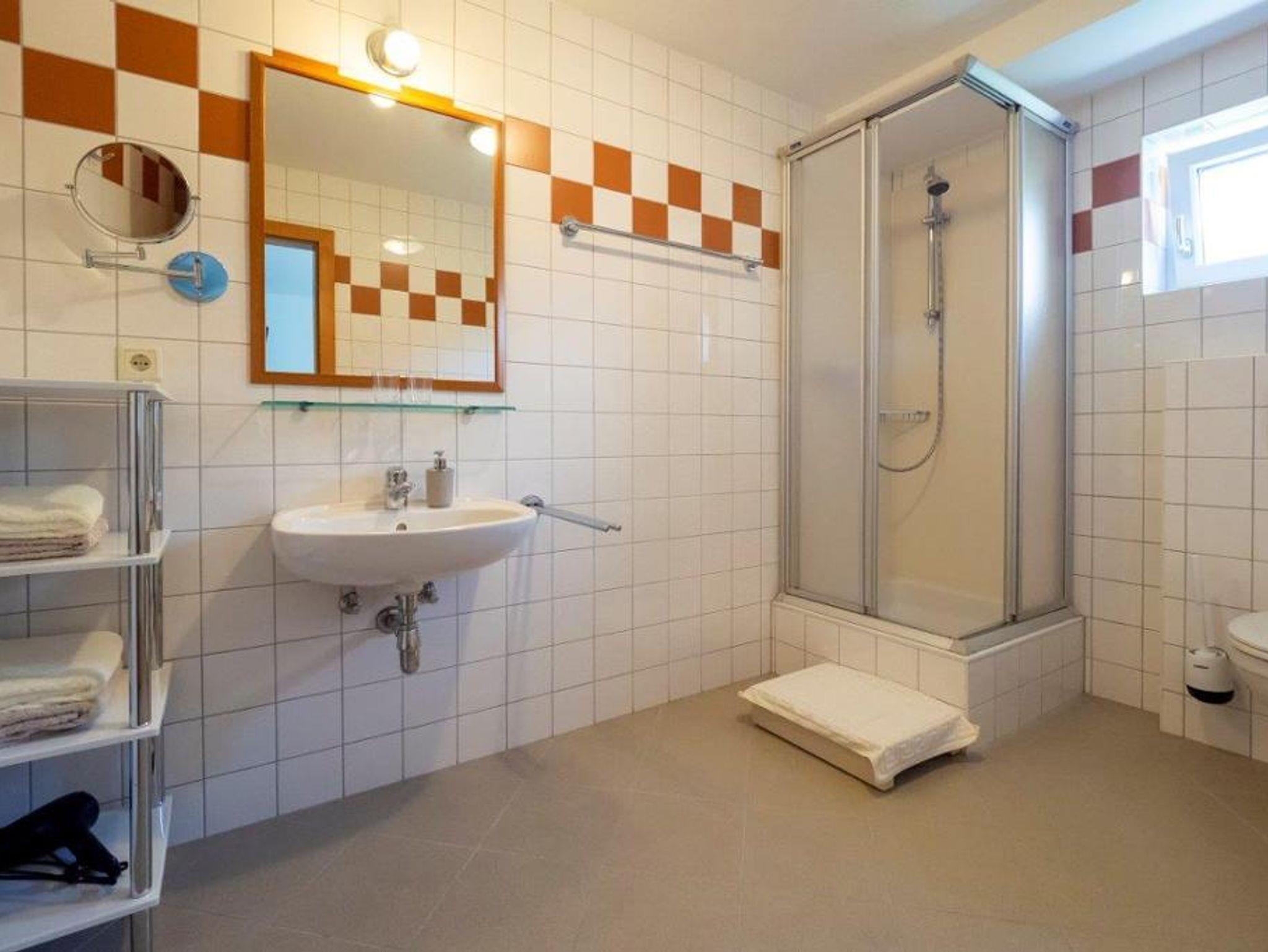 Das Badezimmer mit Dusche, WC und Haarföhn. Es ist auch möglich ein Zusatzbett auszustellen.