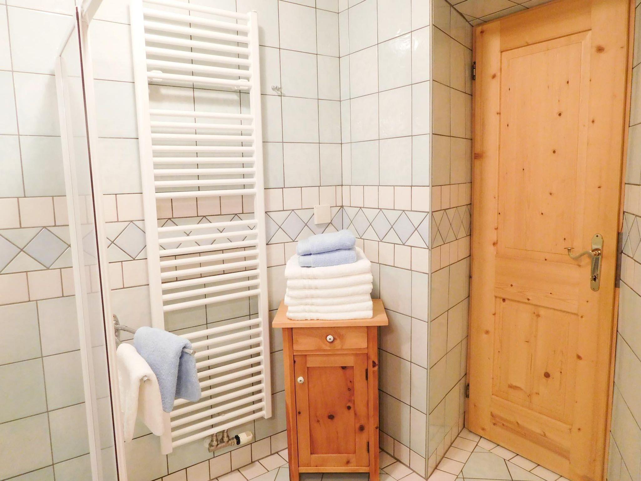 Warmes Badezimmer mit Dusche/WC, Haarfön, Bodenheizung u. Handtuchtrockner. Genügend flauschige Hand-u.Badetücher.
