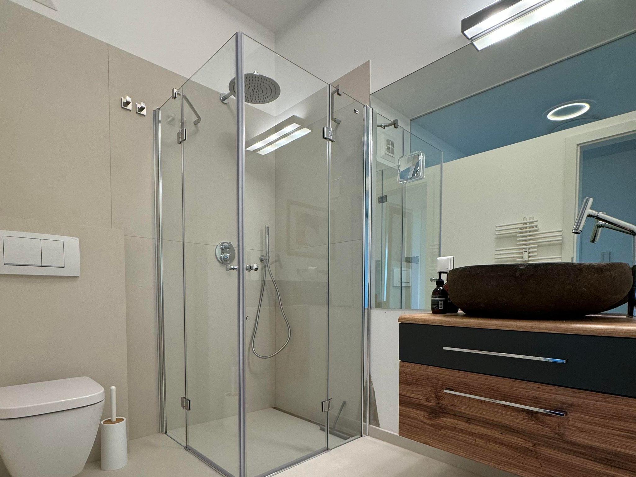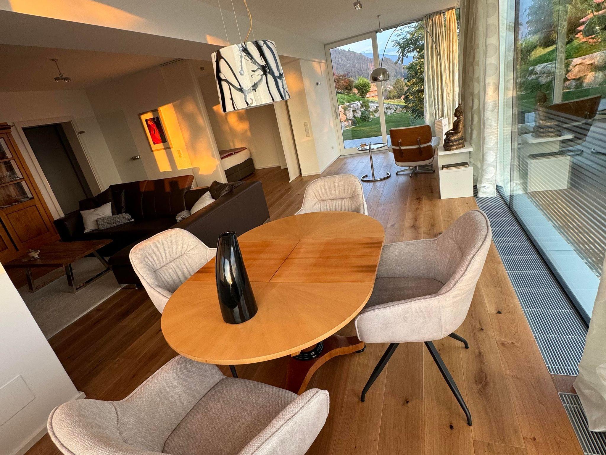 Auf dem sonnigen Hochplateau, auf ca. 980 Metern Seehöhe, erwartet Sie eine Aussicht auf den Millstätter See sowie ein Bergpanorama von den Julischen und Karnischen Alpen bis hin zur Kreuzeckgruppe und dem Mölltal. Diese Fernsicht und gleichzeitig die Weite werden Sie begeistern. Die separate Wohnung befindet sich im Hochparterre einer weißen Villa in absoluter Ruhelage. Das Apartment besticht durch eine komplette Glasfront aus rahmenlosen Fenstern, die einem das Gefühl vermittelt, selbst zu einem Teil der Natur und des dazugehörigen Gartens zu verschmelzen.