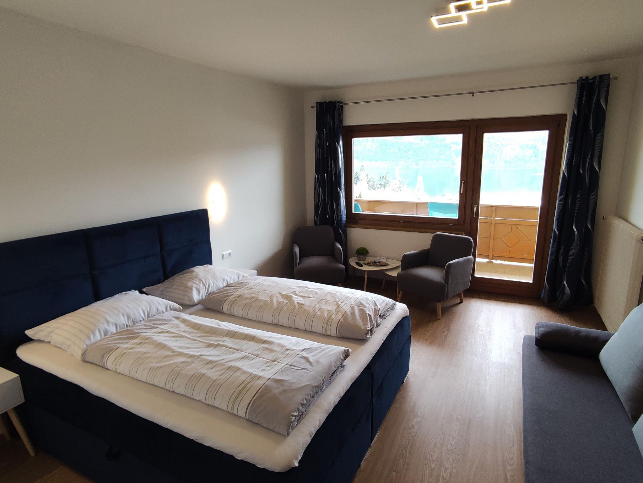 Ein fantastischer Fernblick von über 25 km über See und zu den Bergen der Reiseckgruppe und den Hohen Tauern bietet sich von unseren sehr gut ausgestatteten Balkon- und Terrassenzimmern.