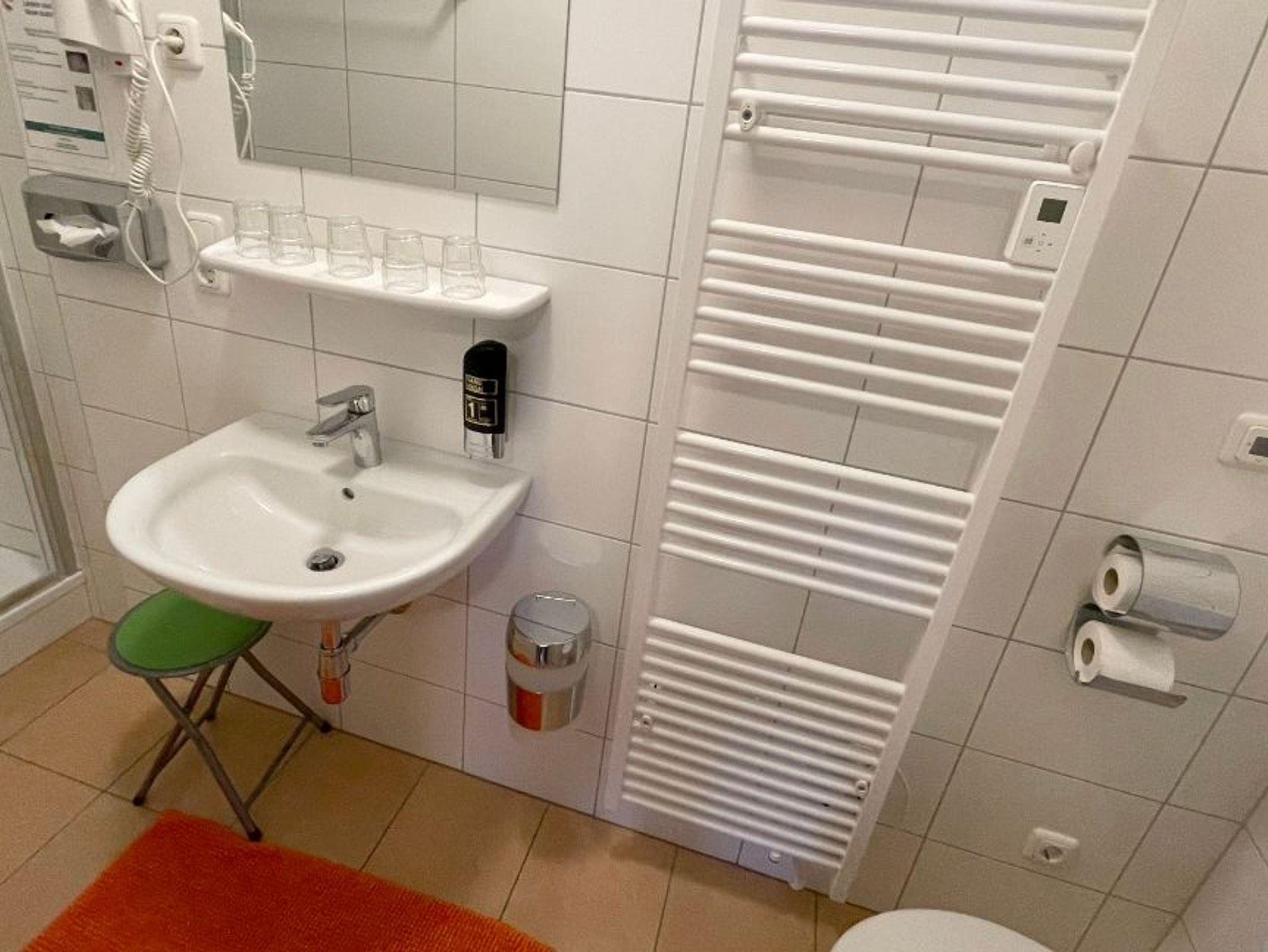 Das Zimmer besitzt 2 Schlafräume: Ein Raum mit Doppelbett, Kühlschrank, Sitzecke und der zweite Raum mit Einzelbett, Stockbett, Schrank. Das Badezimmer ist durch das zweite Zimmer erreichbar, dieses ist mit Dusche, Waschbecken, WC, Föhn und Badeartikel ausgestattet. Das Zimmer liegt auf der Ost/Südseite.